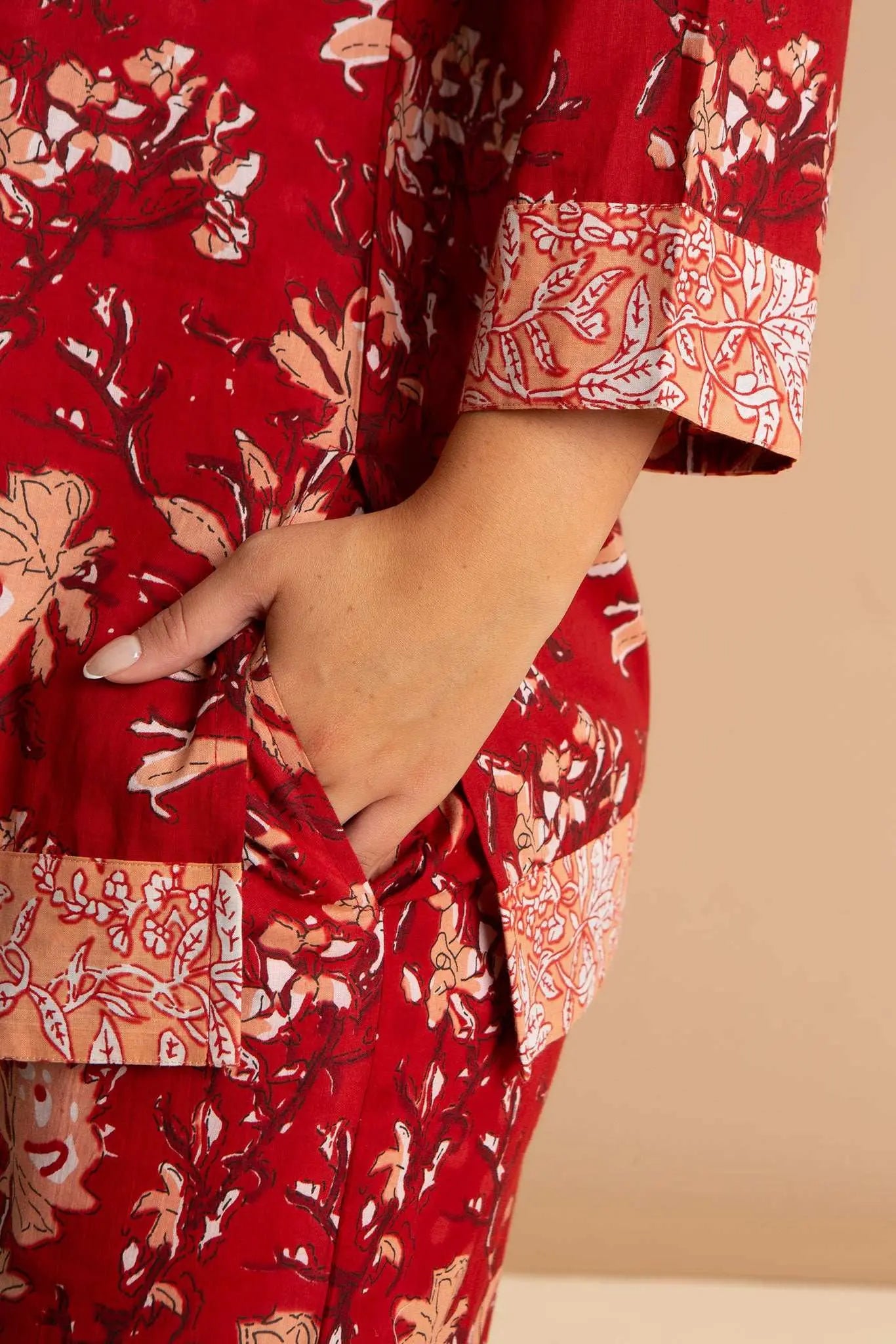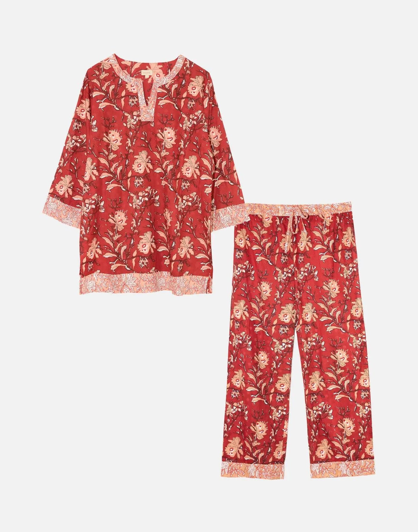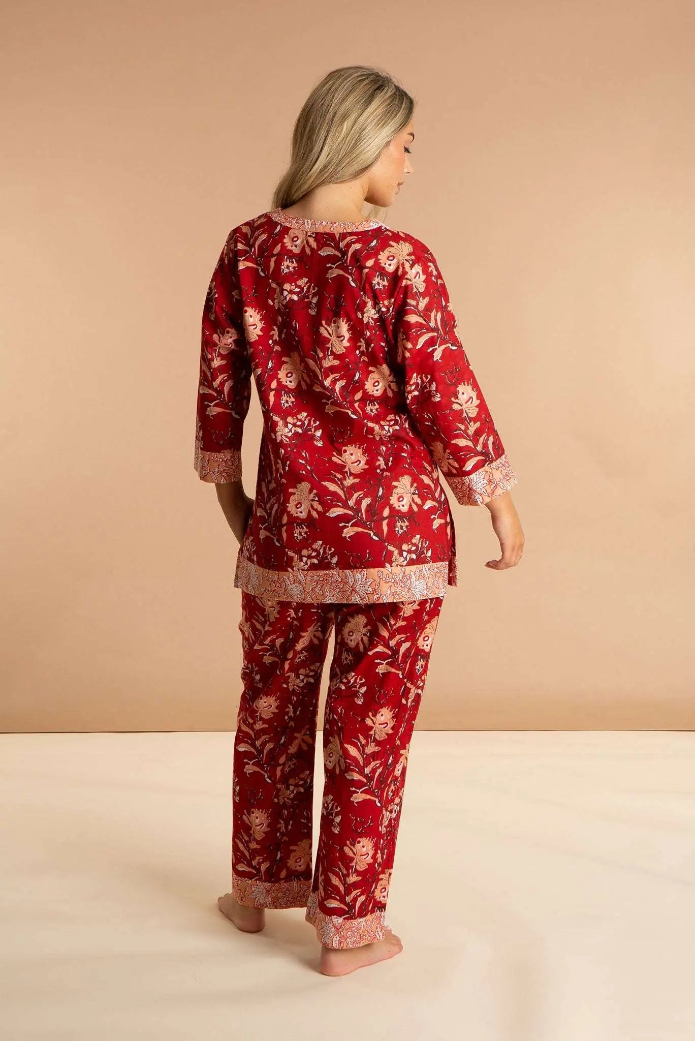 Our Red Rubra women's cotton pyjamas set is inspired by the sprawling sea of star dunes in the Sahara Desert. These luxury pjs feature a 3/4-sleeved split neckline loose top and straight leg pyjama bottoms with pockets, which are carefully printed and pre-washed, leaving the soft and breathable 100% Indian cotton a dream to wear. Our bold printed loungewear compliments both your early nights and late mornings.