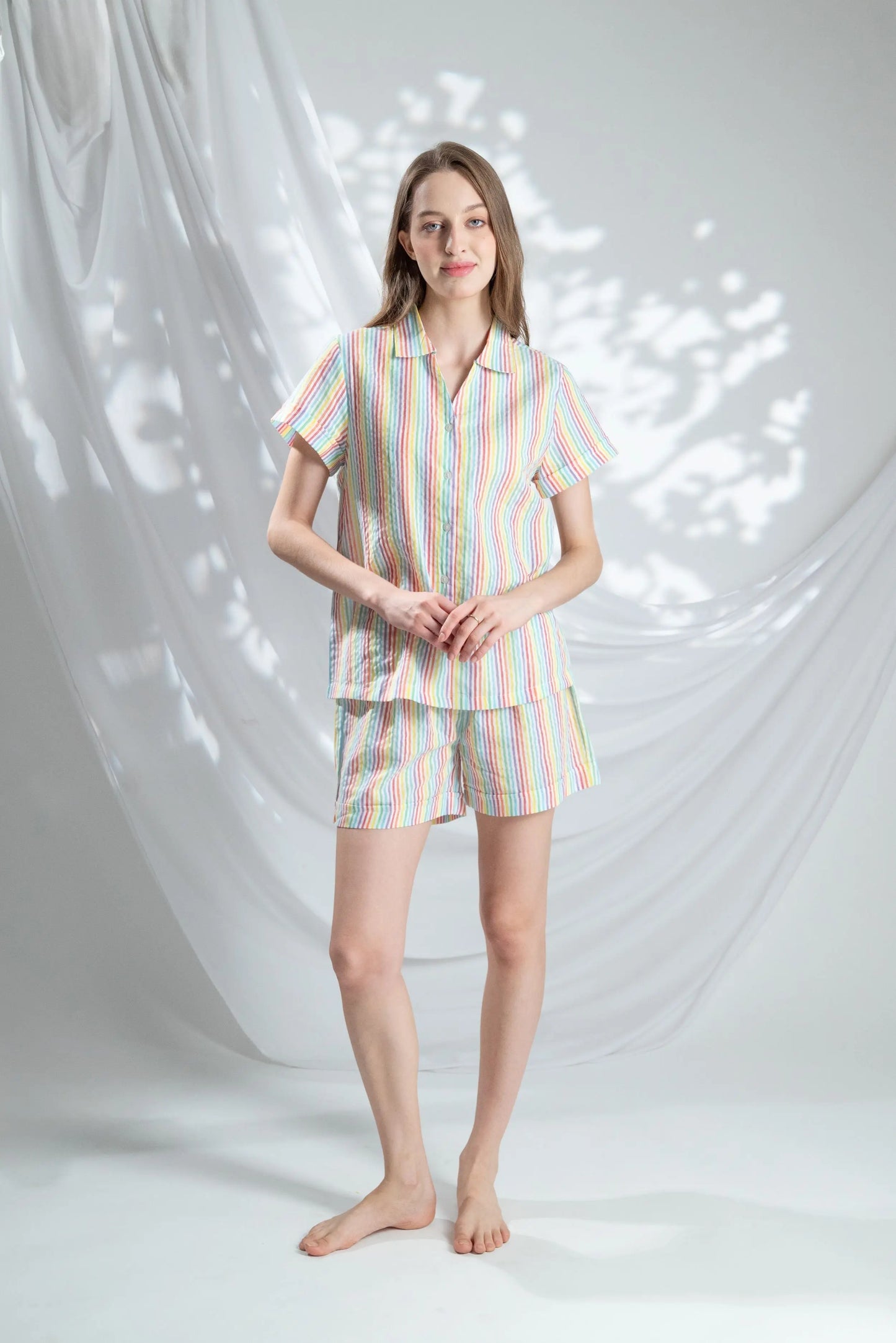 We're over the classic one toned striped pyjamas, here's introducing the resting rainbows. Zen encourages mindfulness, which doesn't always mean seriousness. This also means embracing joy in the present moment. We love how playful and happy these pyjamas and the colours are. These pyjamas embody inner joy and celebrate positive moments in life.