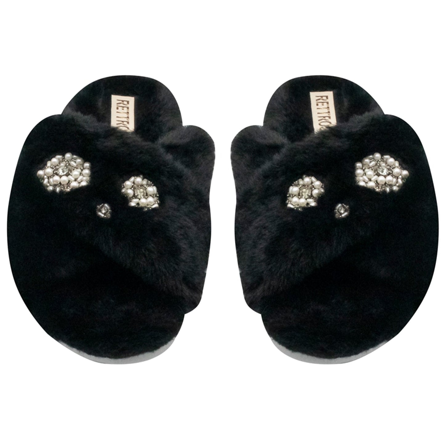 RETTROSE Juliette Luxury Black Faux Fur Women’s Slippers – Handmade Plush Diamanté Embellished Slid