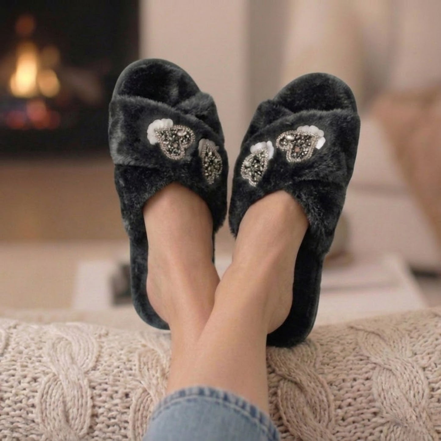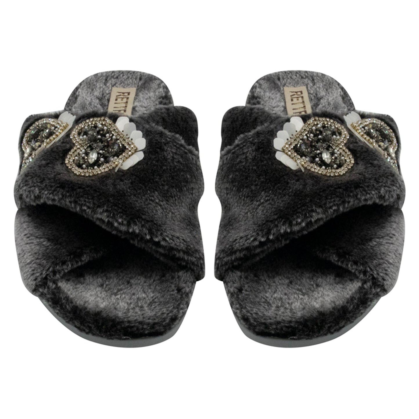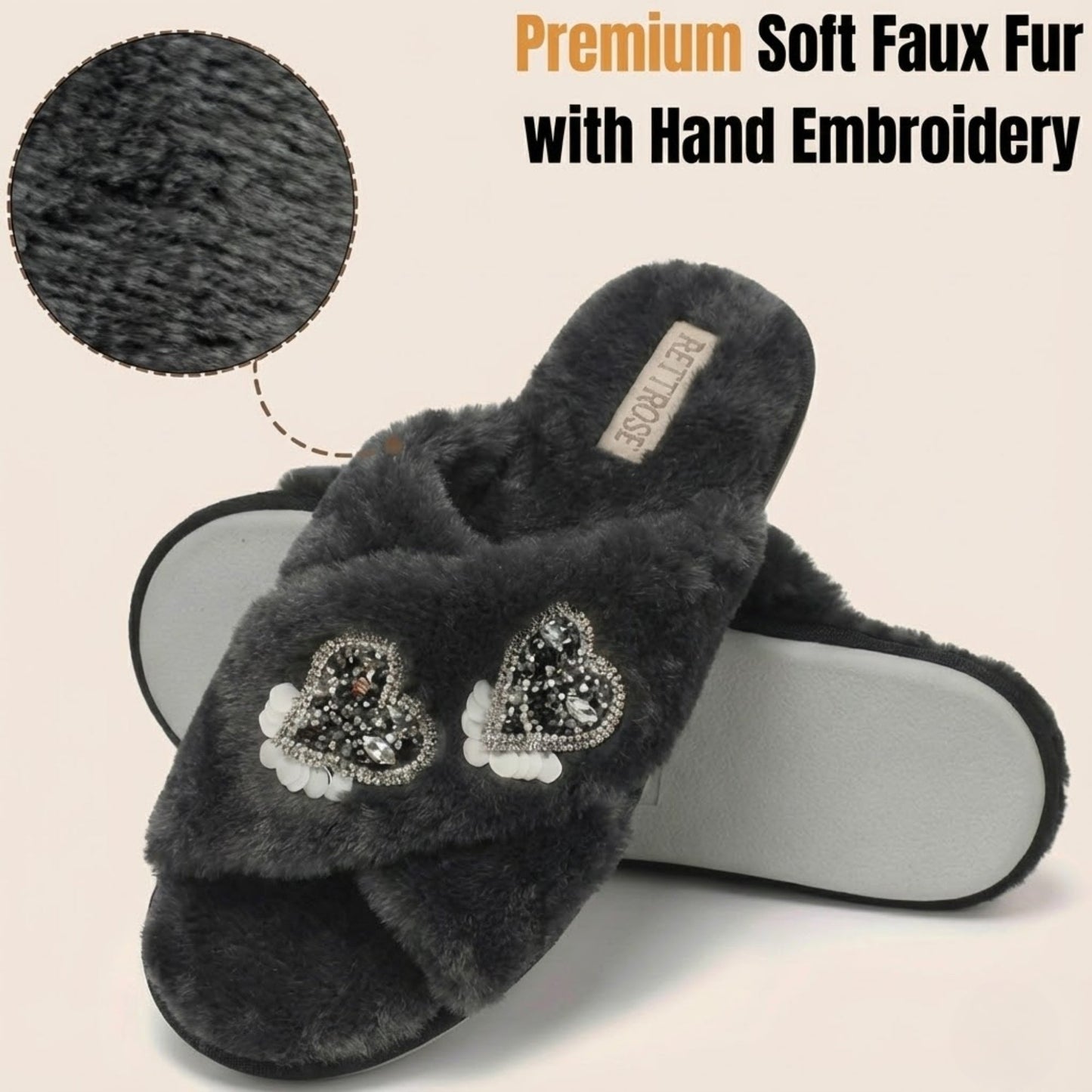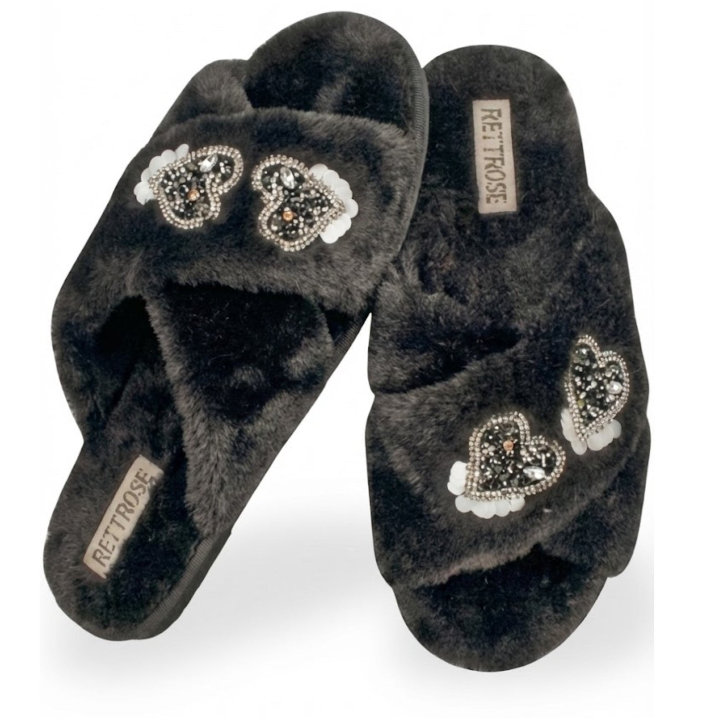 RETTROSE Katie Women’s Luxury Black Slippers – Lightweight Comfortable Handmade Plush Faux Fur Slippers with Diamanté Heart Embellishment
