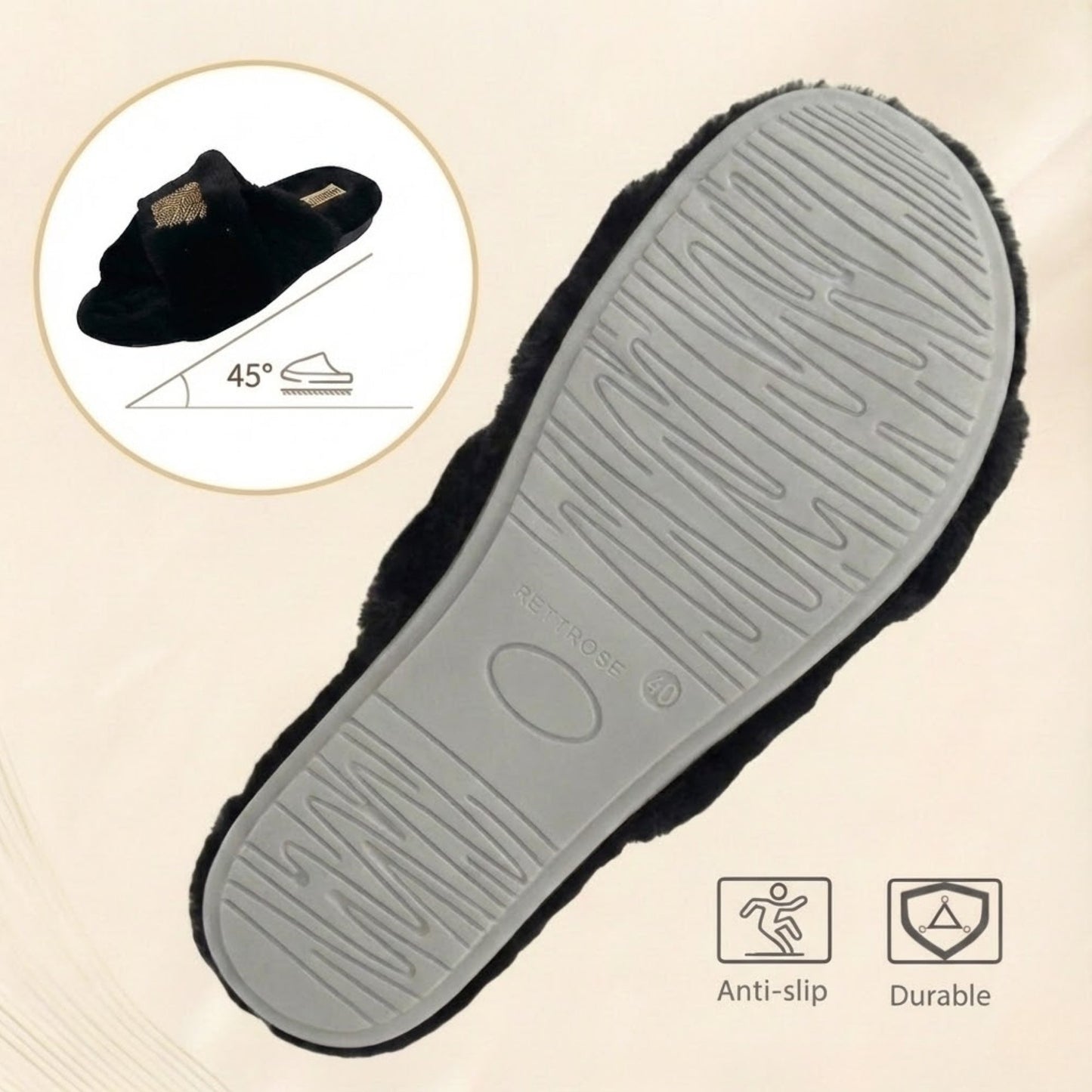 Indulge in everyday elegance with the RETTROSE Katie Women’s Luxury Black Slippers, designed for the modern woman who values both comfort and sophistication. These lightweight and comfortable women’s slippers feature plush faux fur in a classic black color, offering cozy warmth with a luxurious touch.