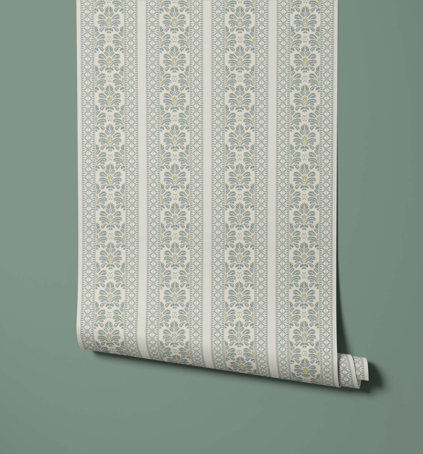 The botanical folk stripe wallpaper offers a beautifully detailed design that blends vertical structure with traditional artistry. The pattern features alternating columns: one column presents a charming, stylized floral motif with leaf and bud clusters, while the neighboring band is a narrower, structured stripe accented with small geometric elements. This combination reinforces verticality while adding delicate complexity.