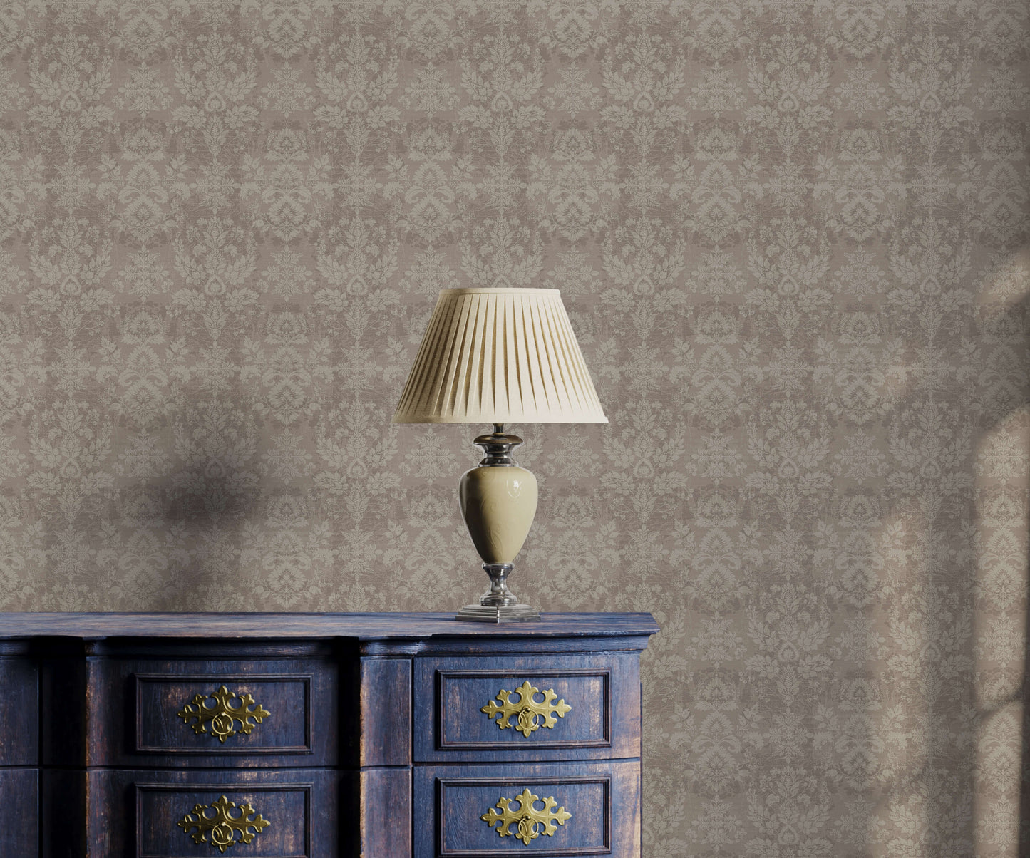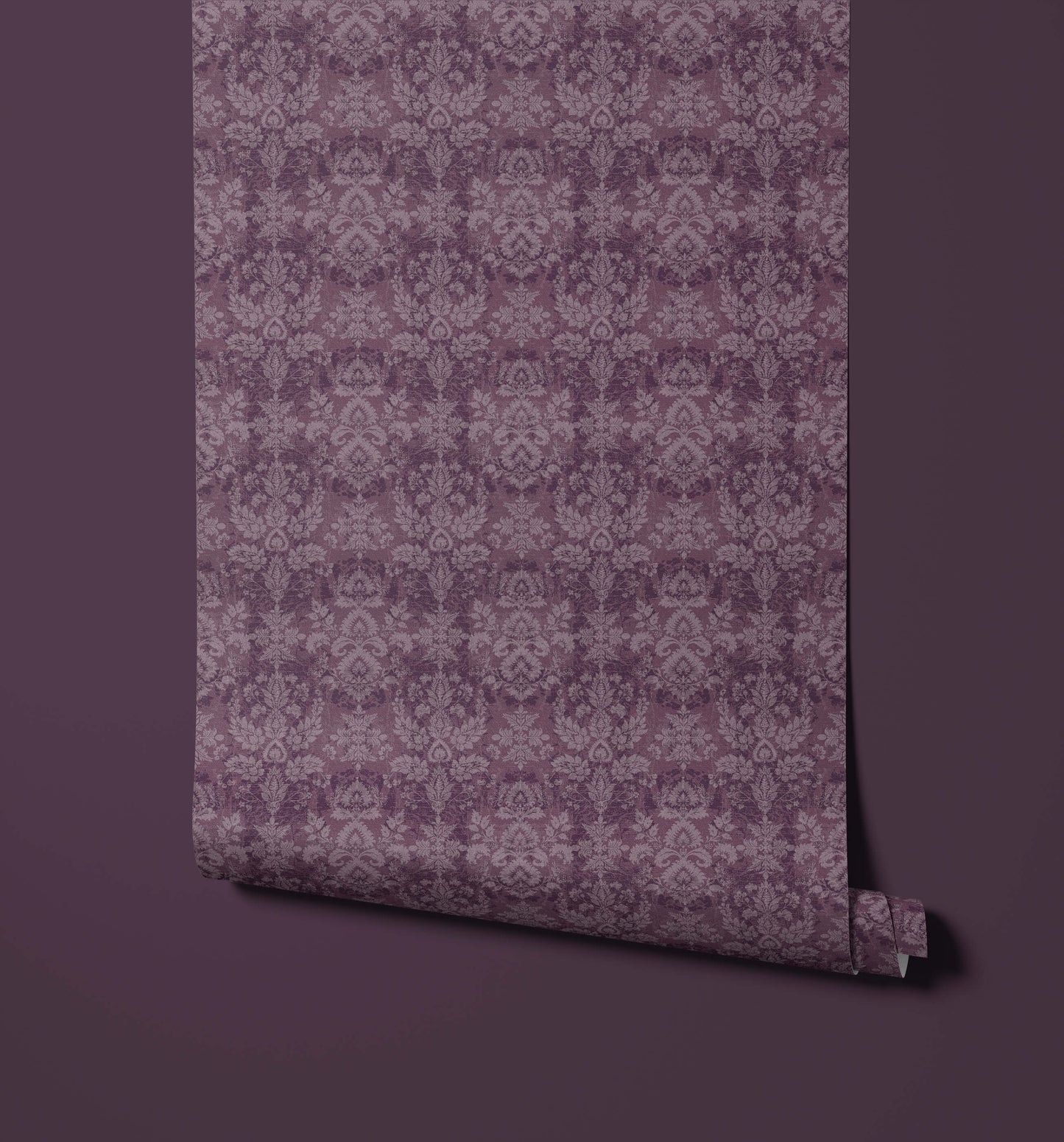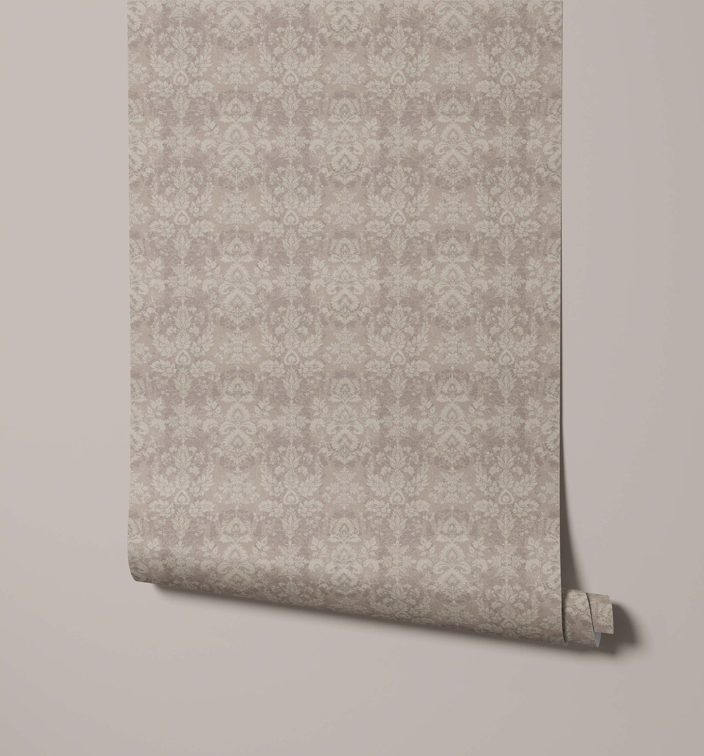 The vintage damask wallpaper presents a classic, sophisticated pattern with a beautifully aged aesthetic, instantly adding depth and historical character to a room. The design features large, sweeping traditional damask motifs that repeat in a structured vertical pattern. The pattern is intentionally rendered with a subtle, distressed effect, giving the motifs a softly faded, textural quality that mimics aged plaster or linen.