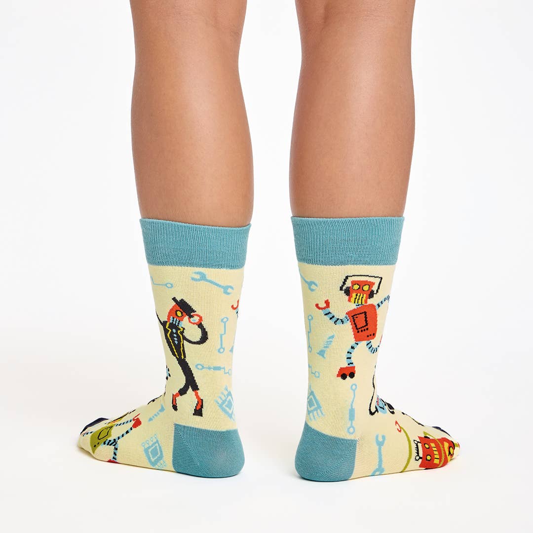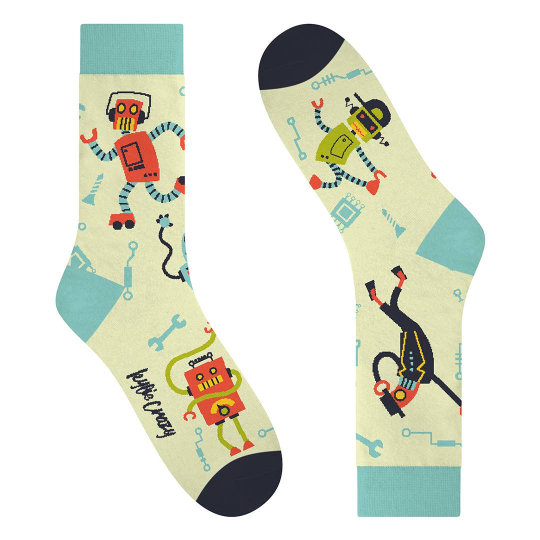 Beep boop bop your way to sock supremacy with our “Robo-Boogie” socks. A retro robot rave right on your feet. Packed with dancing droids, pixelated charm, and circuit board flair, these socks are engineered for fun and programmed for comfort.