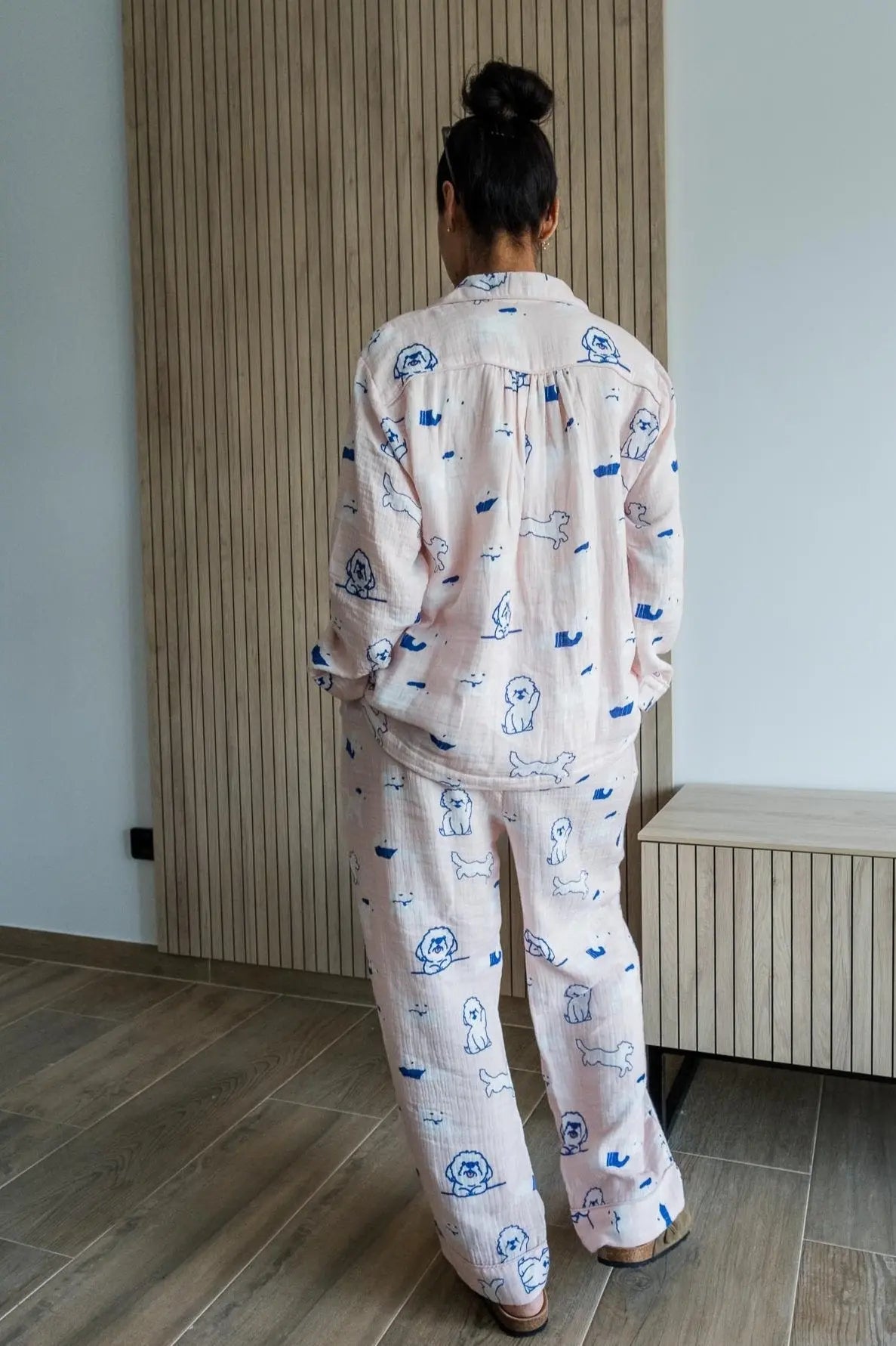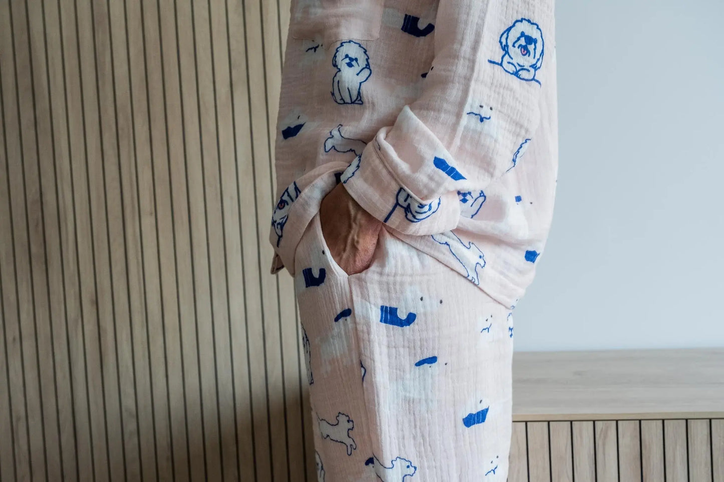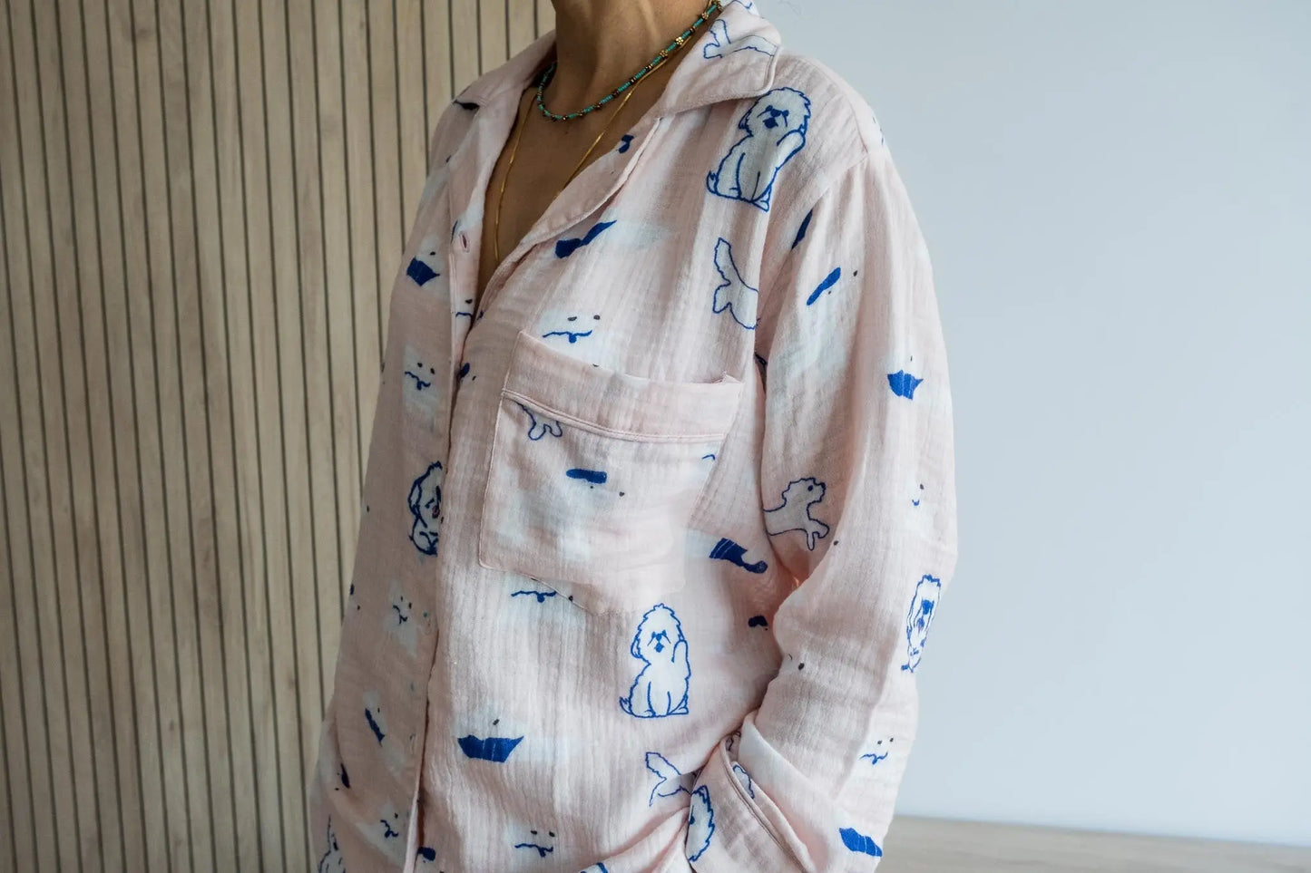 This is one for all of the dog lovers out there! Get ready to fall in love with these super soft cotton gauze pyjamas! The adorable doggy print, inspired by our little shih tzu Rocco, will melt your heart whilst filling your soul with love. These PJs feature long sleeves, essential pockets, and a beautiful tie string cord, effortlessly combining elegance and cuteness. Soft and breathable with double gauze, they're cool in the summer and cozy warm in the winter. An ageless, timeless piece, these pyjamas make a beautiful gift for anyone who loves dogs.