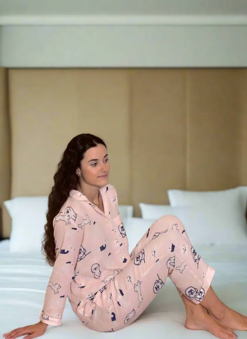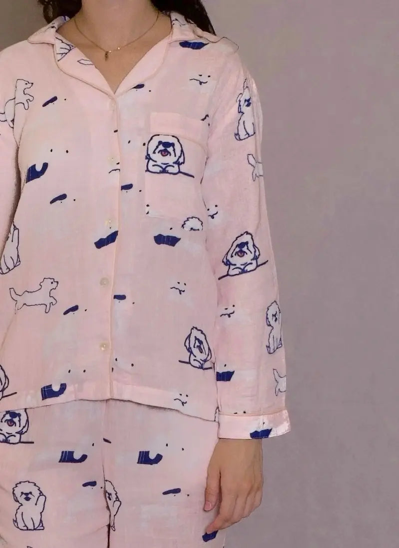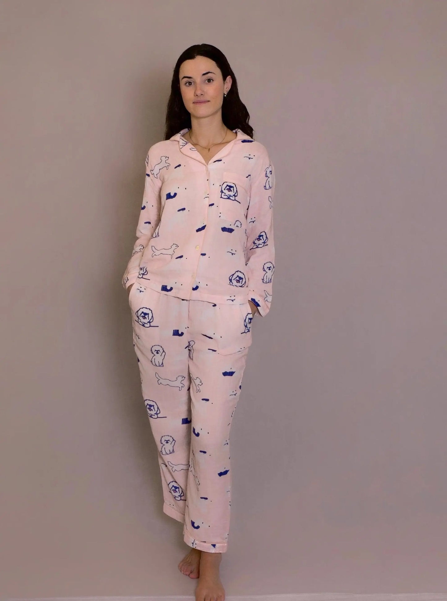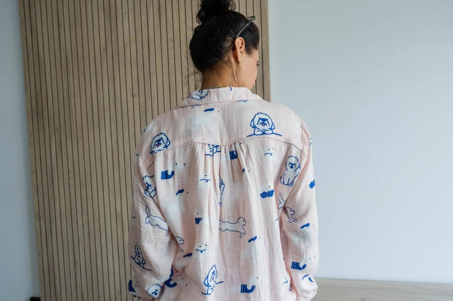 This is one for all of the dog lovers out there! Get ready to fall in love with these super soft cotton gauze pyjamas! The adorable doggy print, inspired by our little shih tzu Rocco, will melt your heart whilst filling your soul with love. These PJs feature long sleeves, essential pockets, and a beautiful tie string cord, effortlessly combining elegance and cuteness. Soft and breathable with double gauze, they're cool in the summer and cozy warm in the winter. An ageless, timeless piece, these pyjamas make a beautiful gift for anyone who loves dogs.