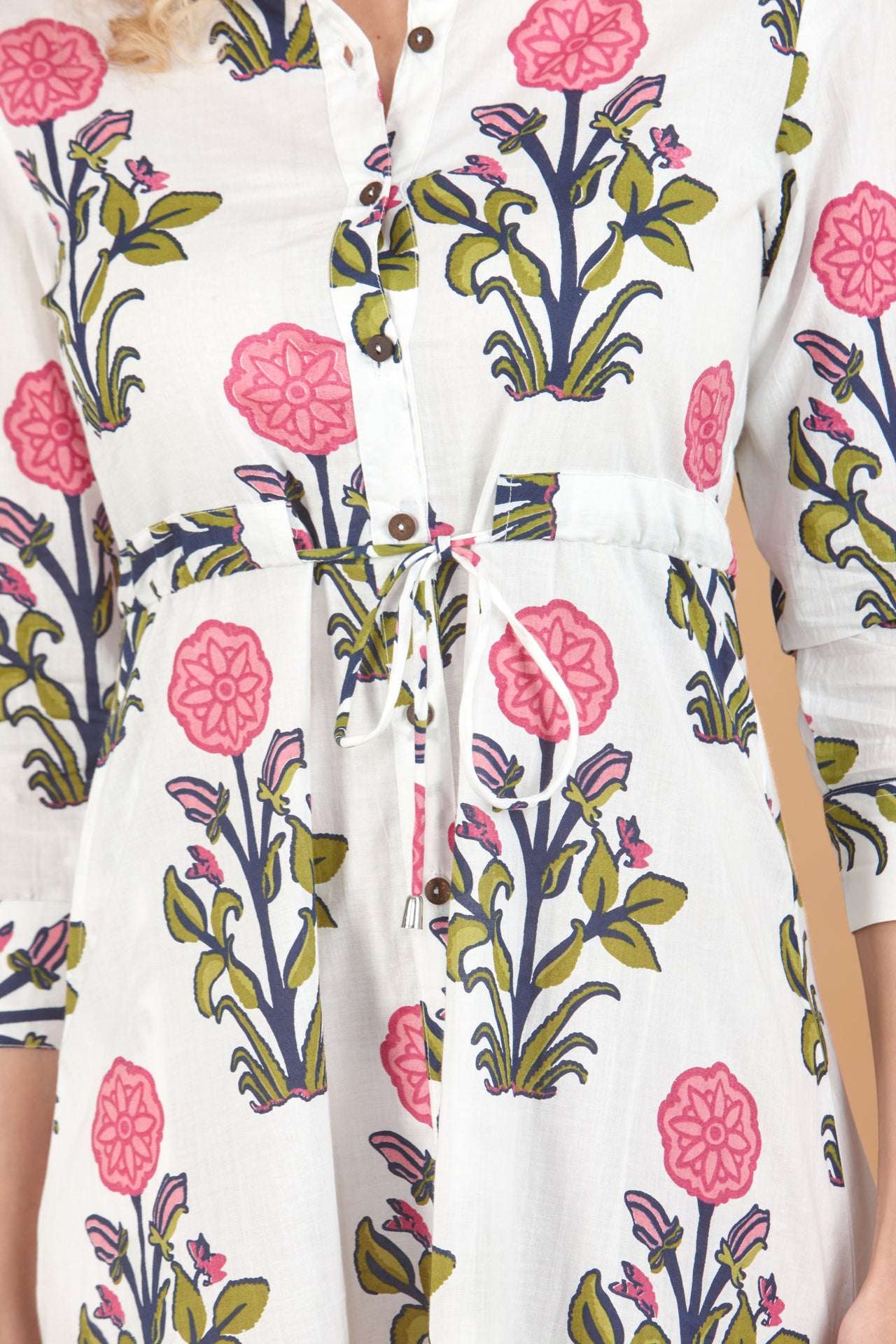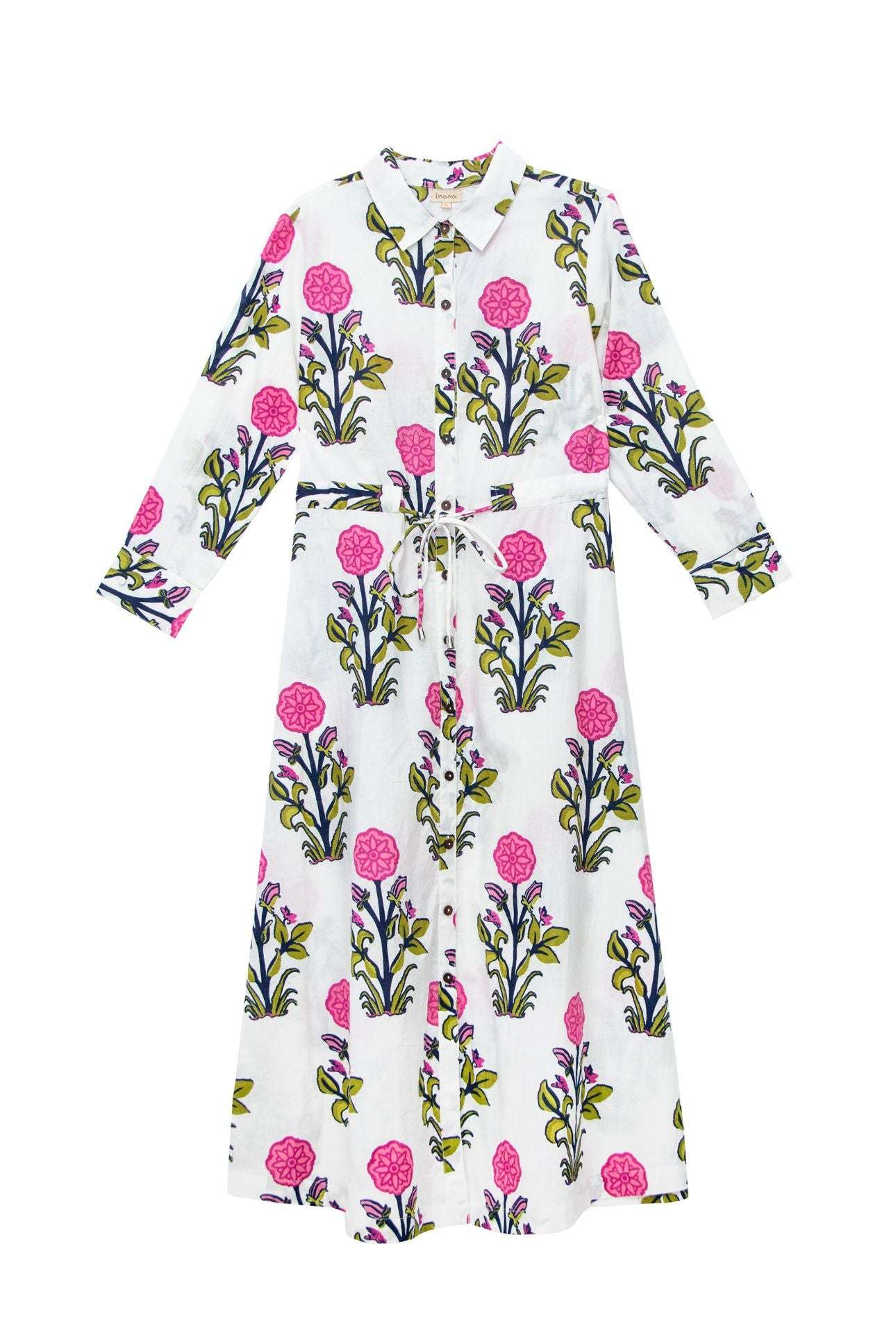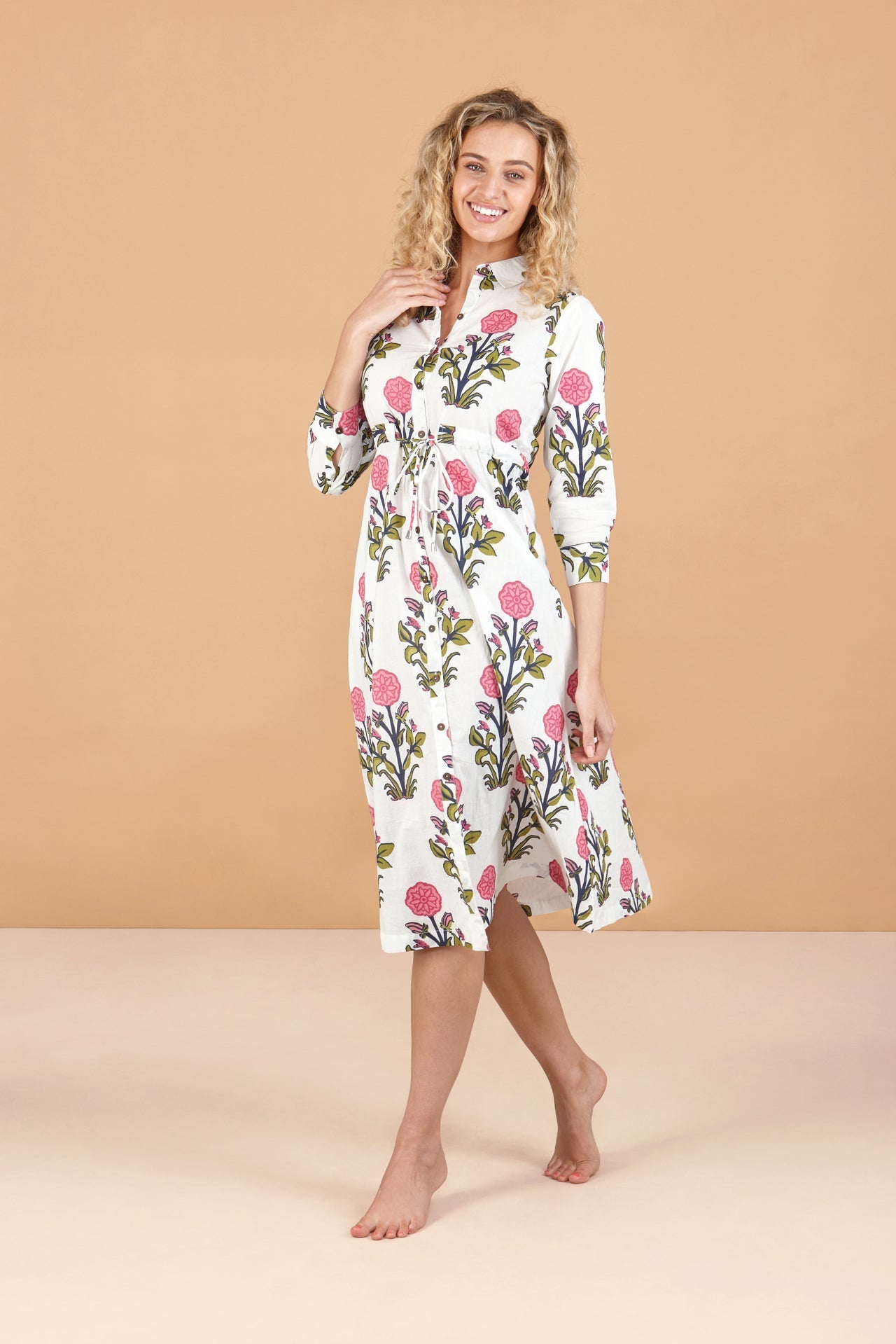 Our Rosette Bloom women's cotton shirt dress is inspired by the wild and natural geometry of new roses. The crisp cotton dress features a classic buttoned shirt collar and placket, 3/4 sleeves, flattering A-line skirt that hits just below the knee, and coordinating tie belt, along with convenient pockets. The classic silhouette pairs with the modern patterned fabric for a dress that will take you from season to season.