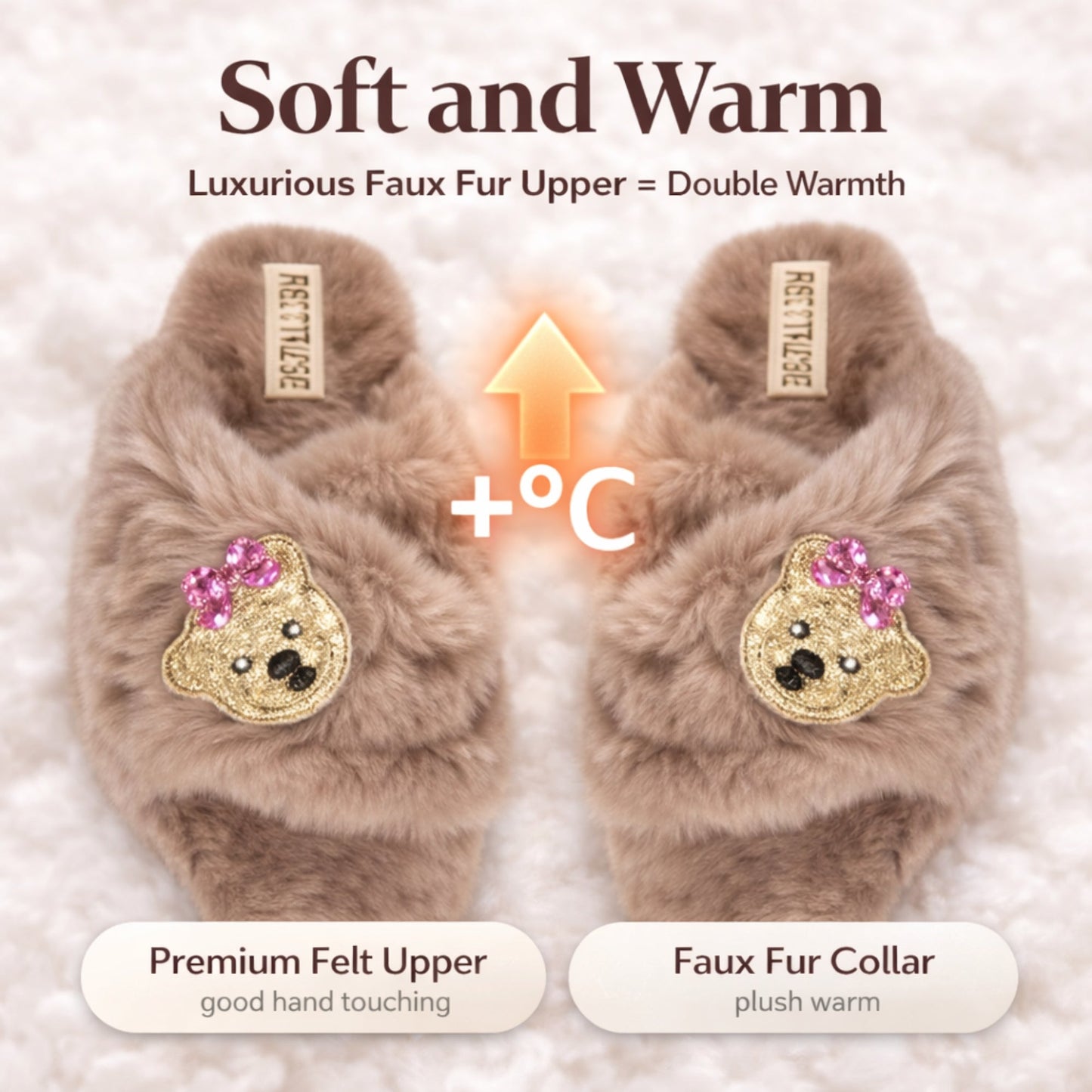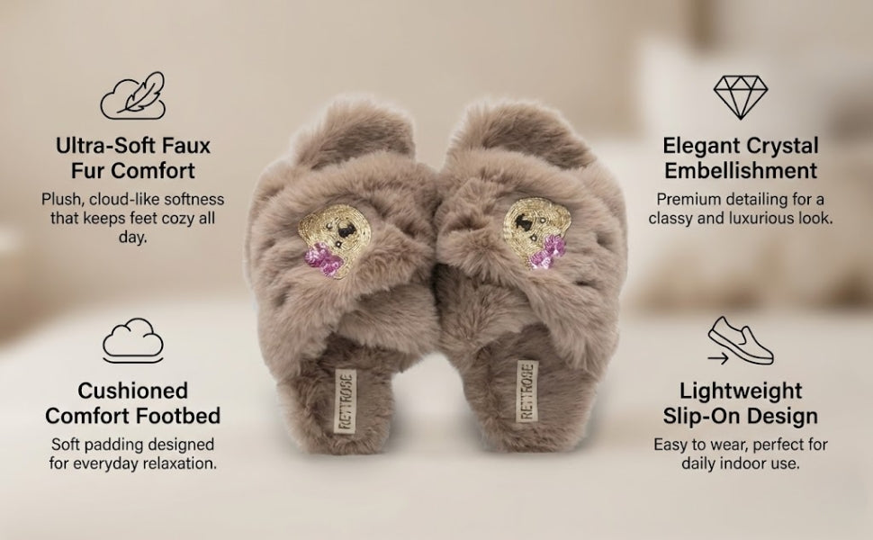 The Roxy Mink Luxury Plush Diamanté Embellished Handmade Slipper features a heavy plush faux fur fabrication with a hand embellished teddy appliqué featuring a variety of luxury dazzling diamanté.