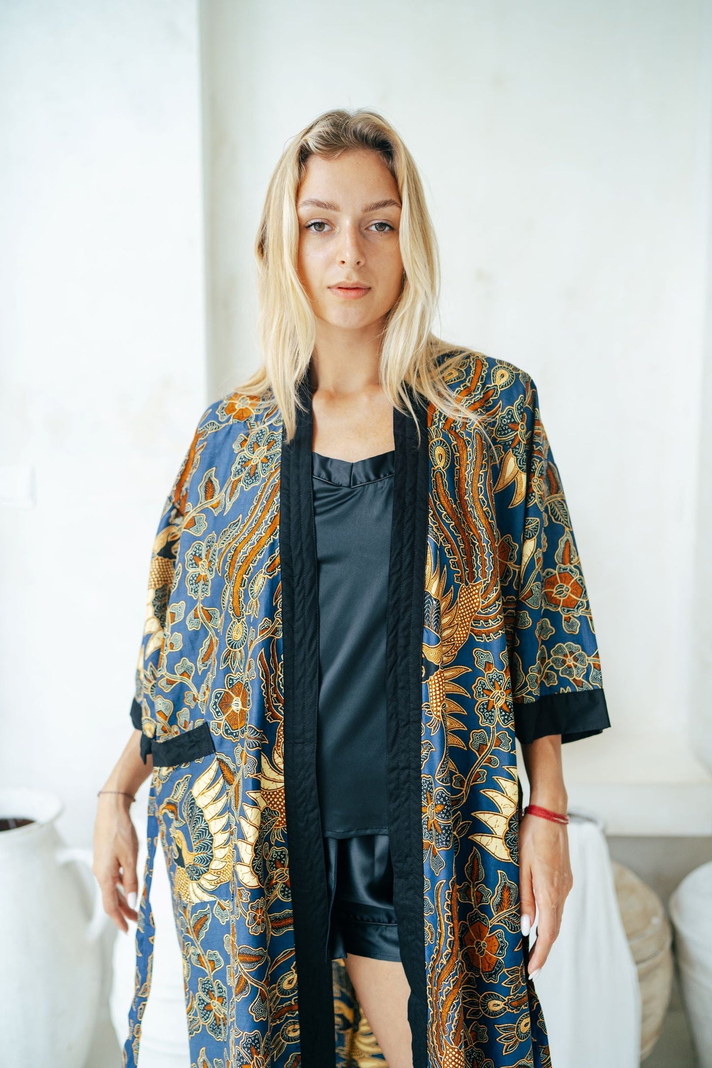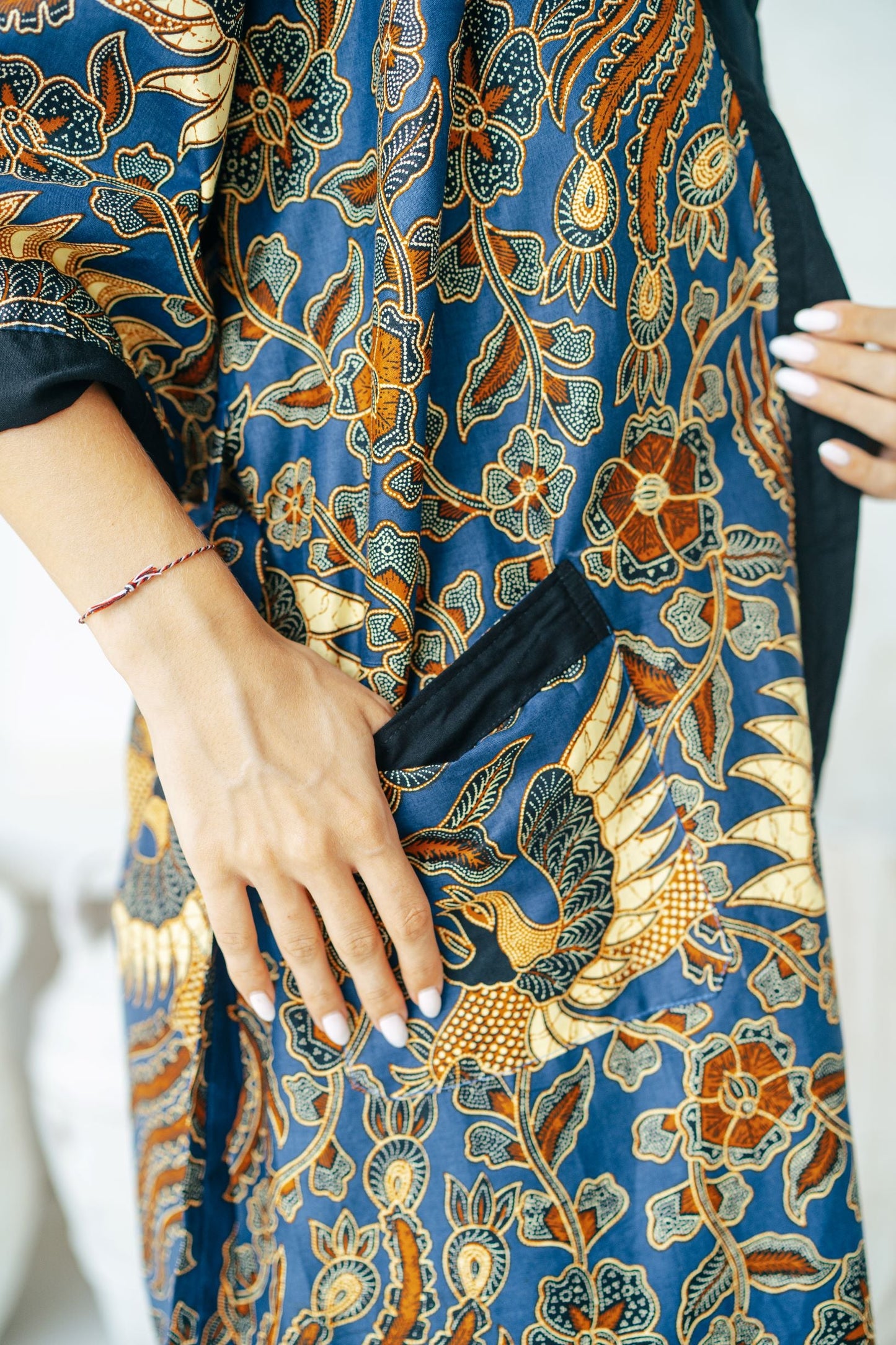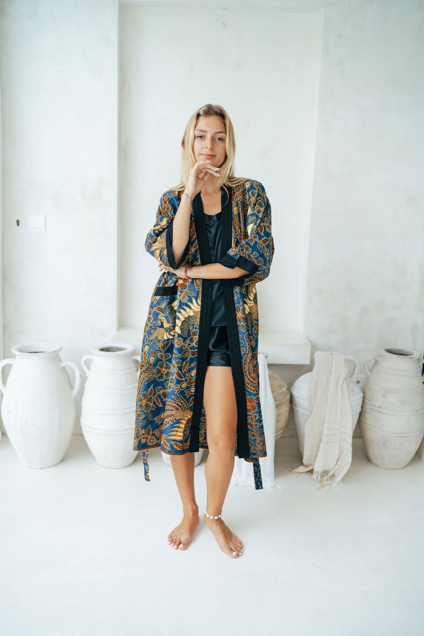 A relaxed, breathable robe made from 100% cotton and hand-printed using traditional Indonesian batik techniques. This full-length kimono is perfect for everyday lounging, festivals, holidays, or as a unique gift. It’s lightweight yet structured and has a timeless design that looks just as good open over an outfit as it does tied closed.