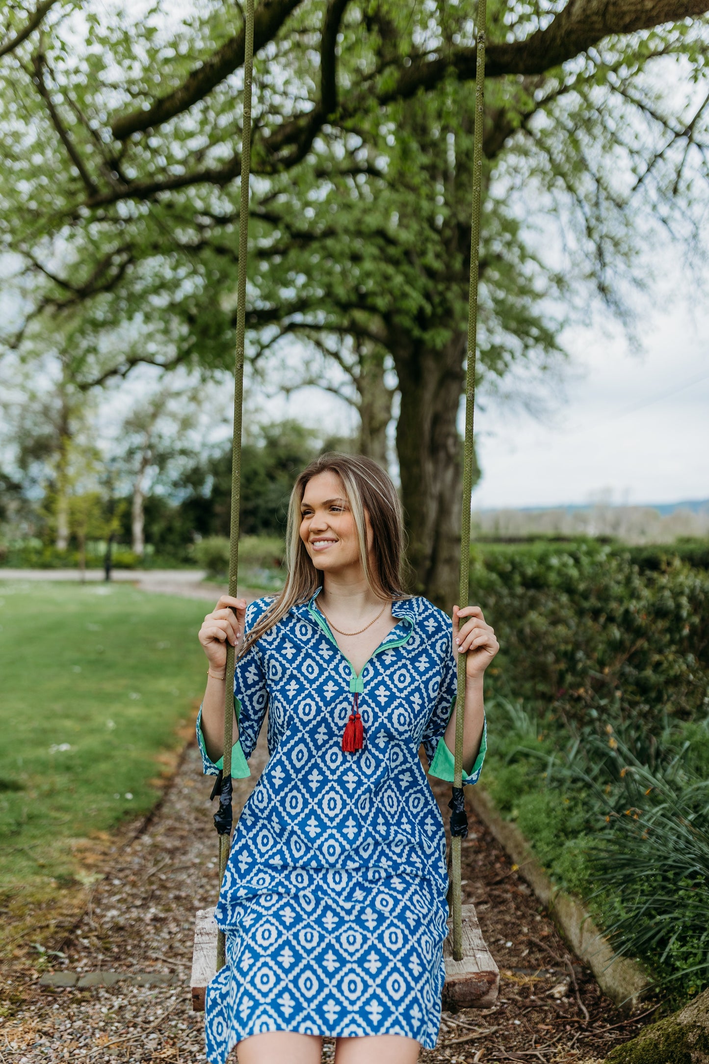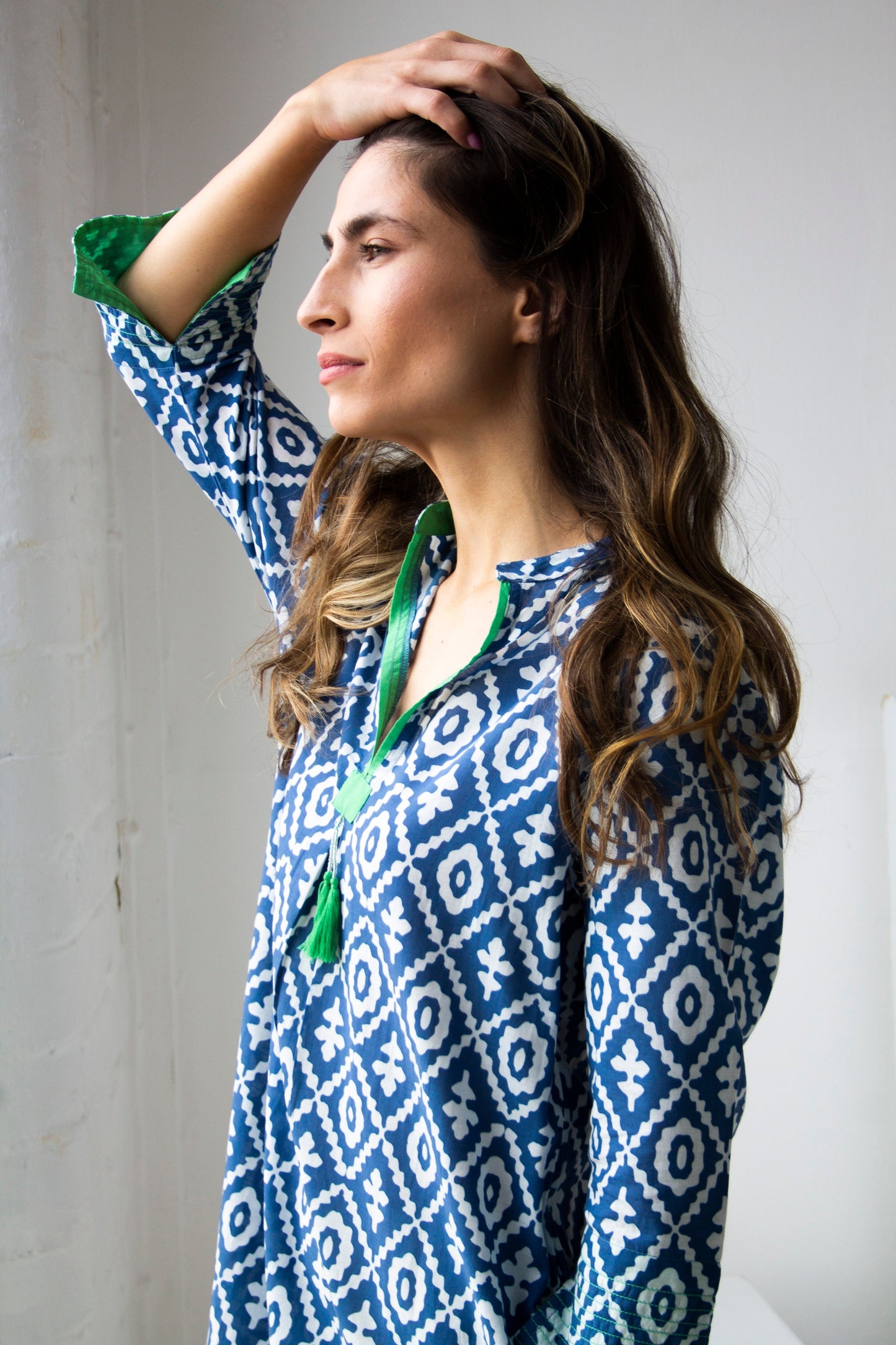 This holiday tunic is ideal for slipping on for breakfast or for the beach. This mid length tassel tunic is crafted from organic cotton trimmed with contrast green collar, cuffs and hem and mandarin collar for a flattering relaxed cut making you look and feel glamorous.