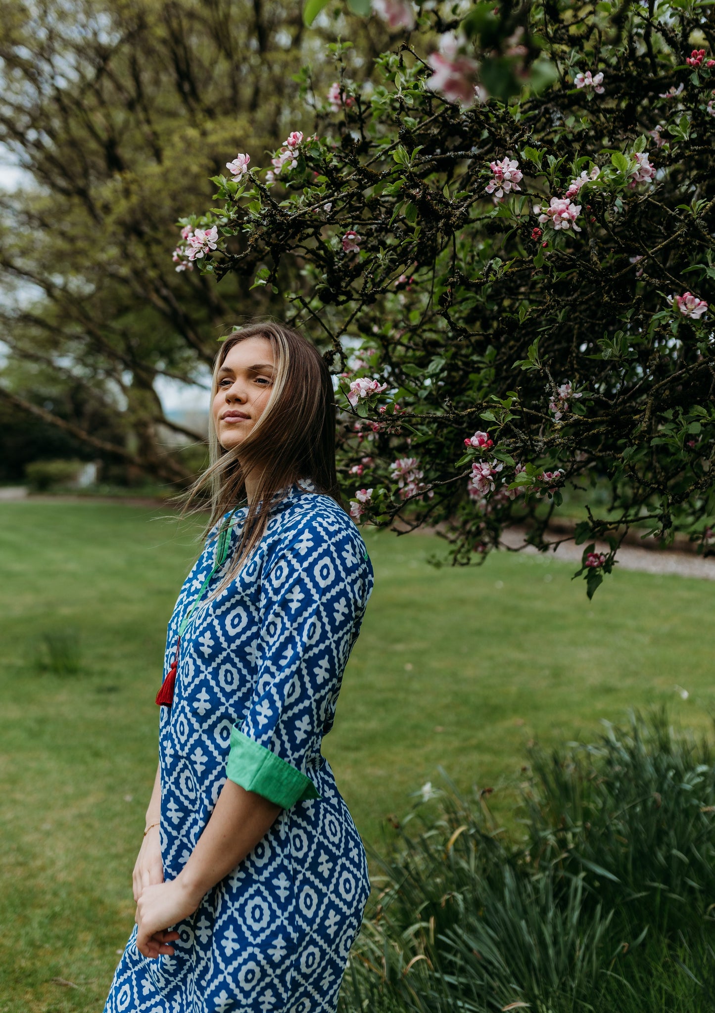 Perfect for hot summer days, this dress is made from organic breathable cotton in an uplifting colours of blue and greens designed in a loose silhouette with side slits and a mandarin collar.