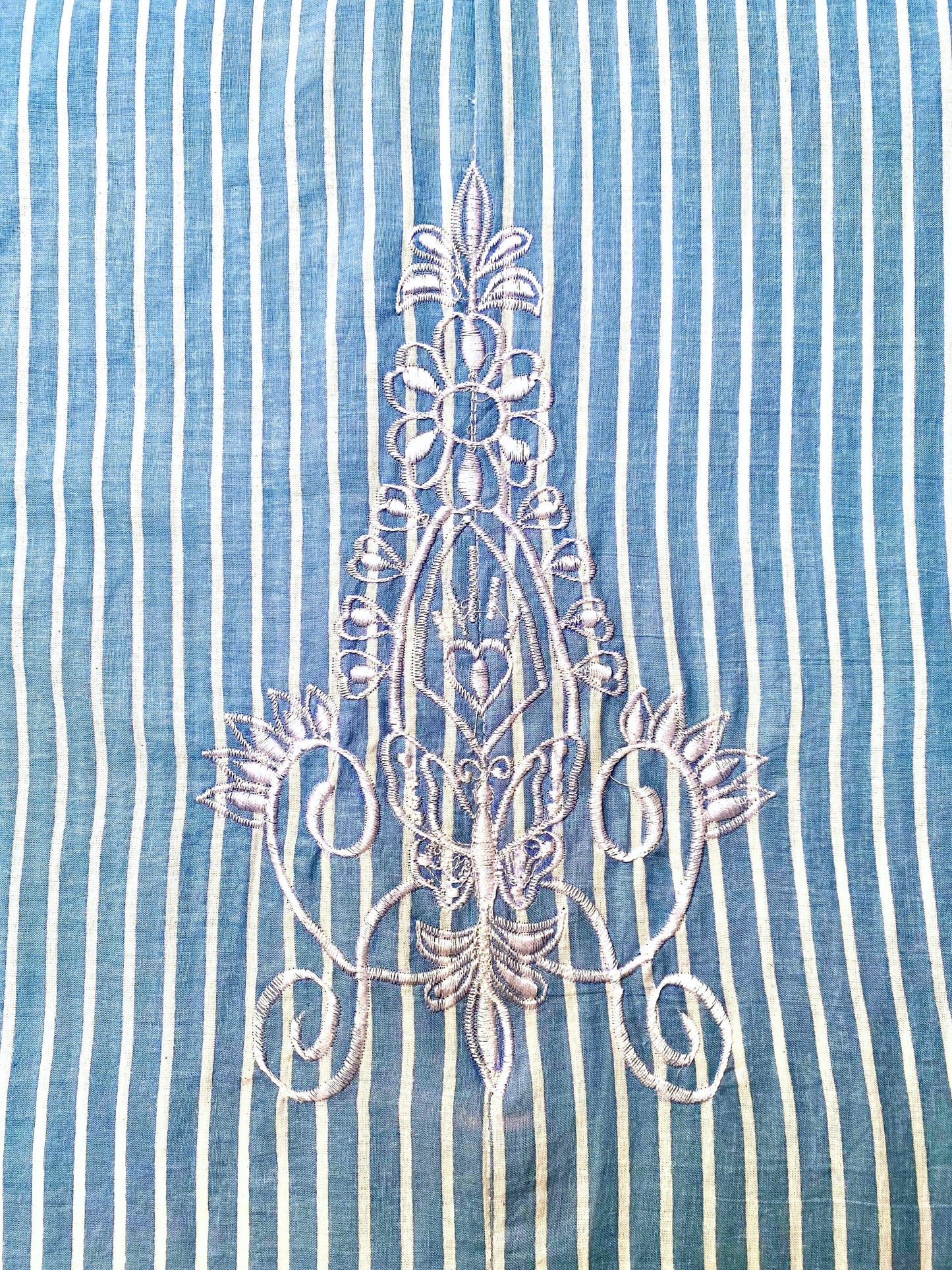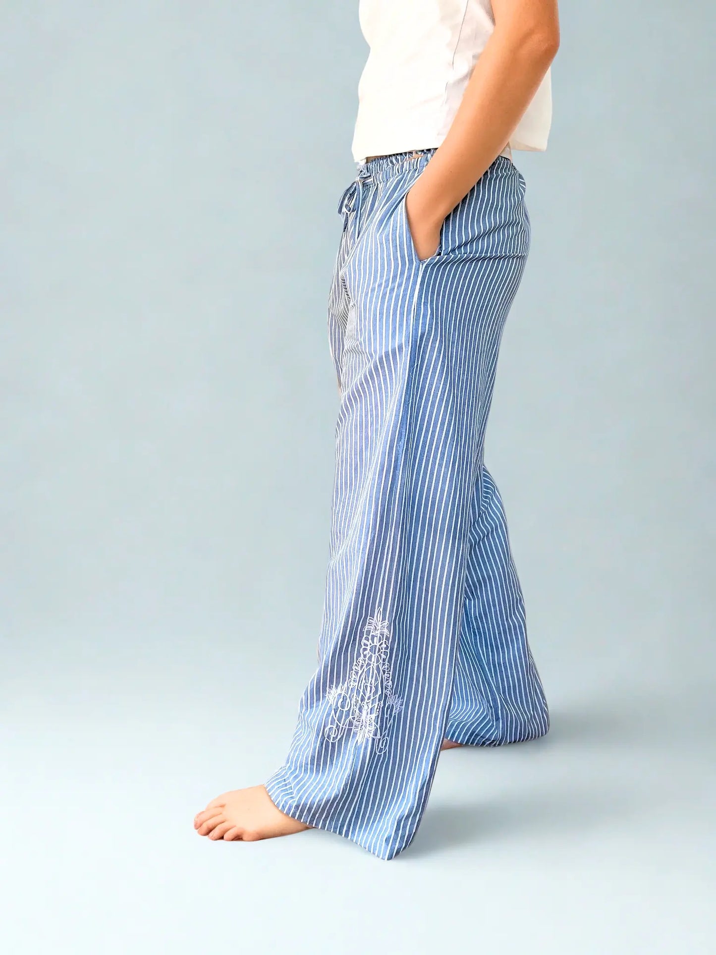 Each pair features a unique hand-block printed white and blue stripe pattern, inspired by timeless coastal beauty. The subtle side embroidery adds a sophisticated, artisanal touch. Pockets are thoughtfully made from repurposed fabric off-cuts, reflecting our commitment to sustainability and waste reduction.