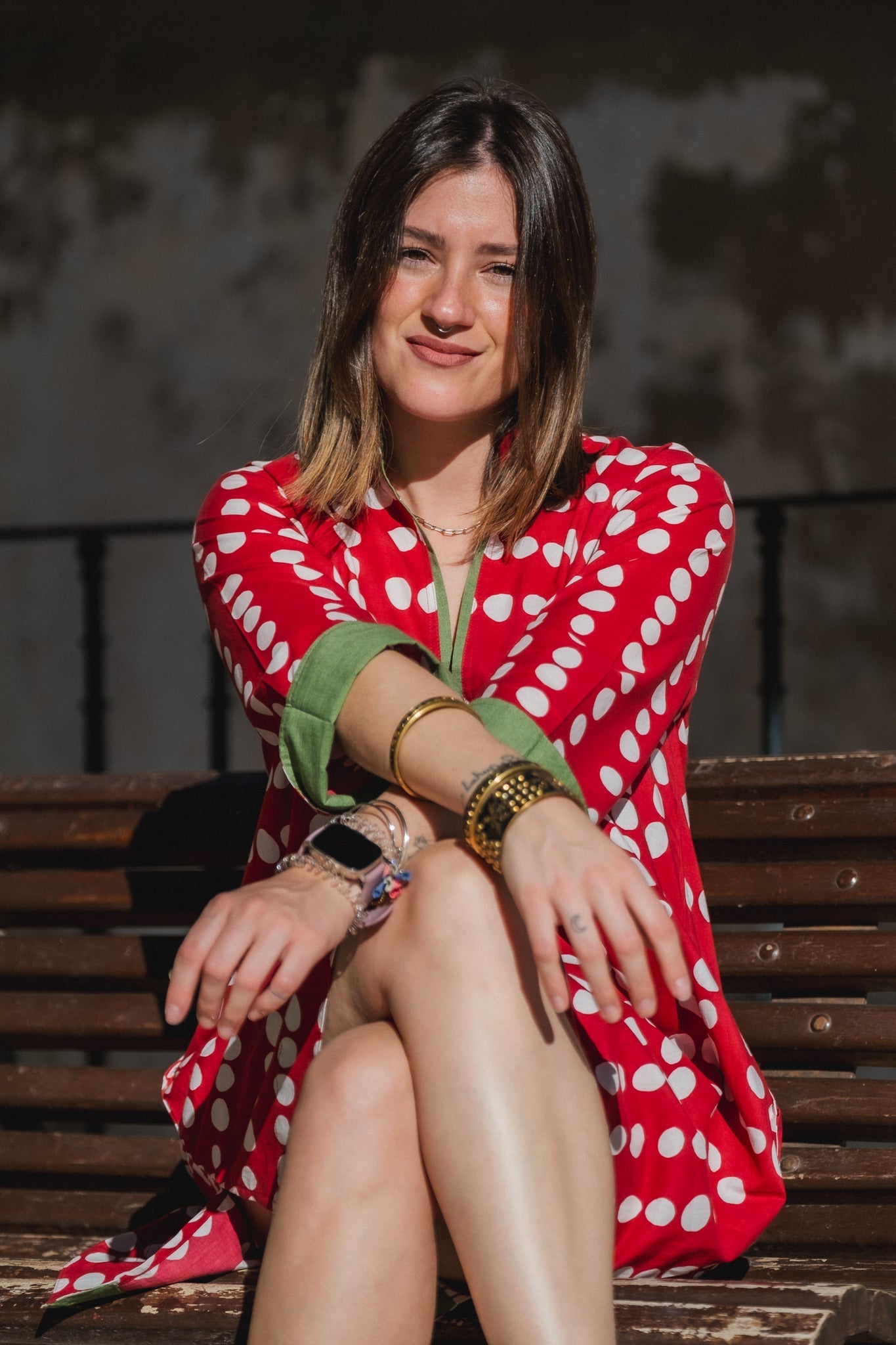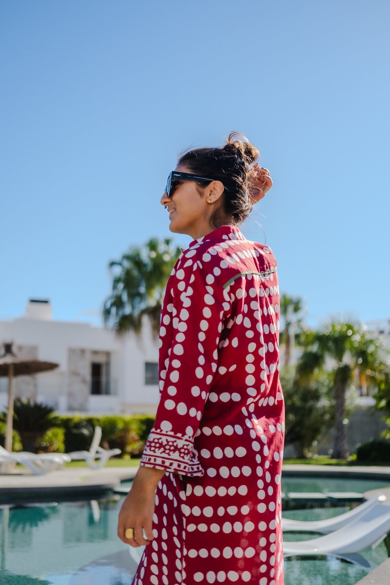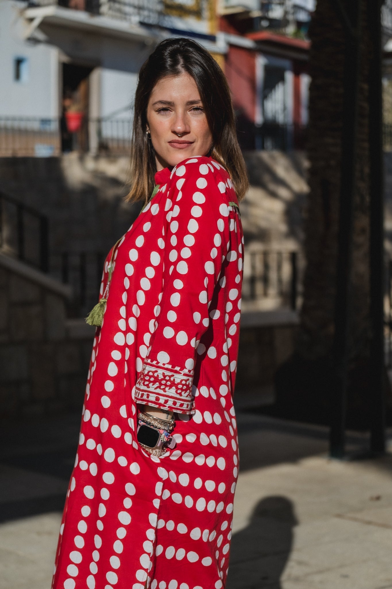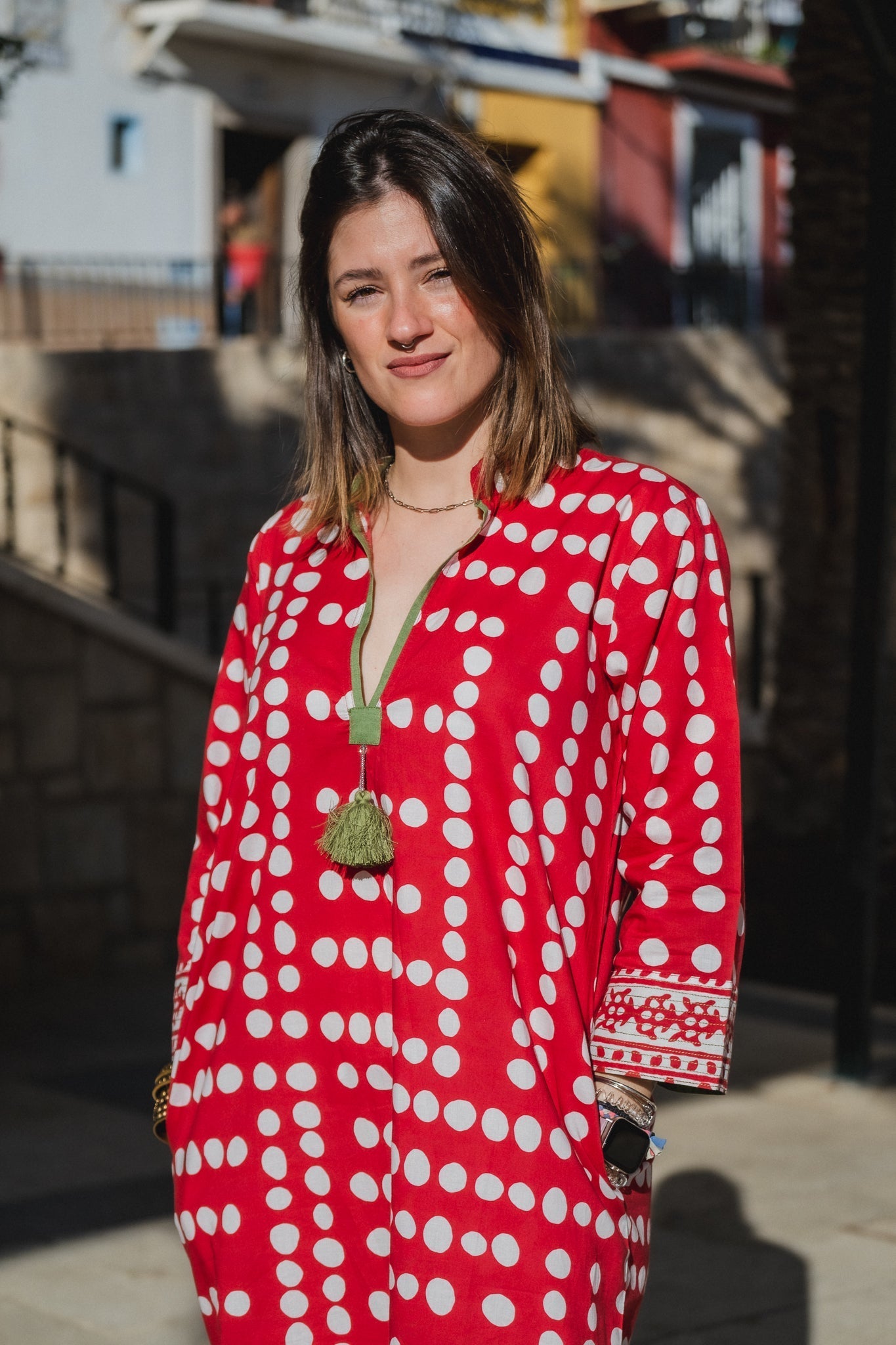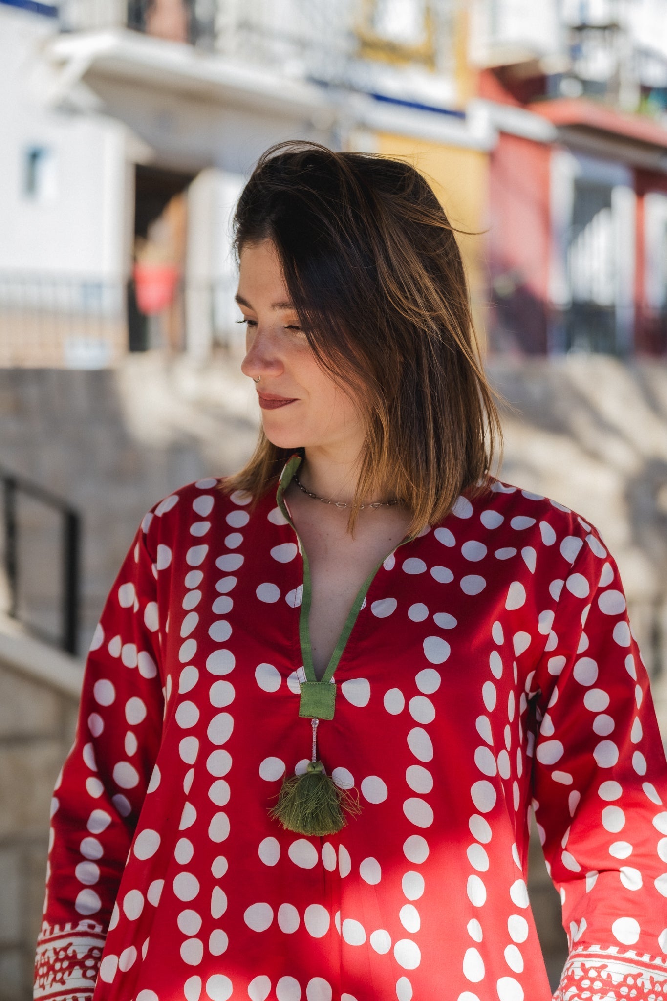 Perfect for hot summer days, this kaftan style dress is made from organic breathable cotton in uplifting colours of tomato red and olive green designed in a loose silhouette with side slits for ease and a mandarin collar.