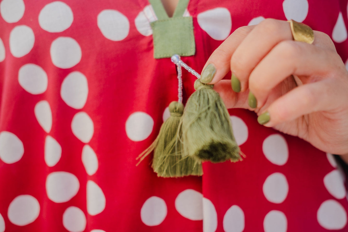 This kaftan is ideal for slipping on for breakfast or for the beach. This mid length tassel tunic is crafted from natural cotton trimmed with contrast olive green cuffs and hem and mandarin collar for a flattering relaxed cut making you look and feel glamorous.
