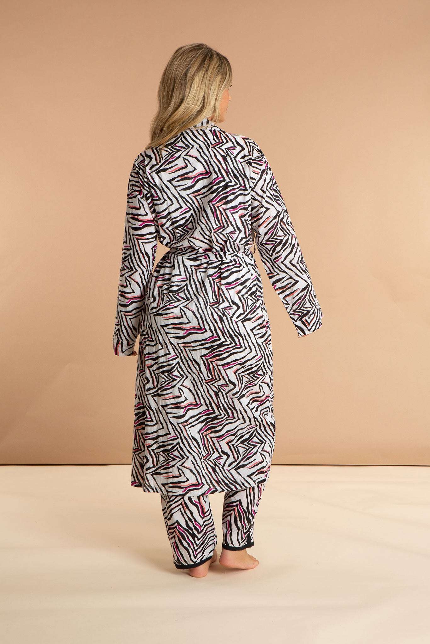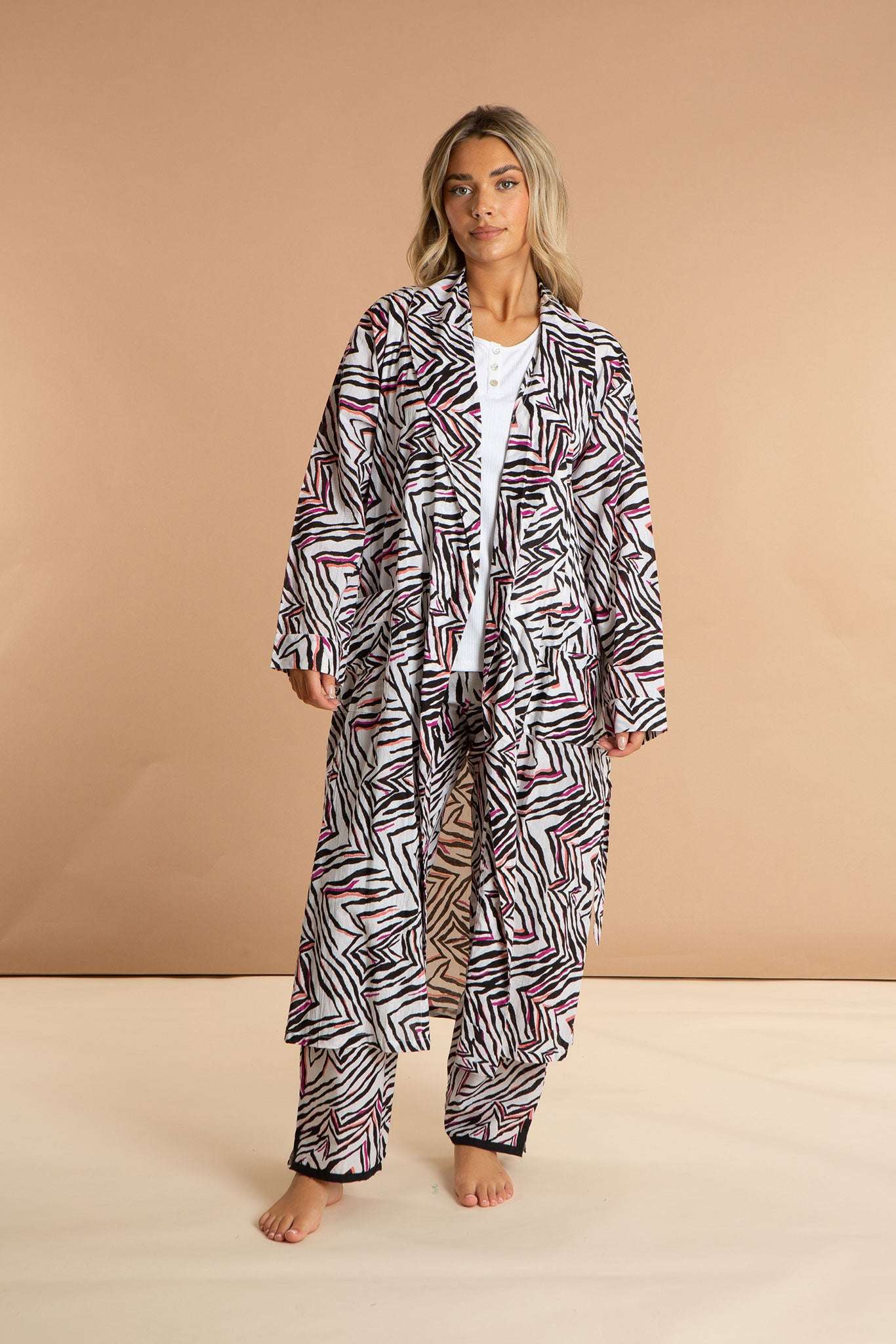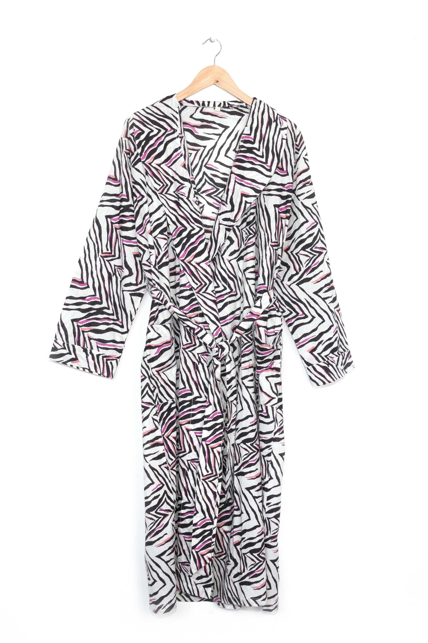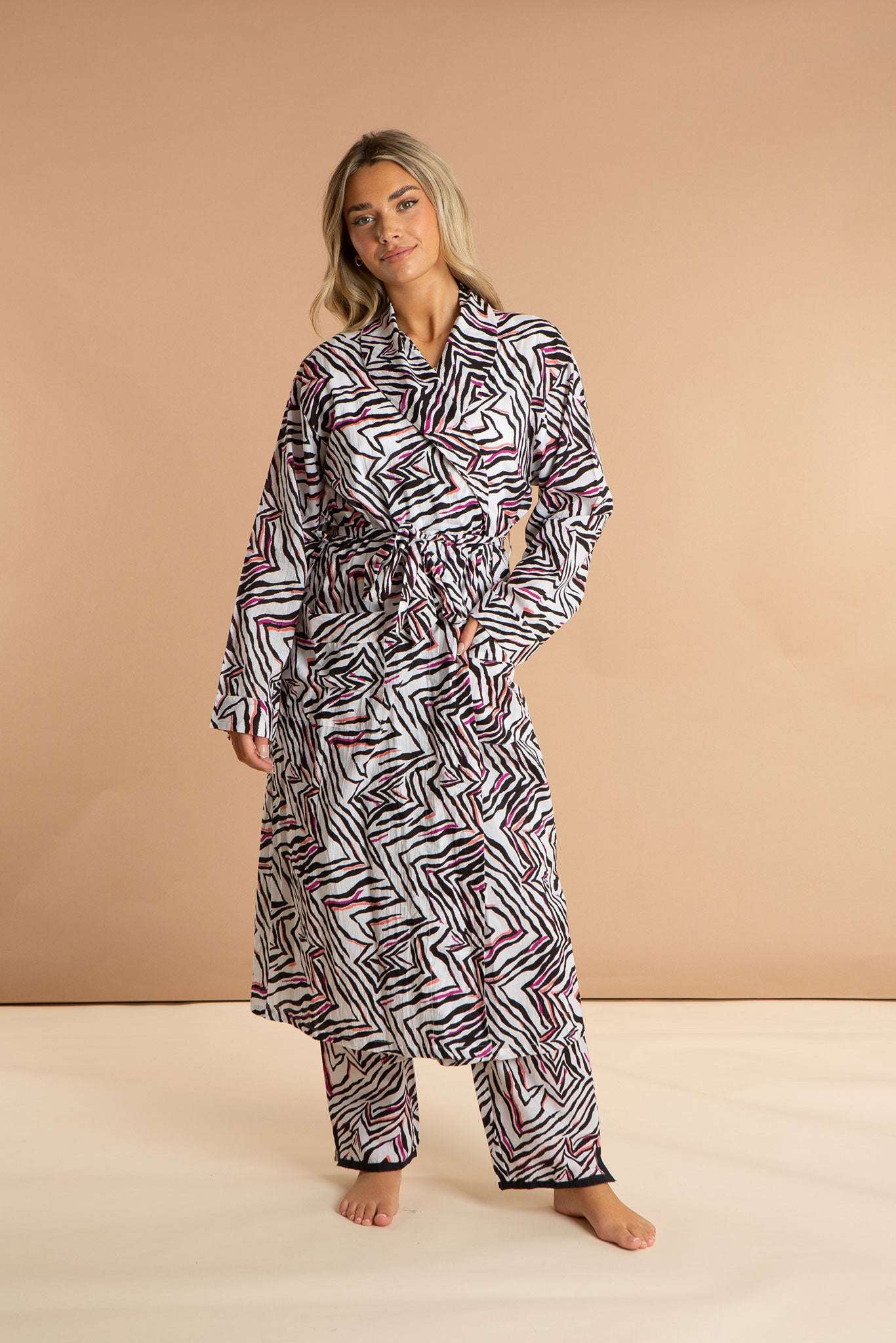 Our Savannah women's cotton robe has a pattern inspired by the glowing sunsets in the African plains. Featuring deep pockets, a wide collar, and an inner drawstring for security, this long luxury dressing gown is made from soft and breathable 100% Indian cotton, which is carefully printed and pre-washed. Our comfortable, bold printed loungewear proves that comfortable and fashionable can mix.