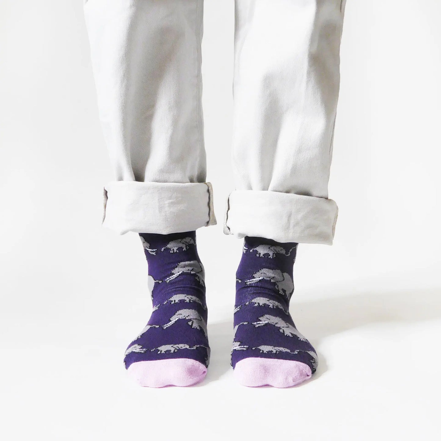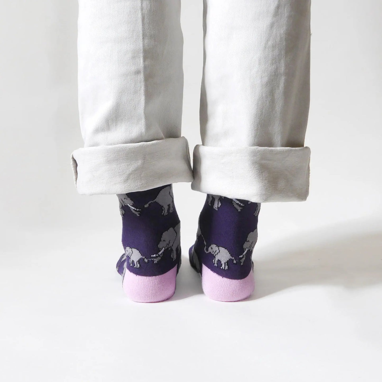 - Design: Purple socks with animated elephant pattern