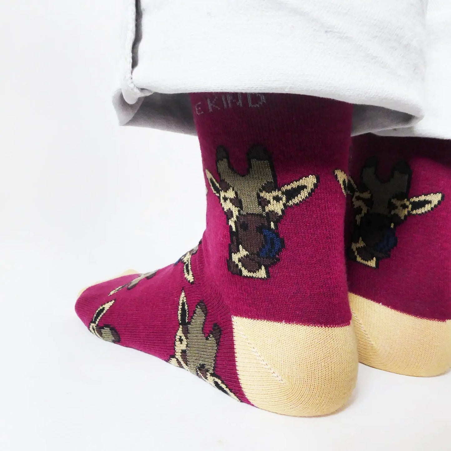 Stand tall in style with our Giraffe Bamboo Socks, designed for those who love wildlife and want to make a difference. These long-lasting burgundy socks are made from breathable, soft bamboo fibre and feature playful animated giraffe motifs all around — a fun and vibrant addition to any outfit.