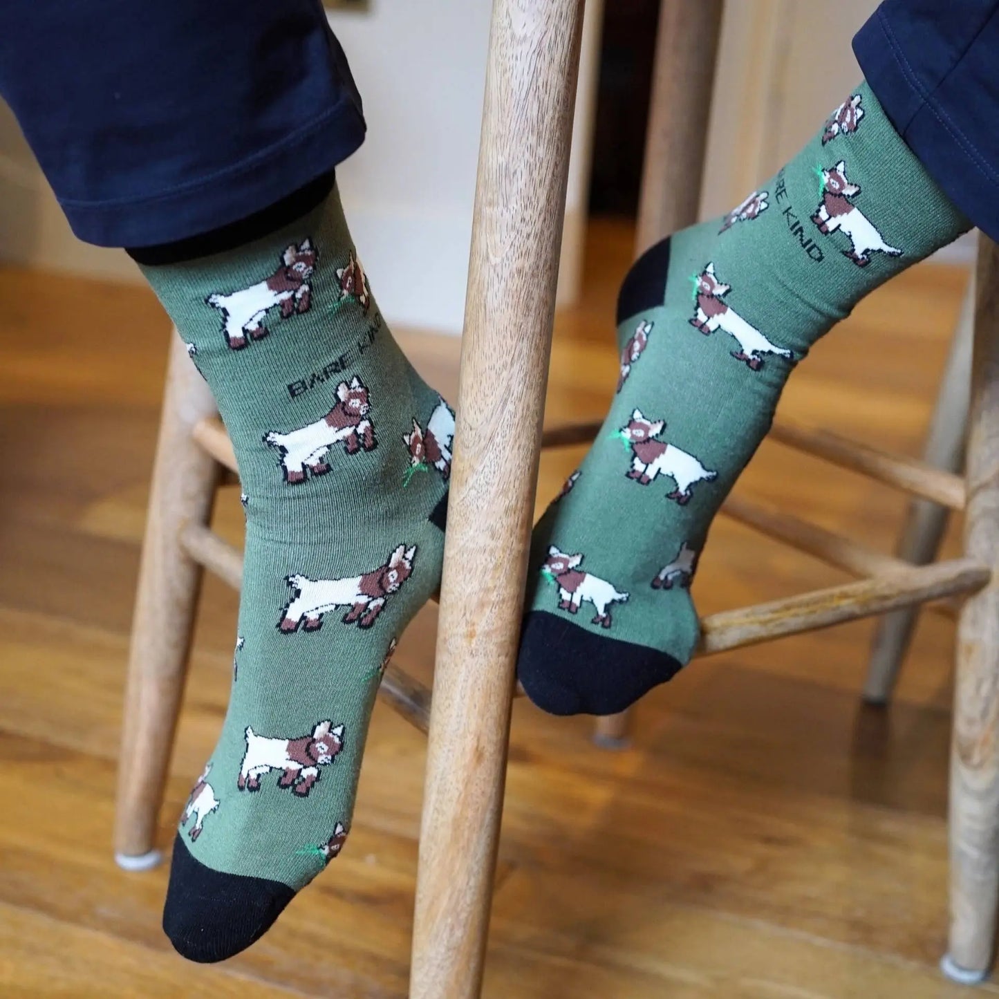 Show off your love for farmyard friends with our Goat Bamboo Socks, luxuriously soft, breathable, and designed for all-day comfort. These high-quality green socks feature playful goat motifs all over, bringing a cheerful and quirky touch to your wardrobe.