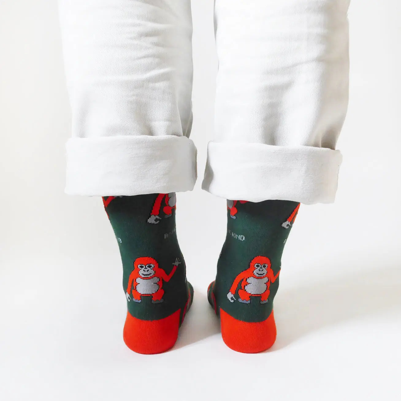 We donate 10% of profits to the Orangutan Foundation. What’s more, one acre of forest land is conserved for a year with every 4 pairs purchased. They make great work socks, gym socks, and dress socks. Orangutan socks are the perfect colourful gift for animal lovers.
