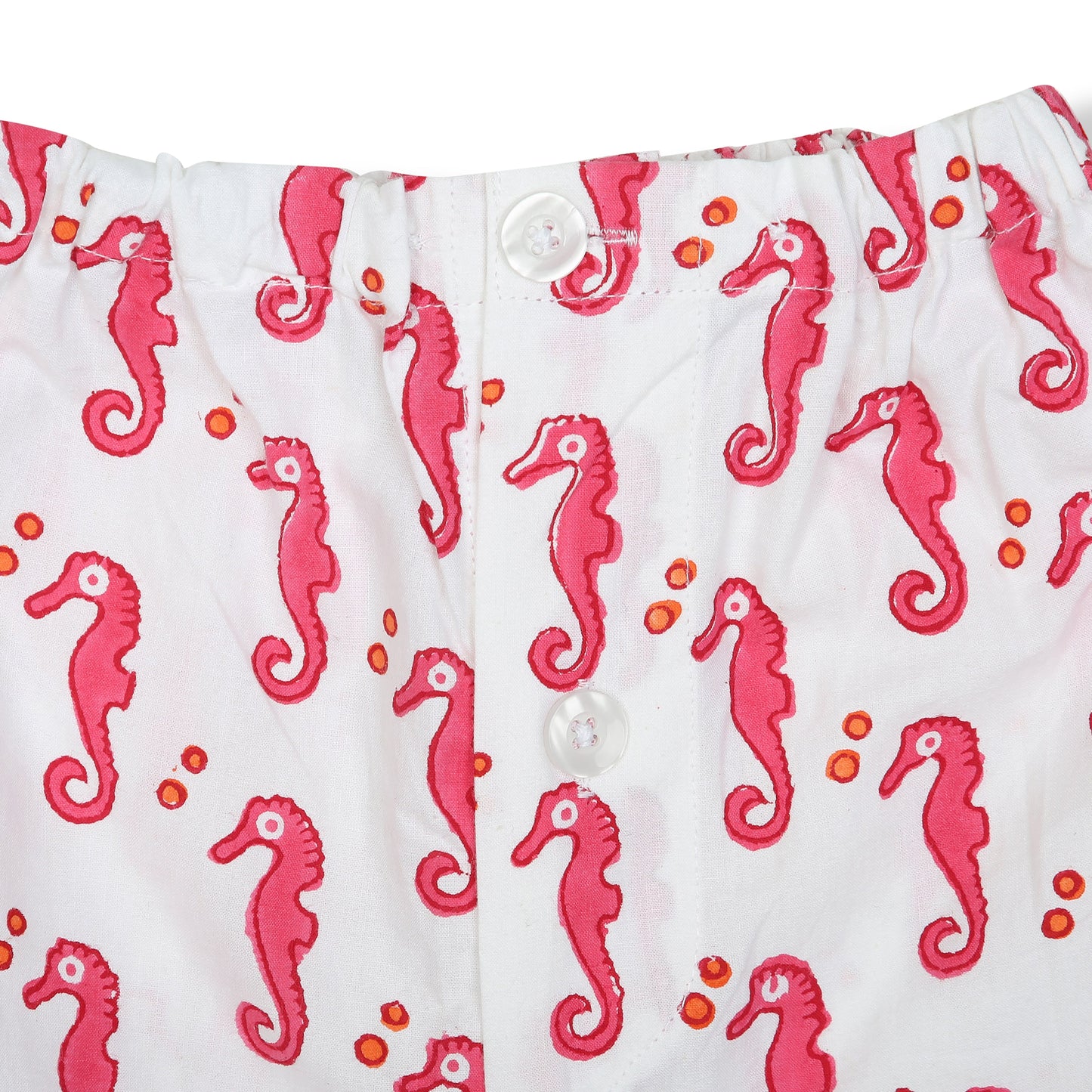 Gorgeous pyjamas hand printed with a pink or blue sea horse block design.