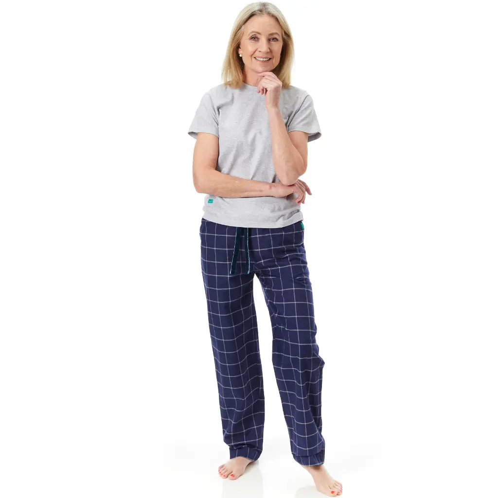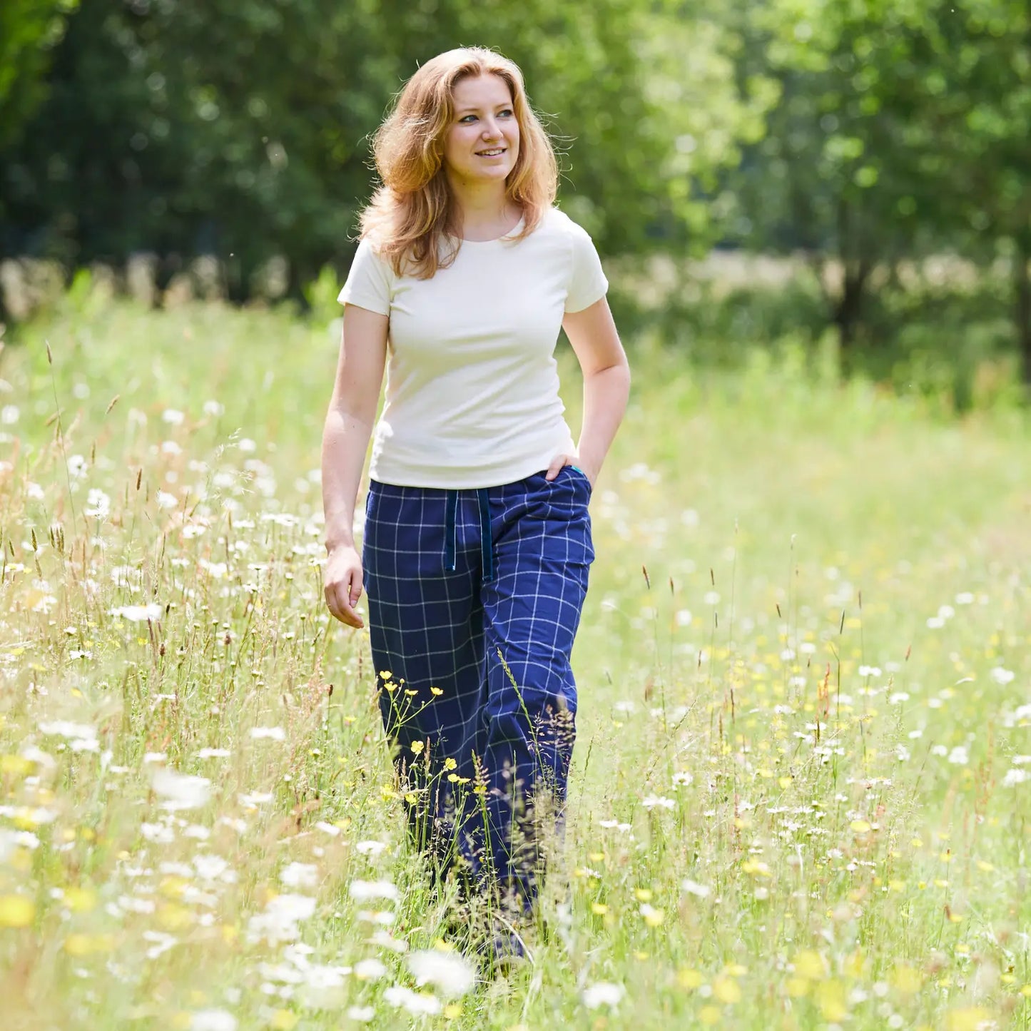 Supremely soft organic brushed cotton trousers that are both ethical and versatile. This blue with a subtle grey line is an understated must-have, designed to be worn both in and out of the home.