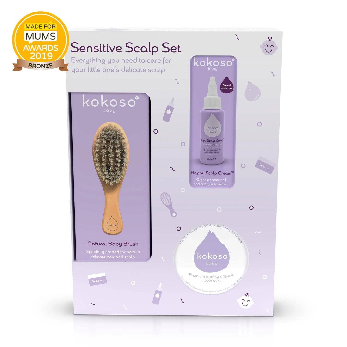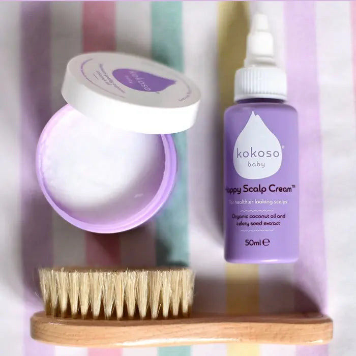 This beautiful set contains three of our award-winning natural products designed to balance the microflora of baby’s scalp with kind, soothing ingredients. Organic coconut oil restores moisture, organic aloe vera calms irritation, and naturally active celery seed extract reduces sebum production.