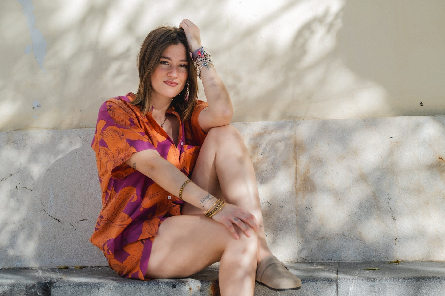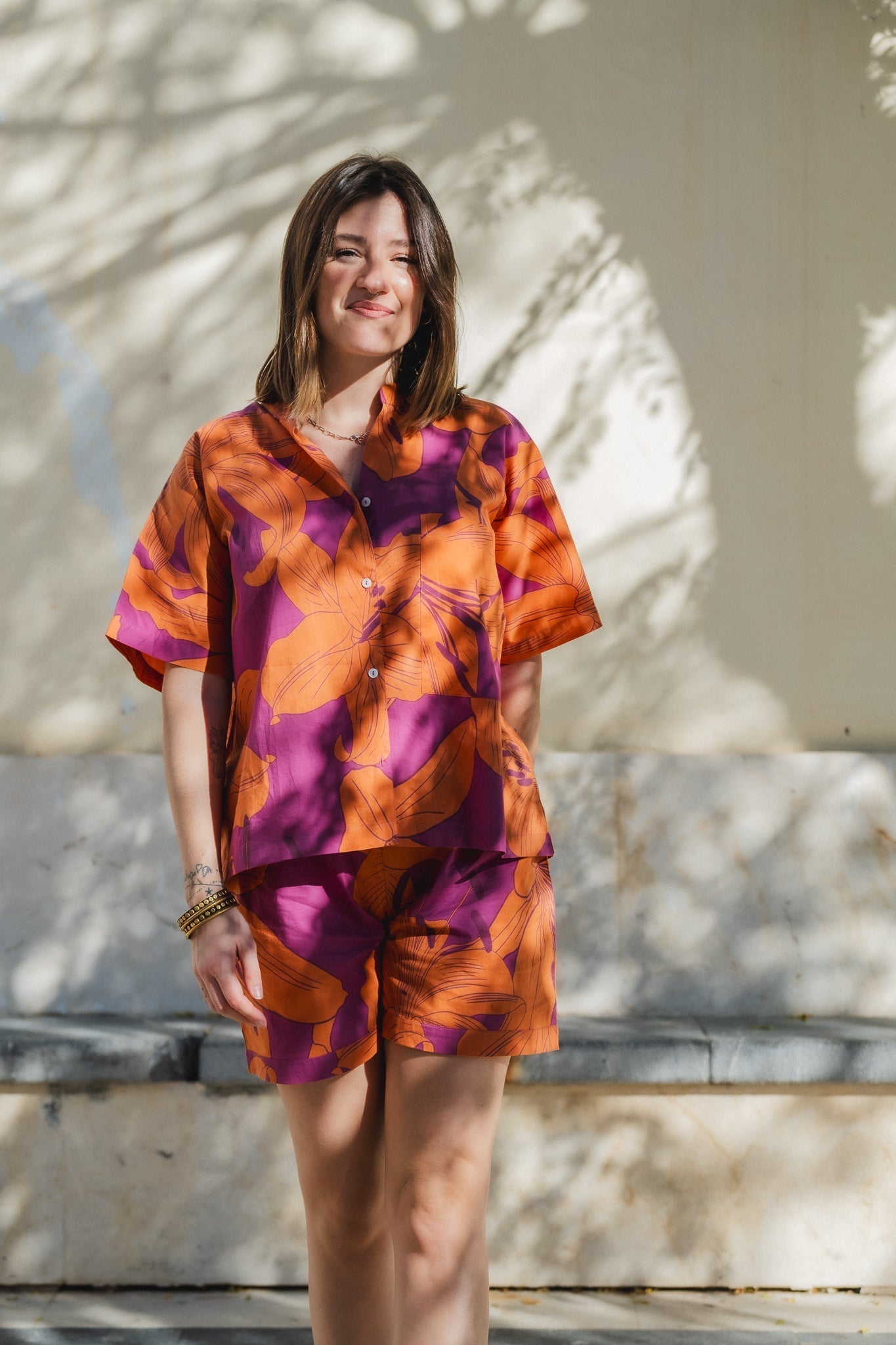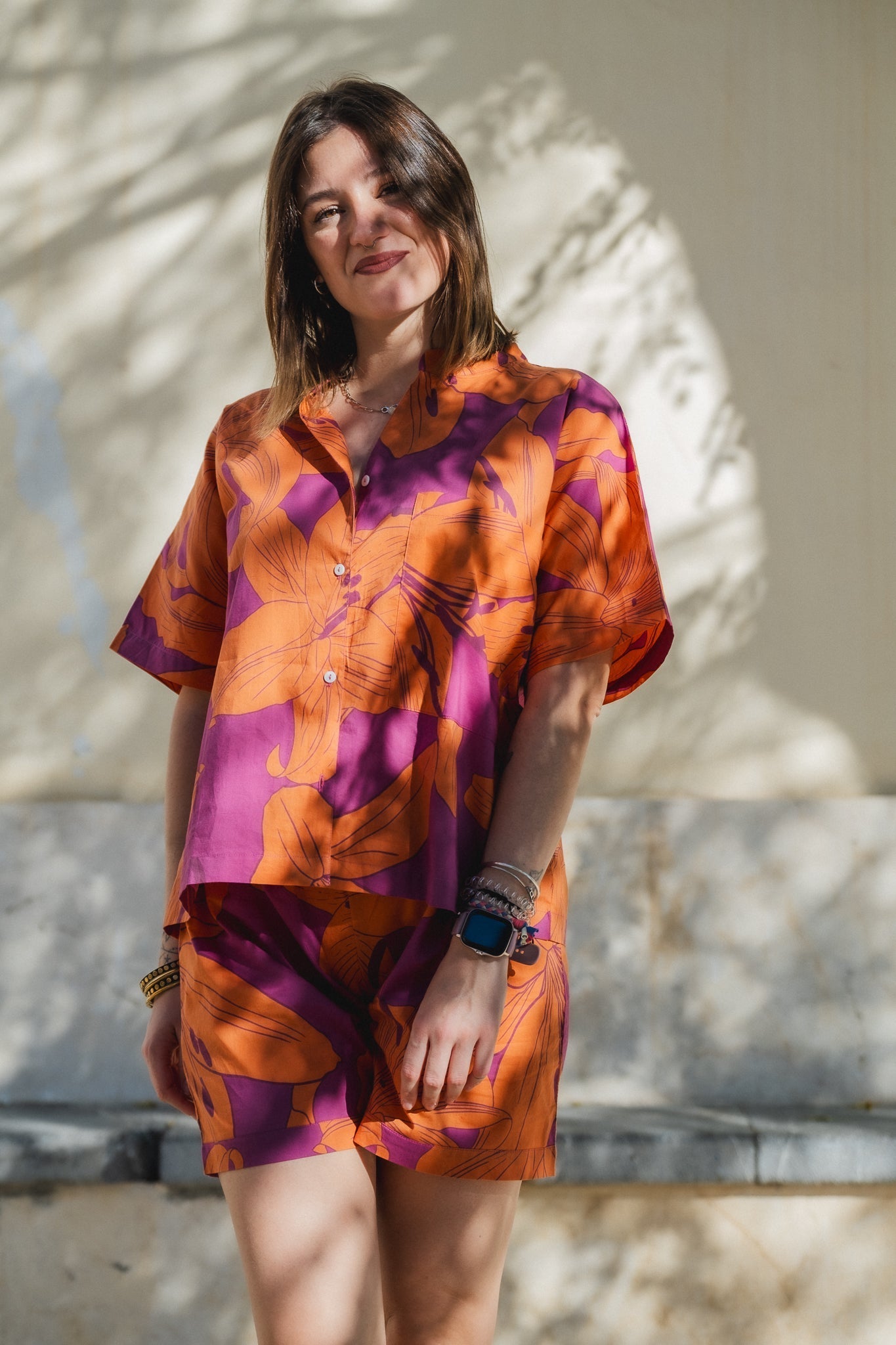 Introducing the ultimate bedtime essential - our bold flower print pyjama shorts in an eco-friendly pink and orange combo! Crafted with love and care, these PJs are not only incredibly stylish and comfortable but also kind to our planet.