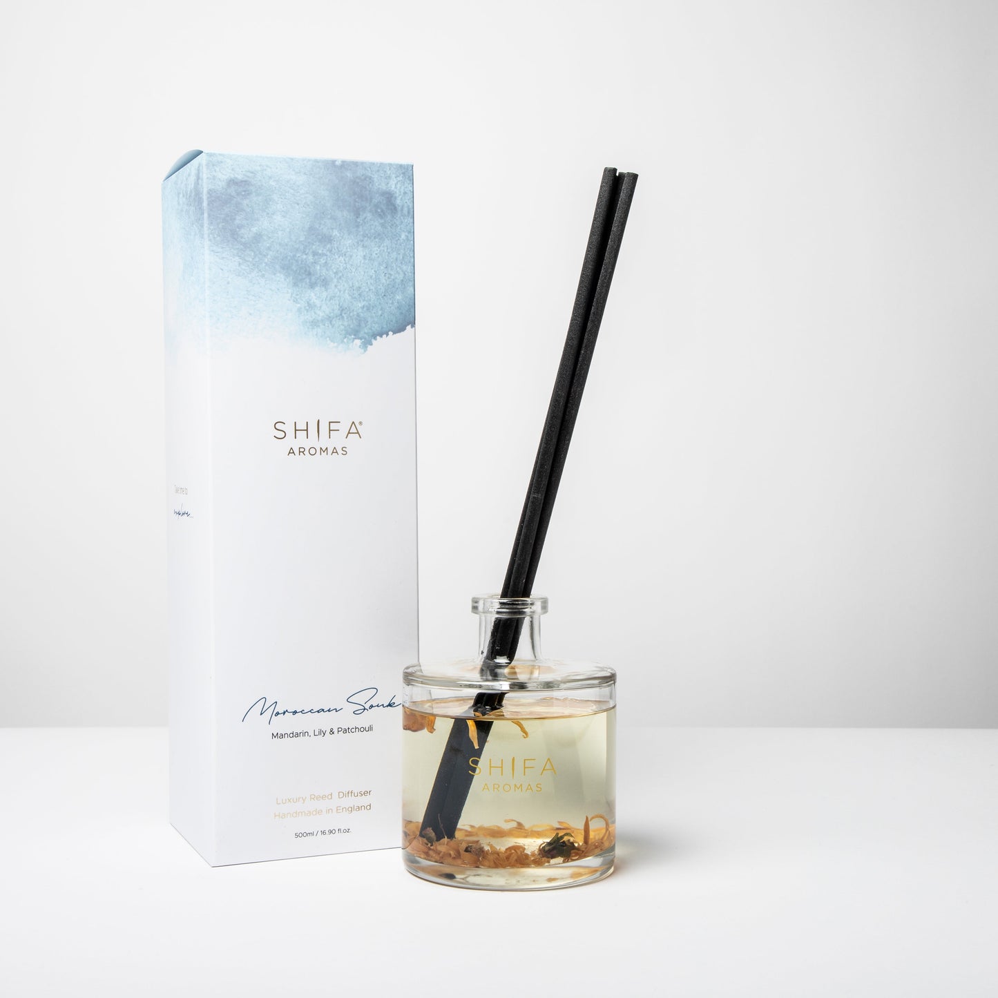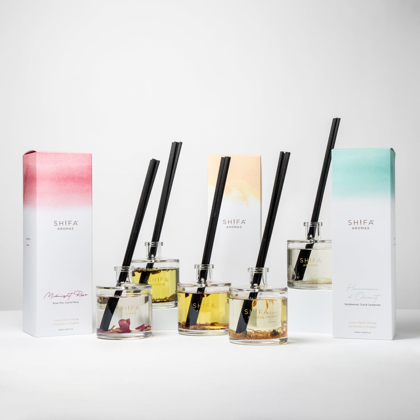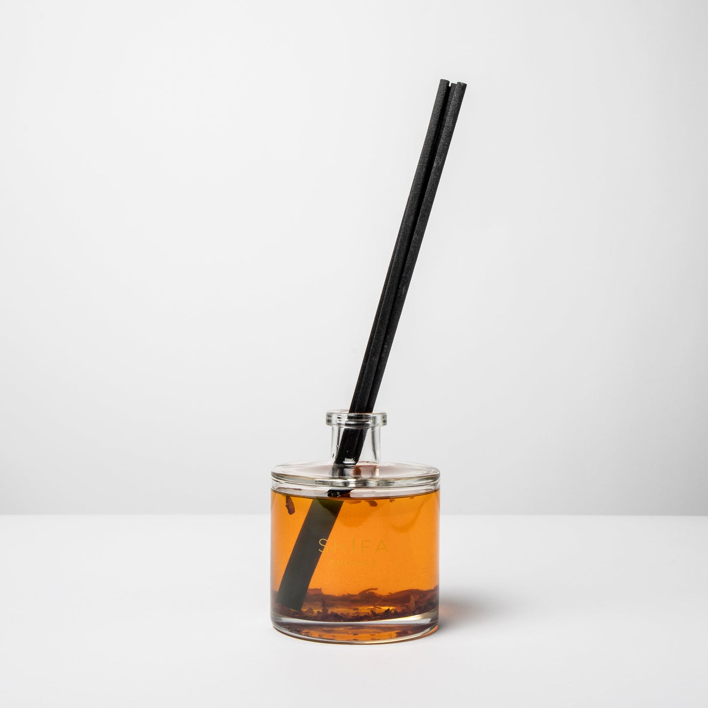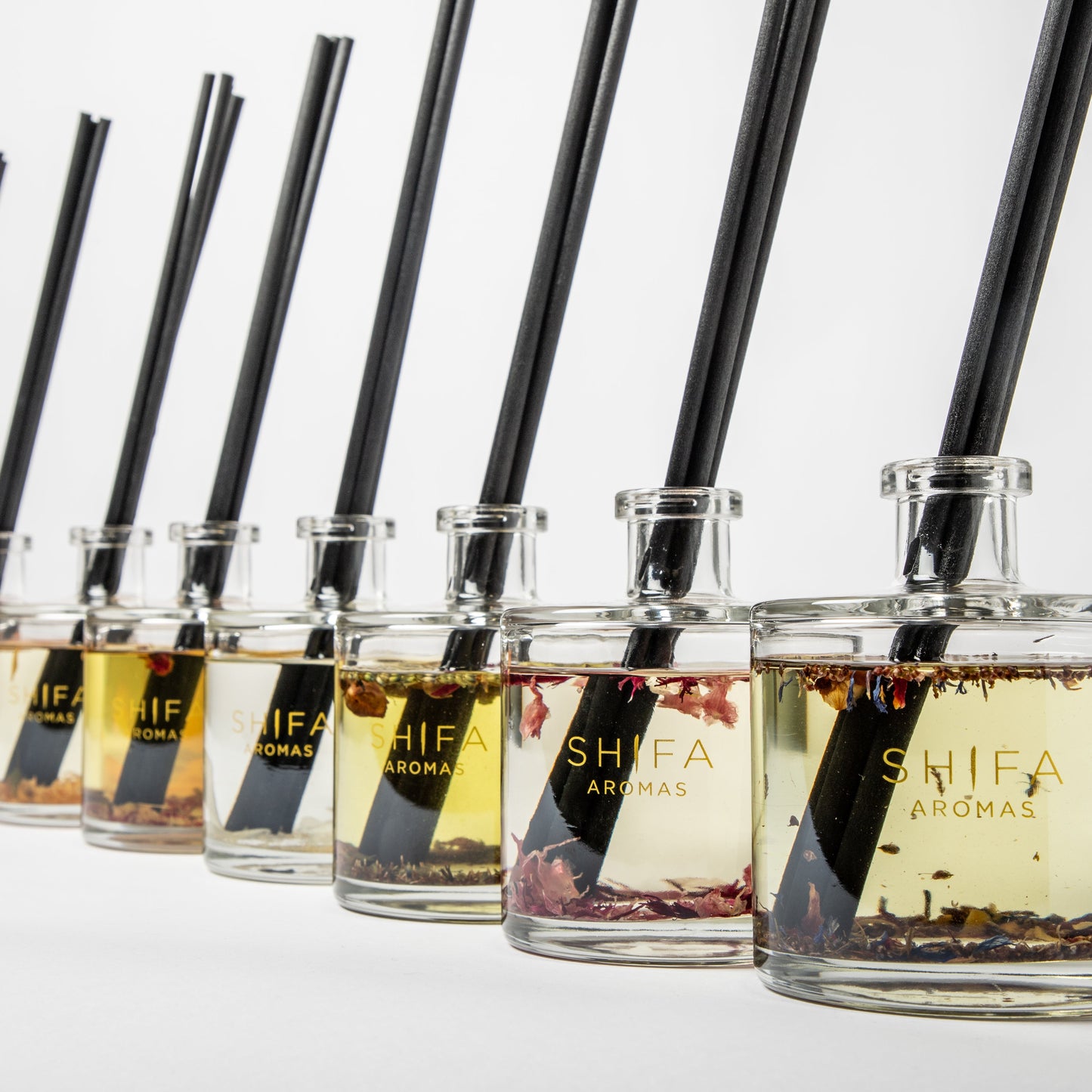 Our diffusers are infused with natural botanicals including resins, flowers or woods within a plant based base that gives a full bodied strength to the fragrance allowing it to last longer and is visually captivating.