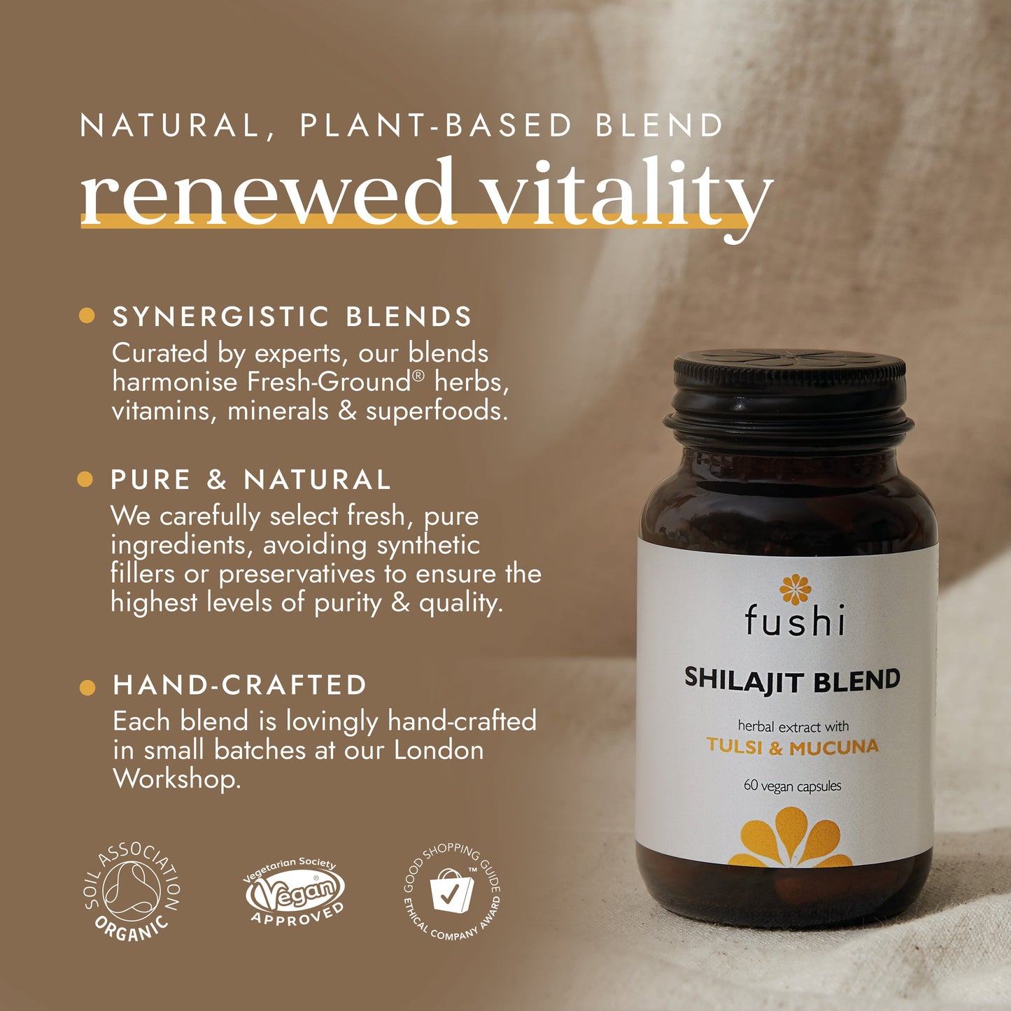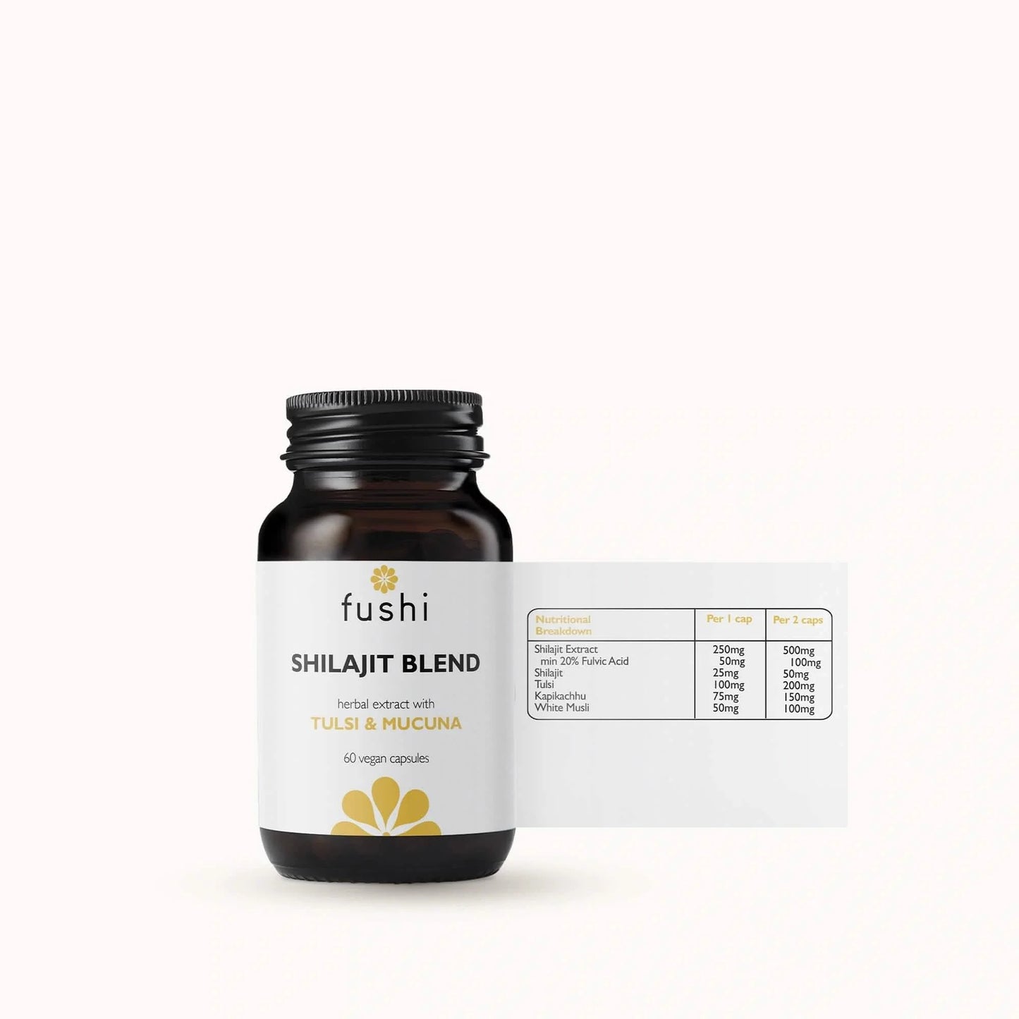 KEY INGREDIENTS: High-strength Fresh-Ground® Shilajit, with 20% Fulvic Acid minimum & Fresh-Ground® Tulsi, Kapikachhu and White Musli herbs.