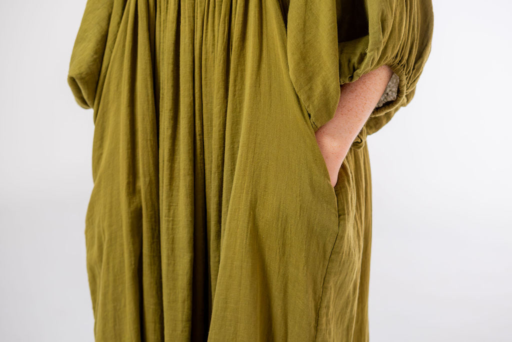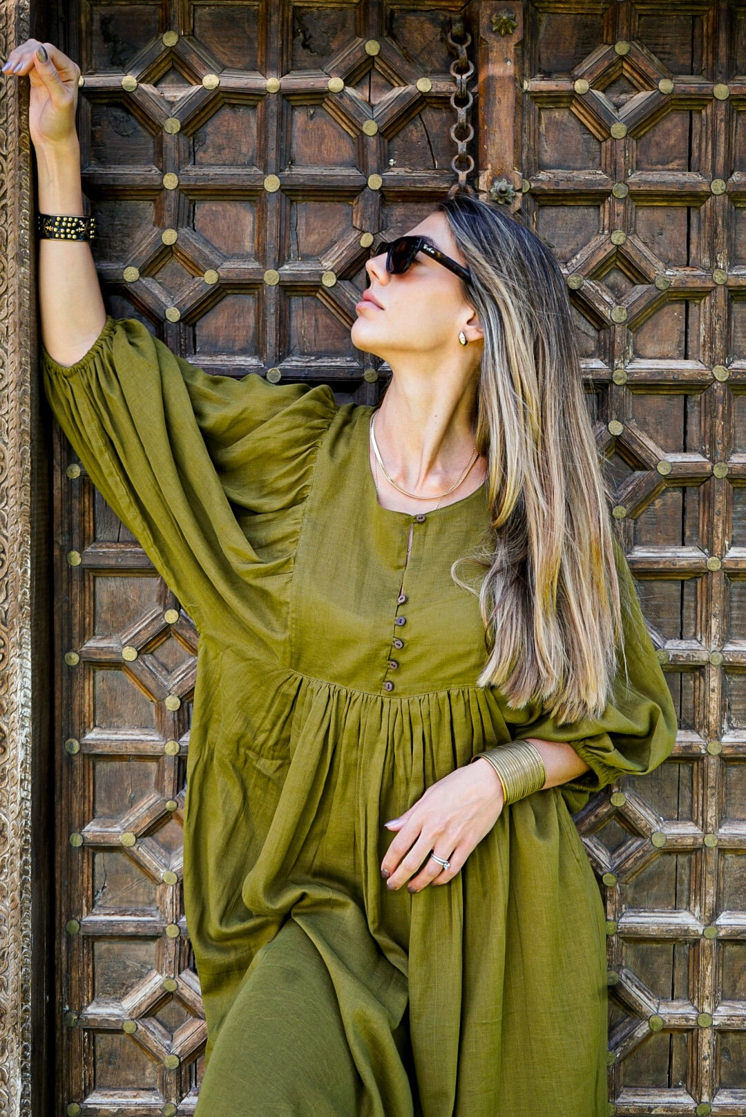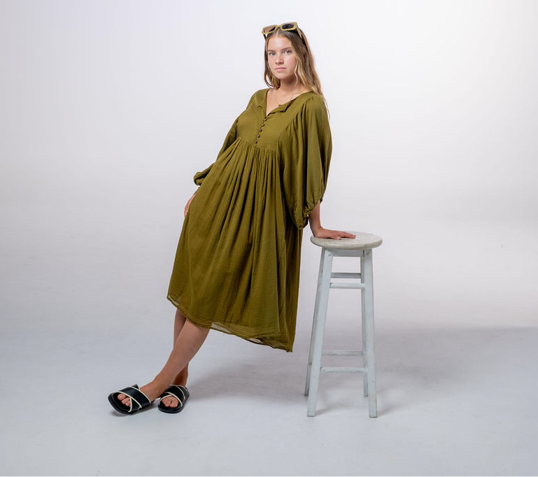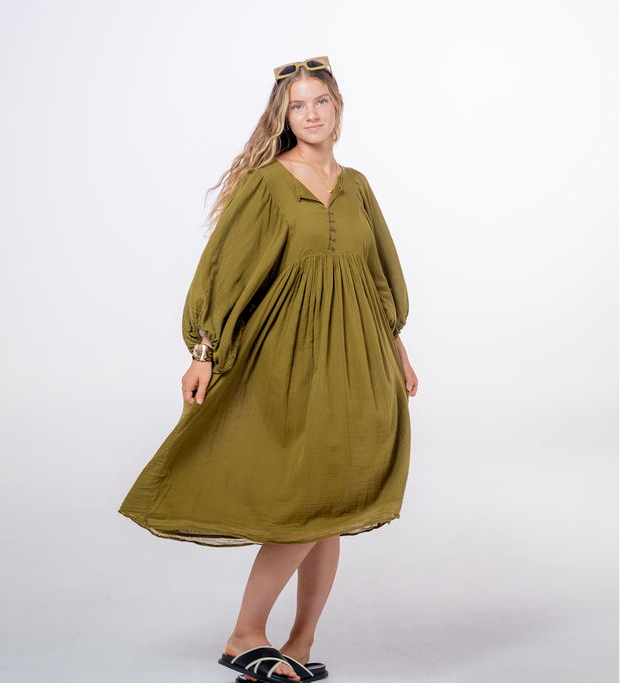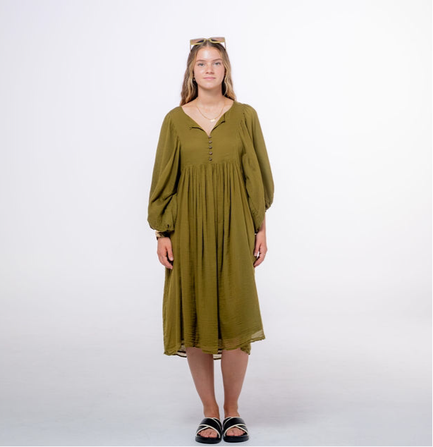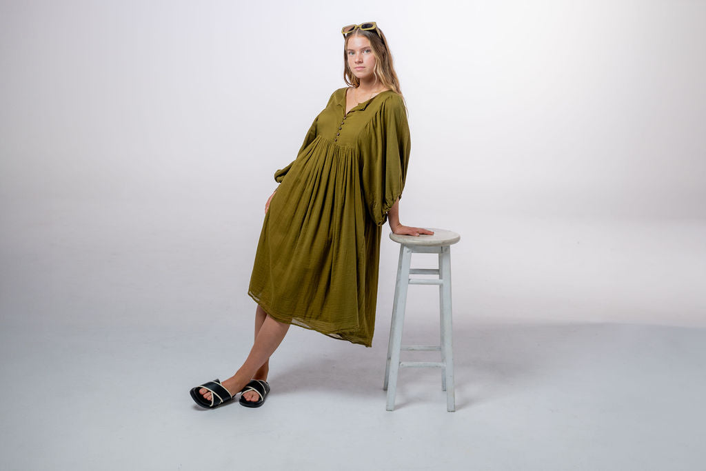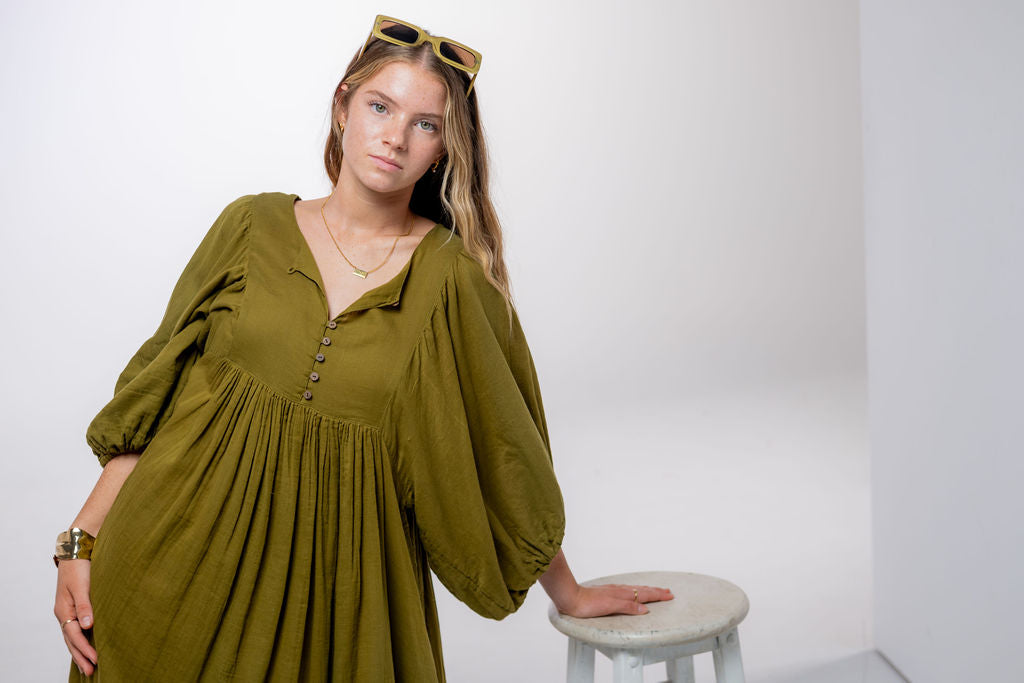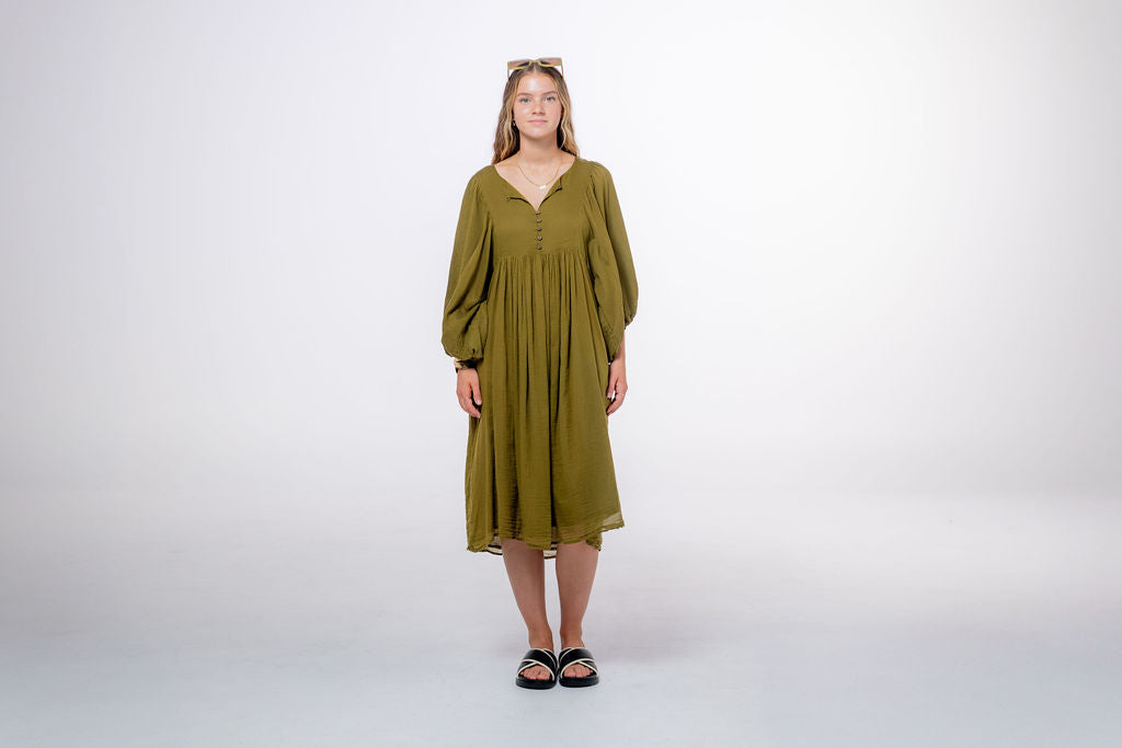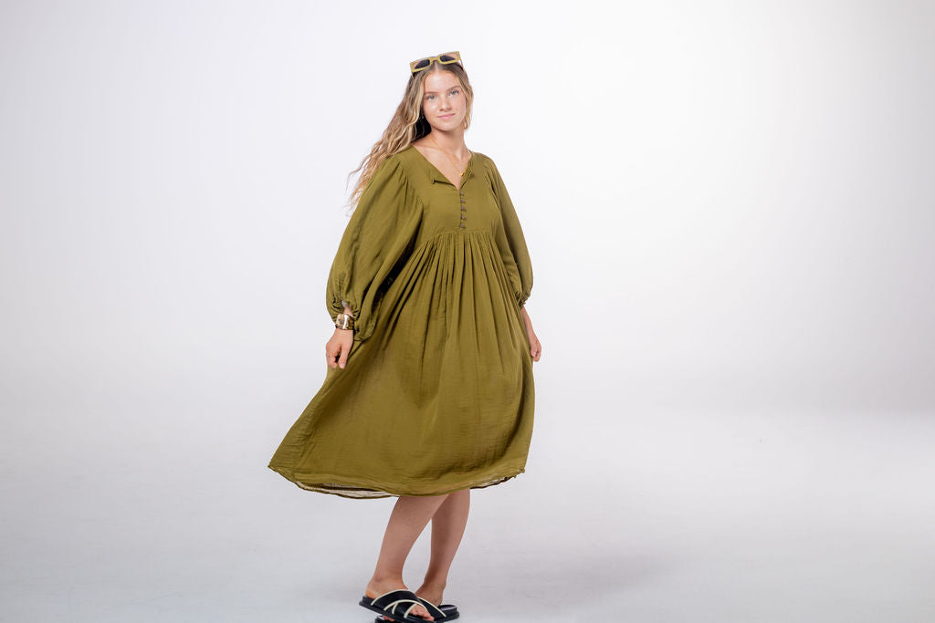 Part of our Pasha Collection—where luxury meets softness—this dress is made from double-layered voile, offering a lightweight, ultra-comfortable feel. The earthy olive green tone is complemented by charming small wooden buttons, adding a natural touch, while the voluminous sleeves bring a sense of effortless elegance. Designed with a mid-calf length and a relaxed, floaty silhouette, it’s perfect for both casual and special occasions. And of course, it has practical pockets too! Pair it with matte gold accessories to enhance its timeless appeal, whether you're on holiday or attending an evening event.