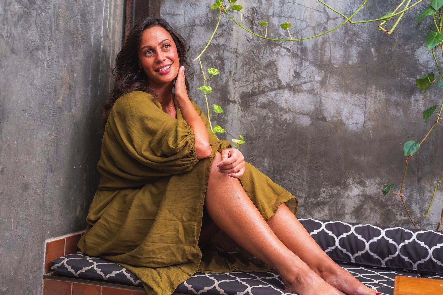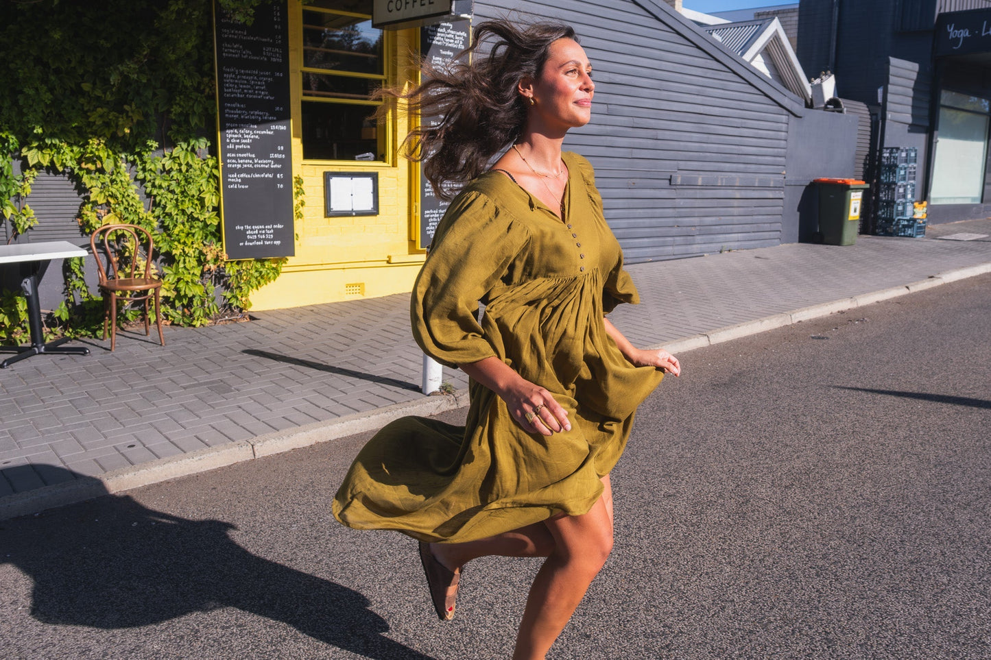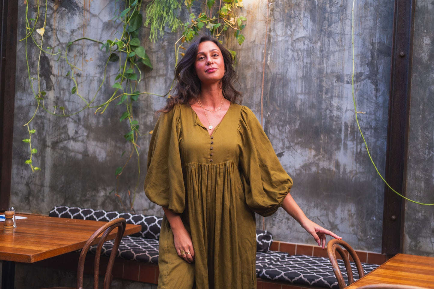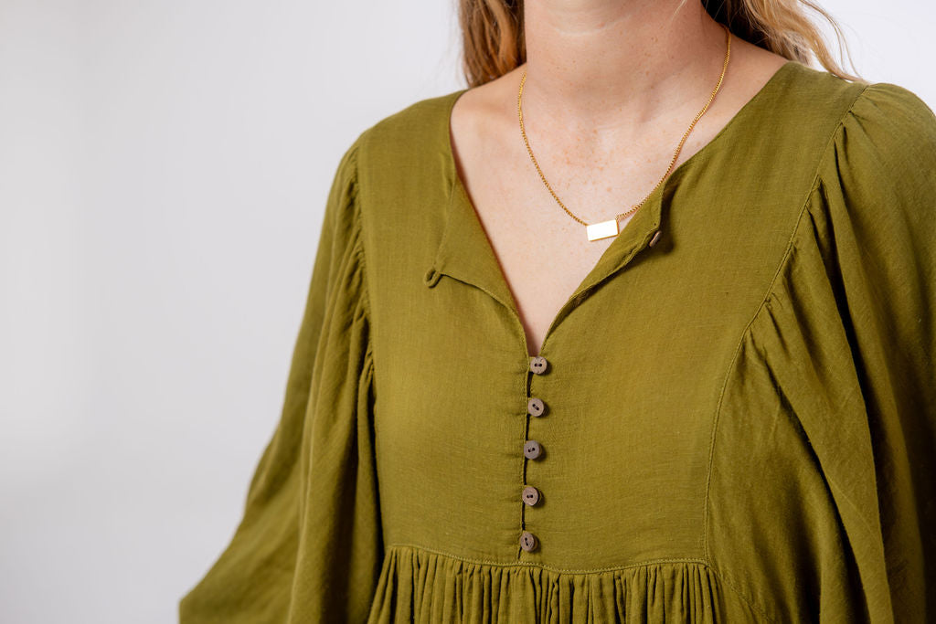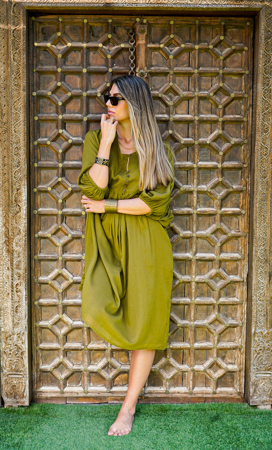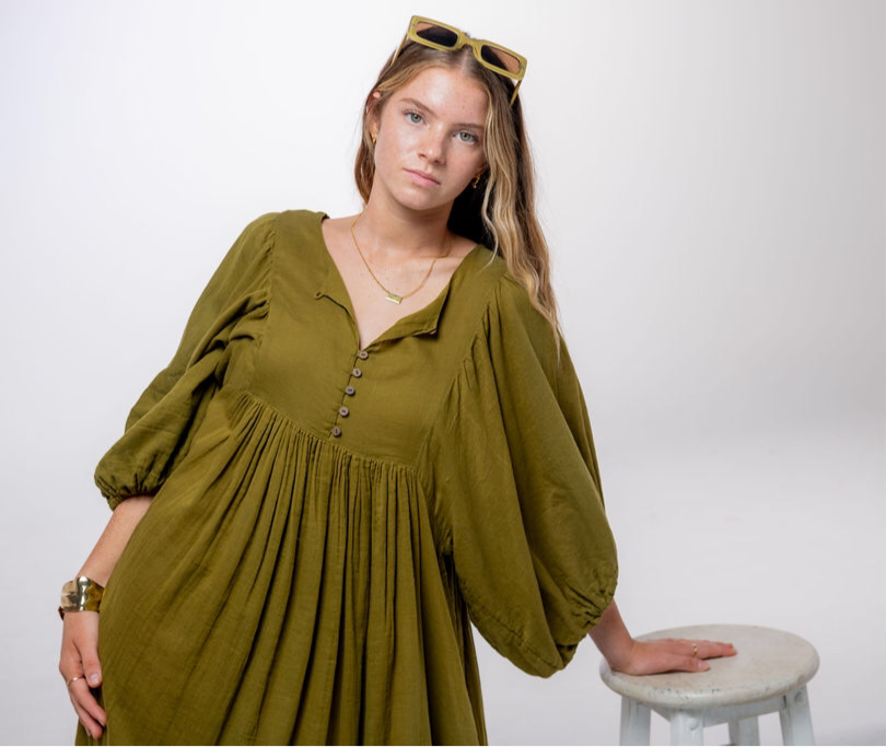Part of our Pasha Collection—where luxury meets softness—this dress is made from double-layered voile, offering a lightweight, ultra-comfortable feel. The earthy olive green tone is complemented by charming small wooden buttons, adding a natural touch, while the voluminous sleeves bring a sense of effortless elegance. Designed with a mid-calf length and a relaxed, floaty silhouette, it’s perfect for both casual and special occasions. And of course, it has practical pockets too! Pair it with matte gold accessories to enhance its timeless appeal, whether you're on holiday or attending an evening event.