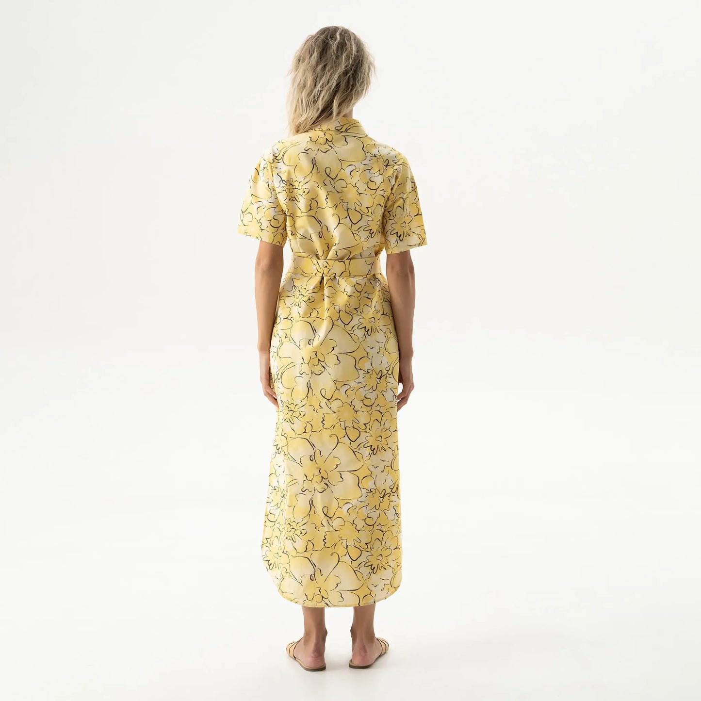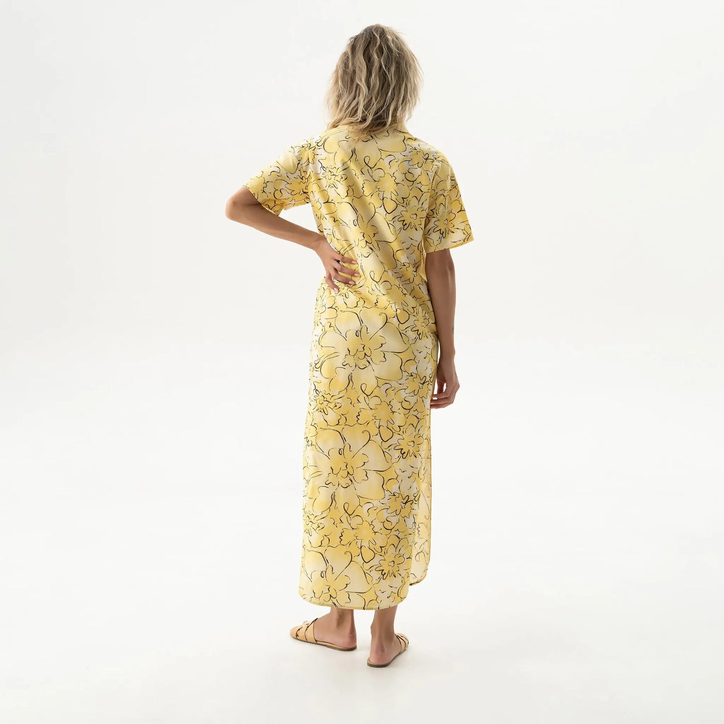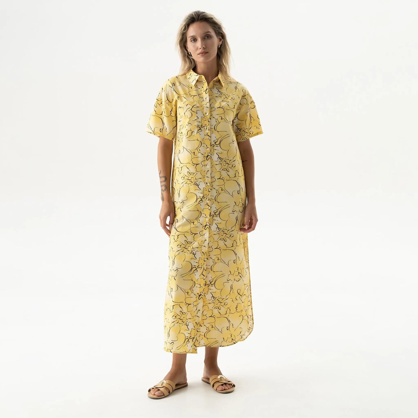 Silk Cotton Long Shirt Dress Yellow Flowers