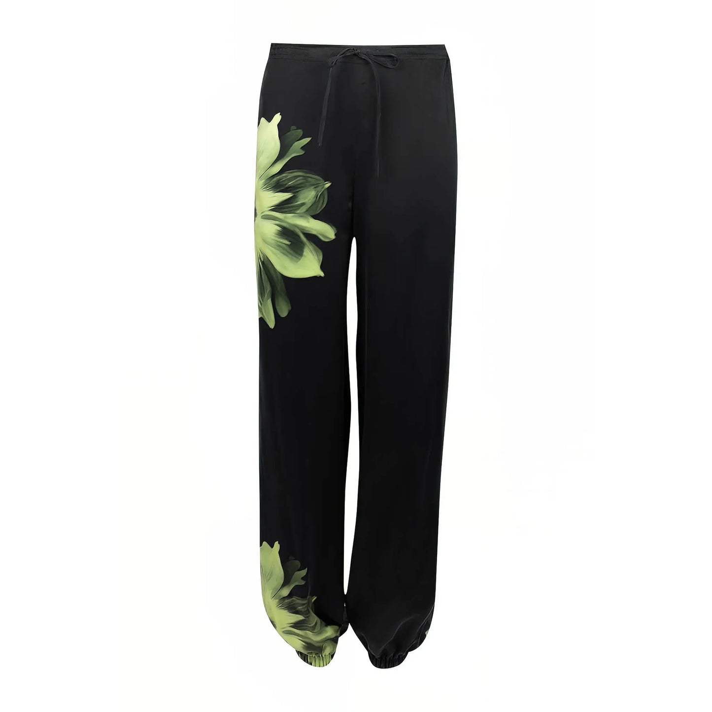 The Classy Silk Pyjama Pants by NOKAYA showcase a relaxed straight cut in a refined, essential black shade adorned with a beautiful design featuring cool matcha-coloured floating flowers, which evoke feelings of relaxation and self-reflection.