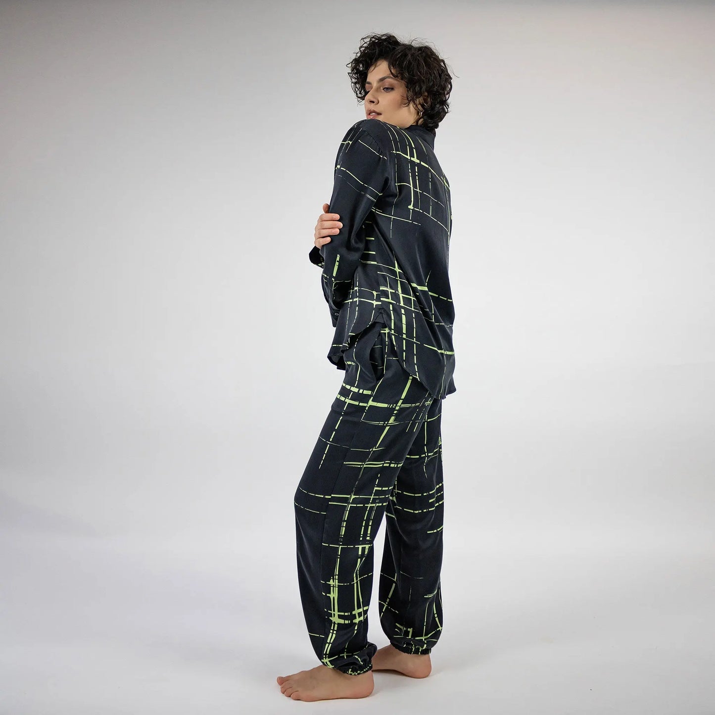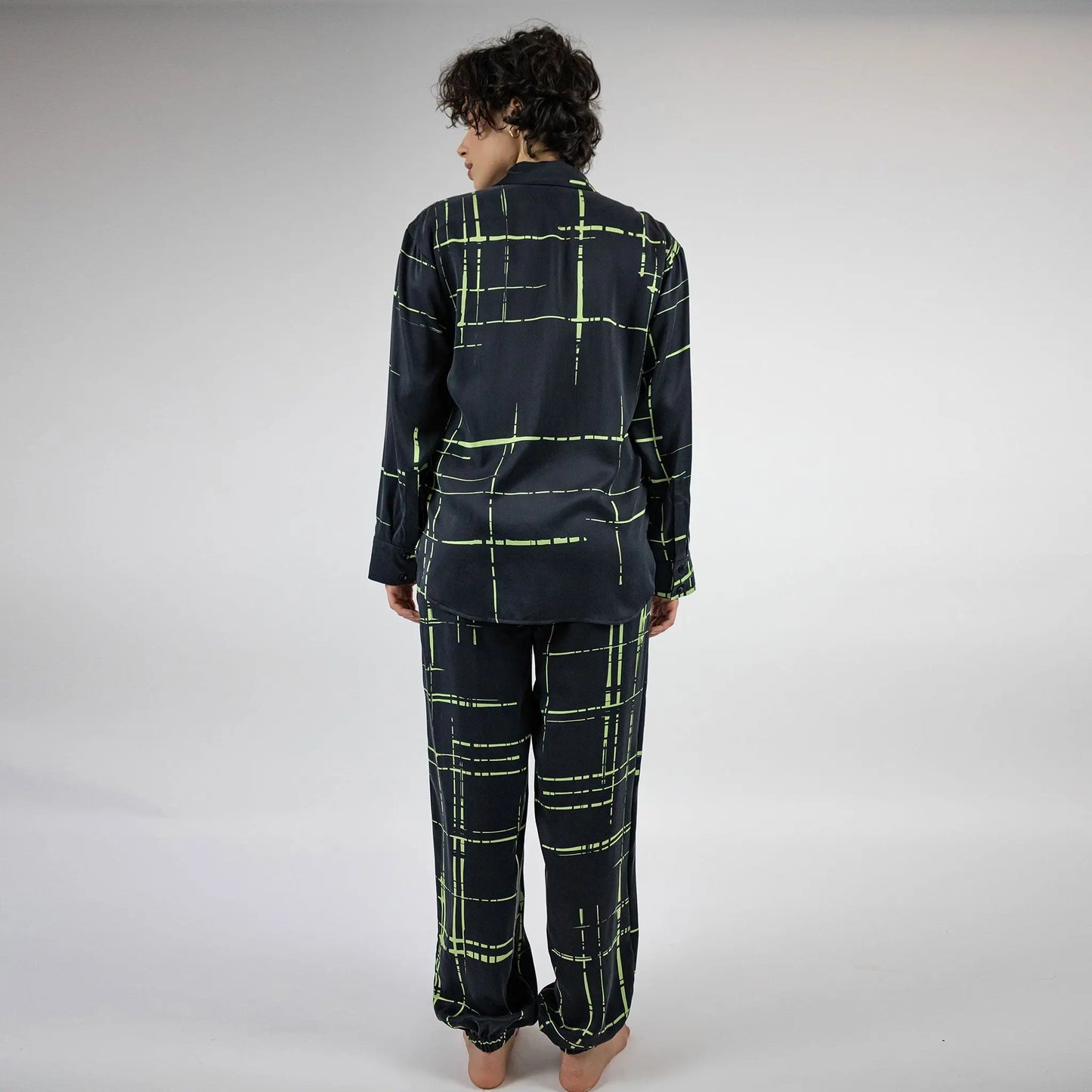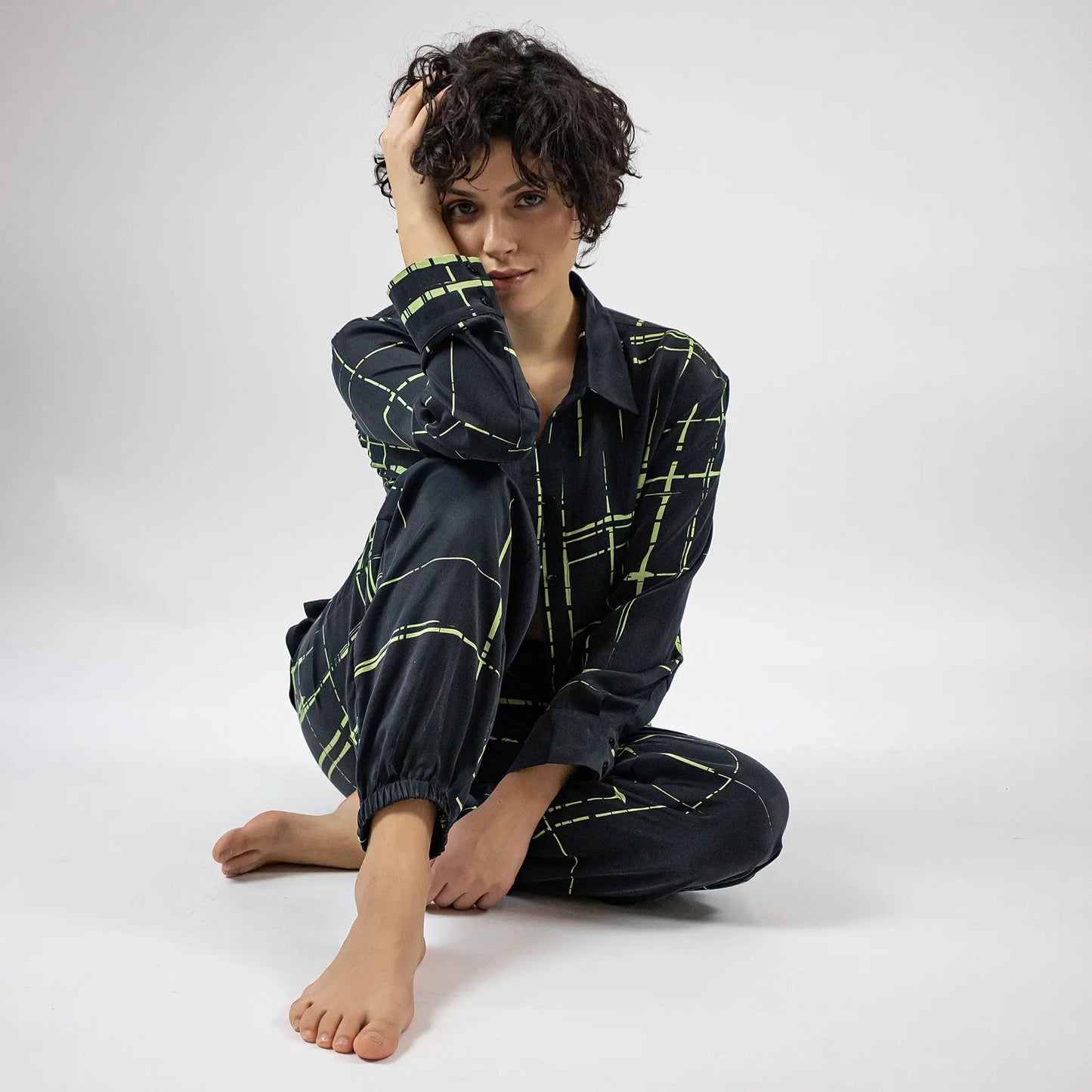 Two color combos evoke distinct feelings. Pastel Cool Matcha print on black silk brings a sense of rest and reflection to the mind. These designer bespoke prints let you confidently express yourself and stand out.