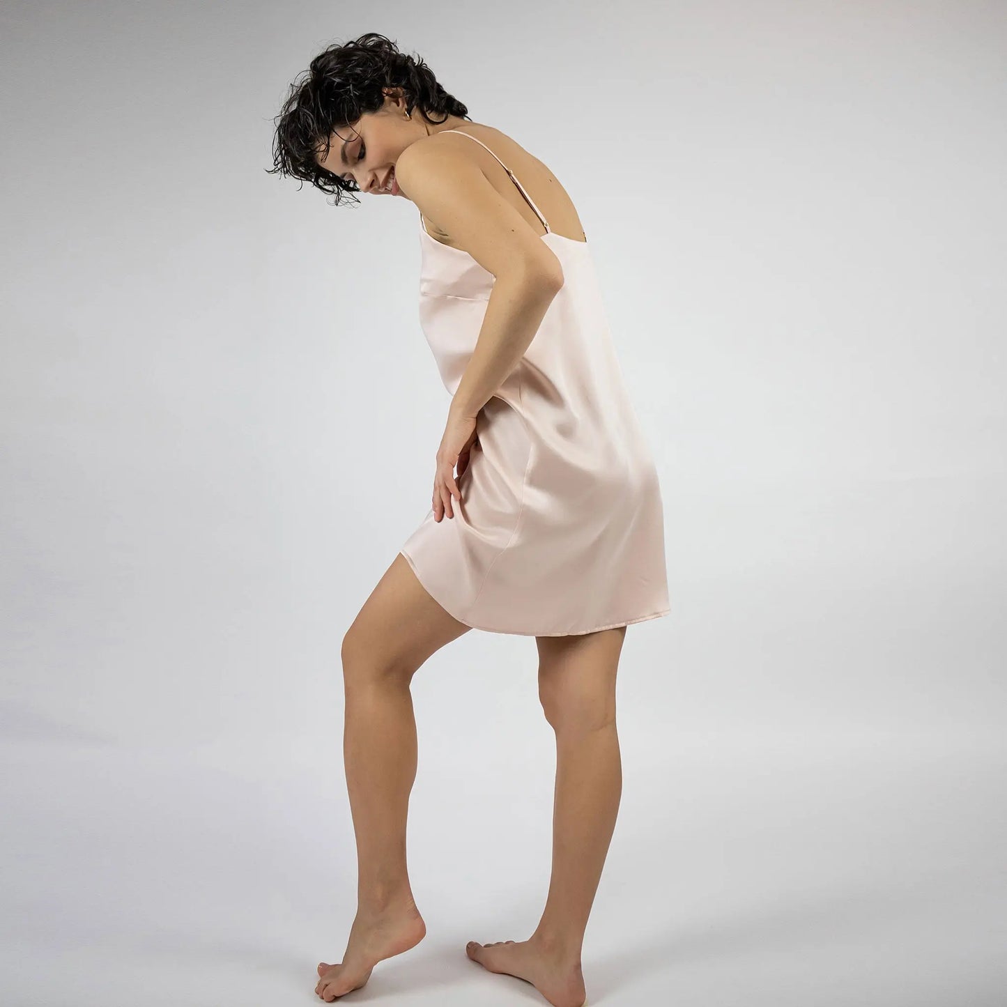 Regular price £60.80The Dreamscape Silk Slip Dress is meticulously cut from 100% Mulberry Silk, featuring a charming transcendent pink hue that exudes a sense of stability and comforting cocooning quality. The dress gracefully accentuates the figure and elegantly drapes to a mini length, creating a stunning silhouette.