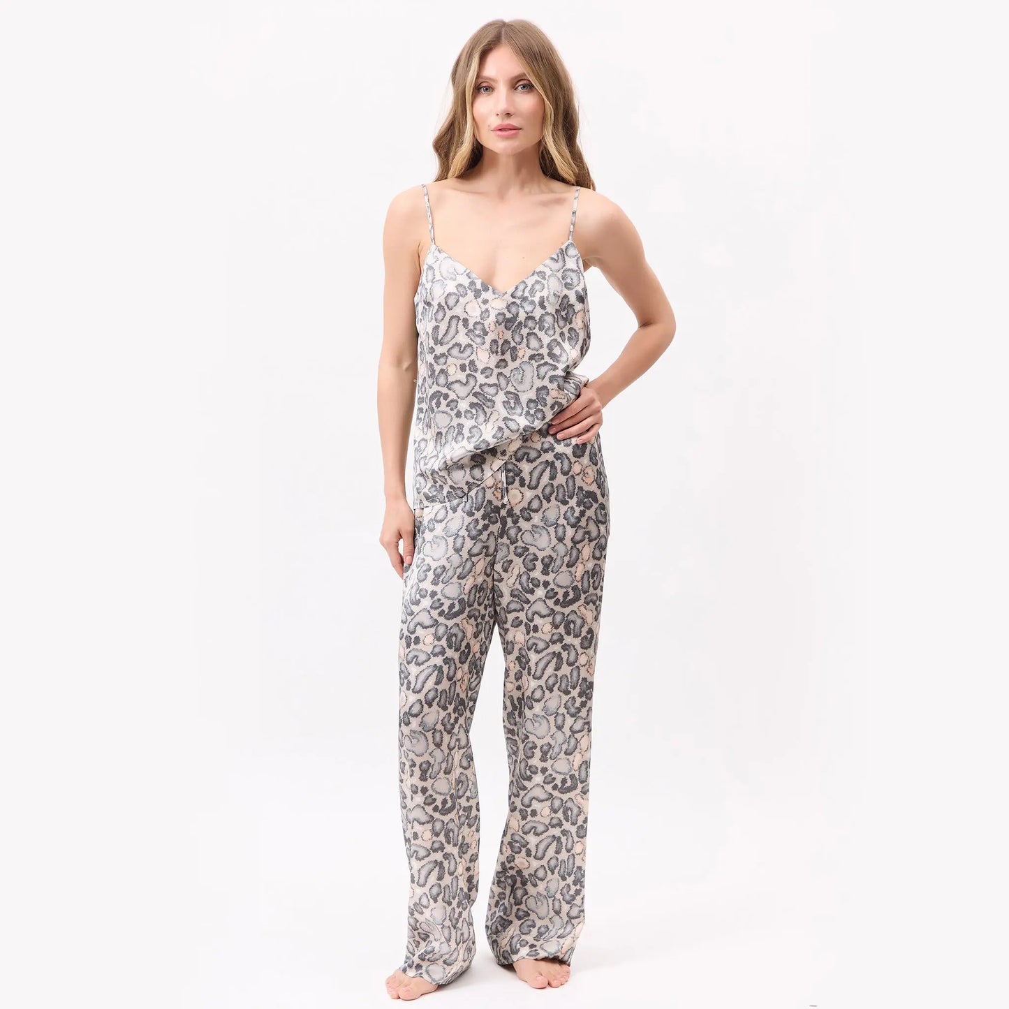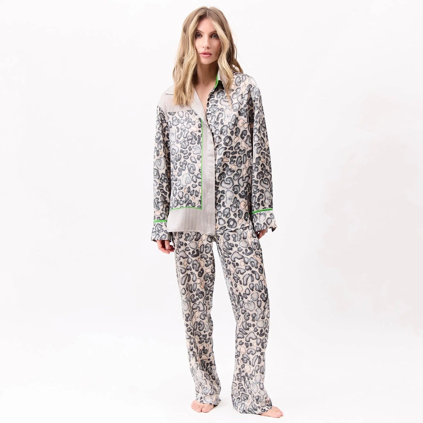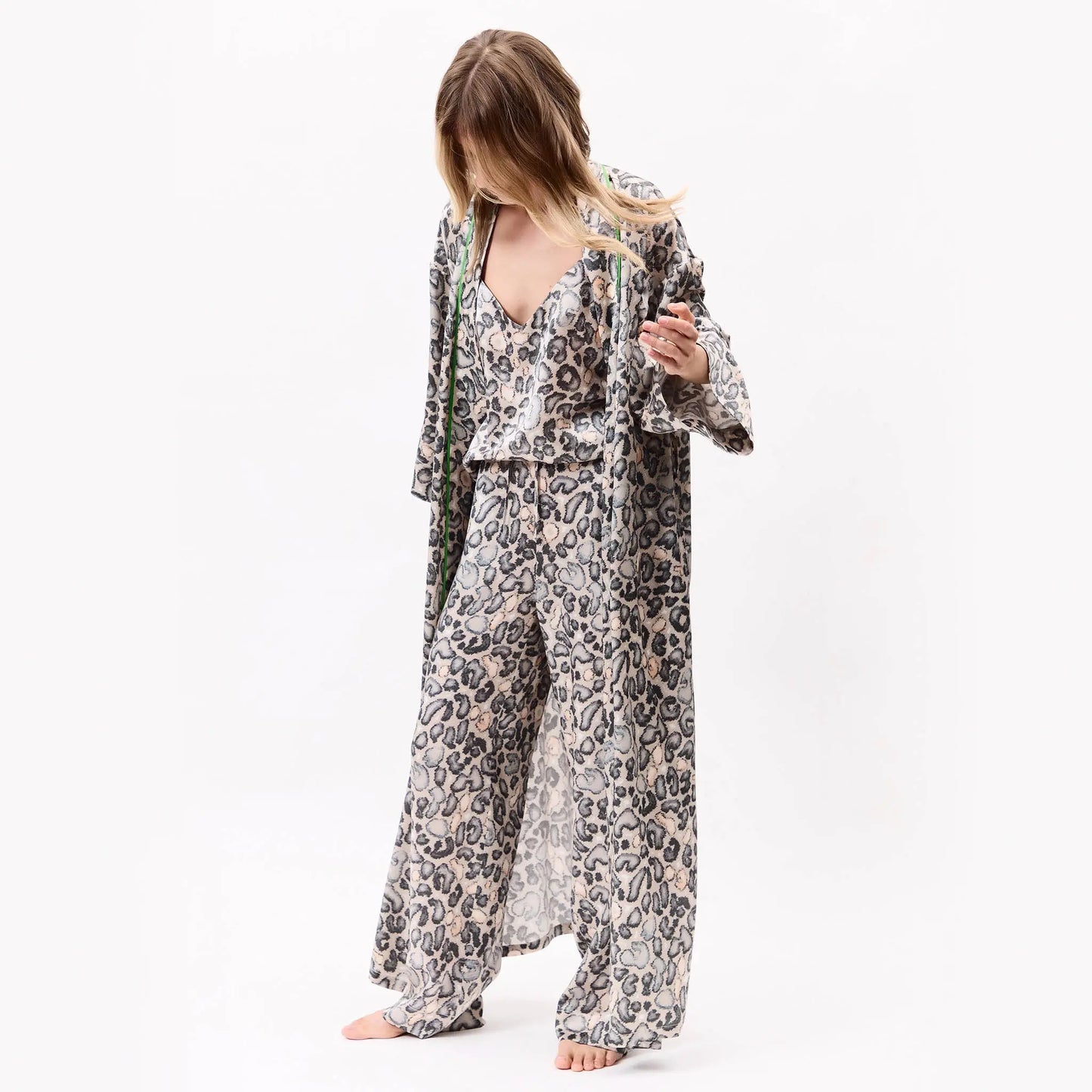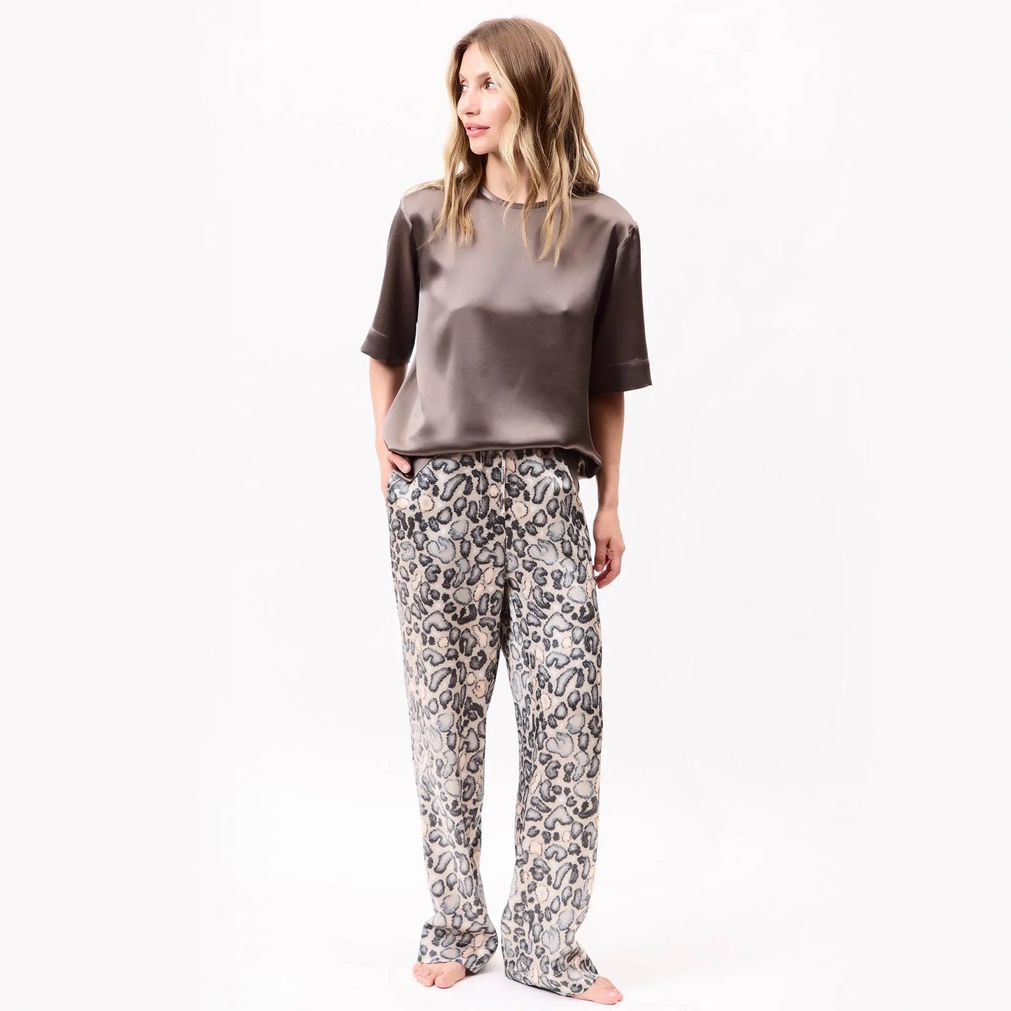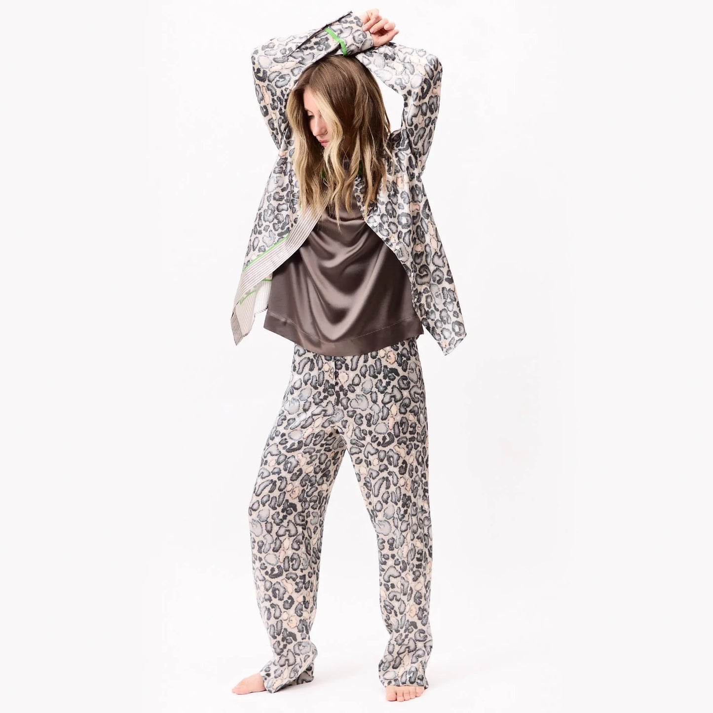 The fluidity of the silk meets a strong visual rhythm, with Snow Leopard as the base — bold yet grounded, creating presence without excess.