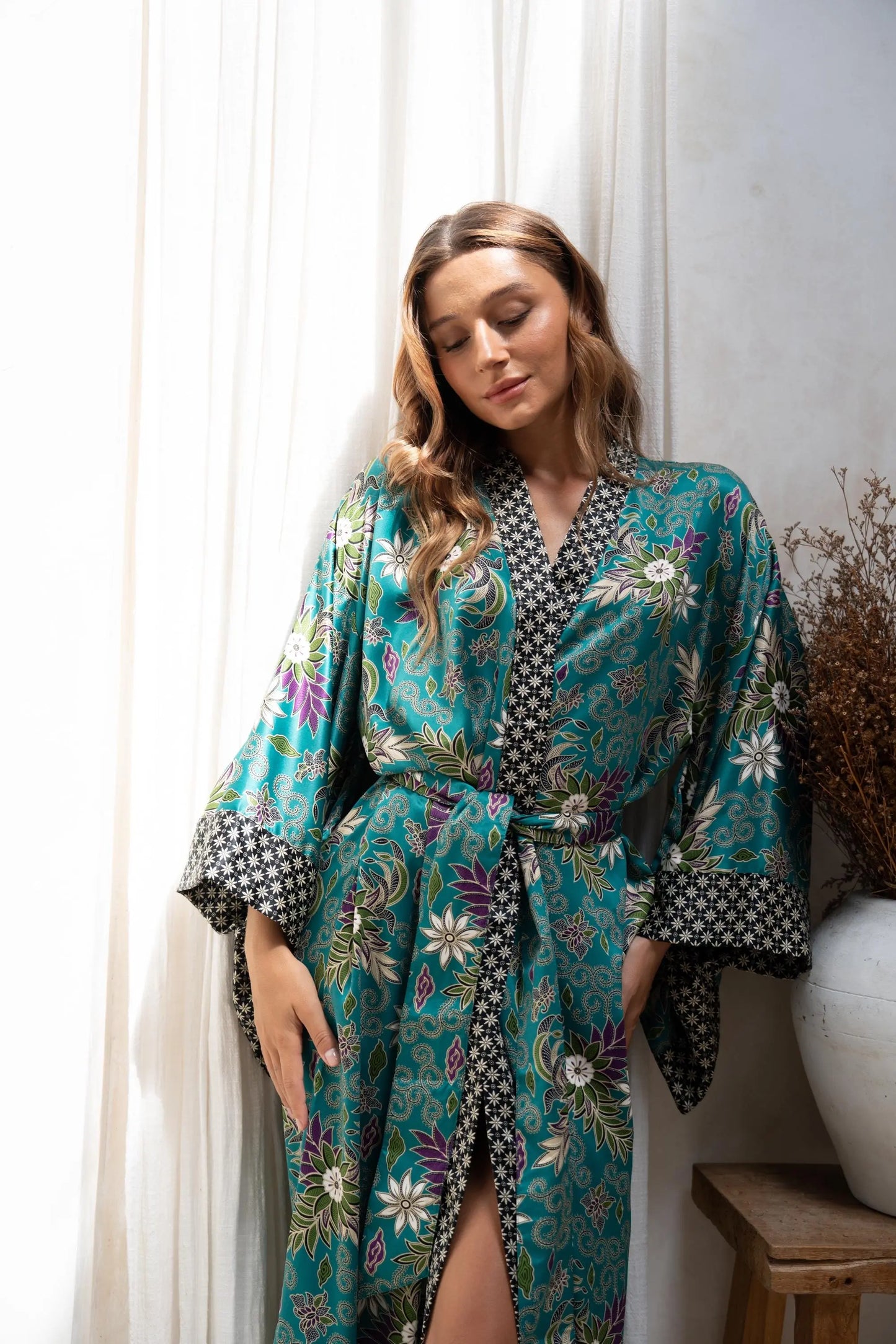 Handmade with care by local seamstresses in Bali, it features a relaxed, roomy fit, elegant 3/4 sleeves, hidden pockets, and an inner tie to keep it secure. It comes complete with a matching belt to cinch the waist for an effortlessly flattering look. This is more than a robe—it’s a keepsake designed to celebrate comfort, femininity, and craft.