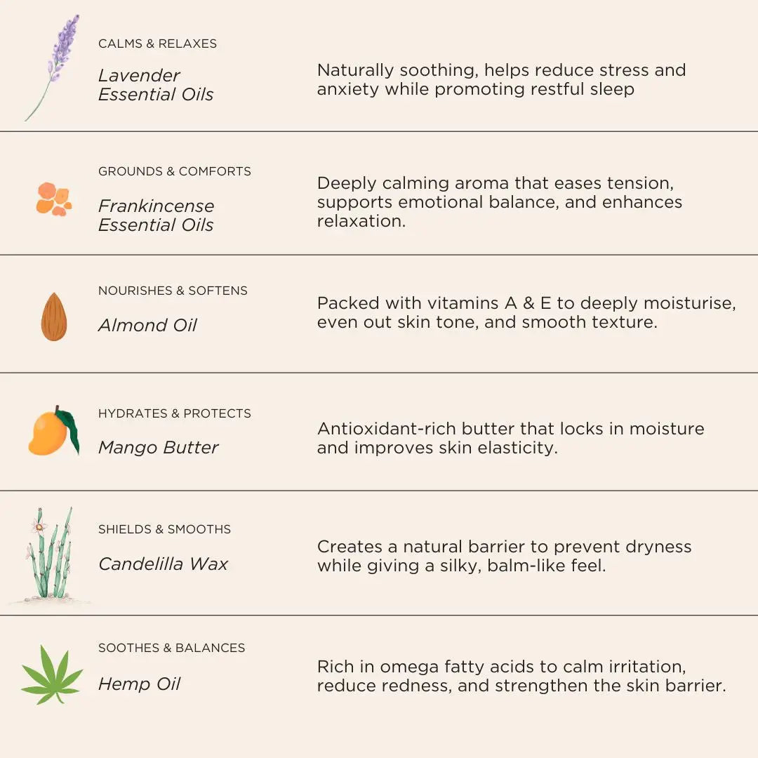 - Rich, Plant-Derived Formula: A vitamin-rich blend of Hemp oil, Mango Butter, and pure essential oils that feels wonderfully soothing on the skin.