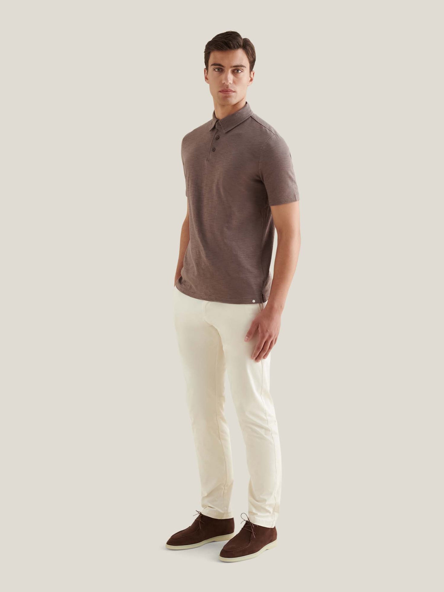Clean lines. Textural finish. This short sleeve polo is cut from slub cotton jersey for a refined take on a casual essential. The fabric’s subtle irregularity adds character while keeping things breathable and light. Finished with tonal detailing and a grown-on placket, it stands alone with ease and layers neatly under overshirts or jackets.