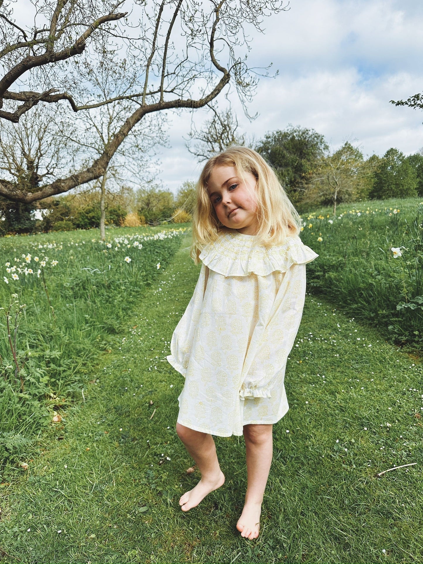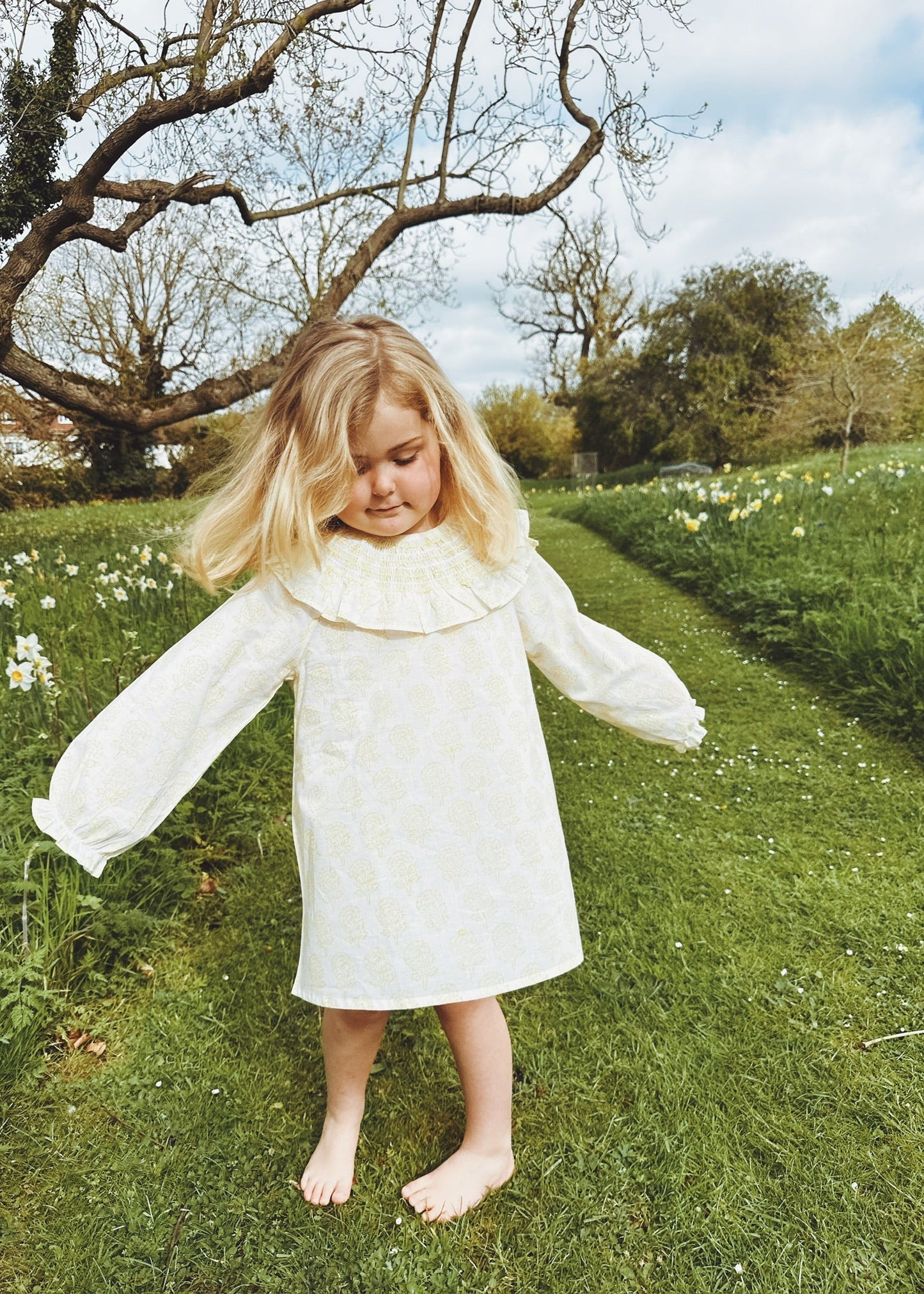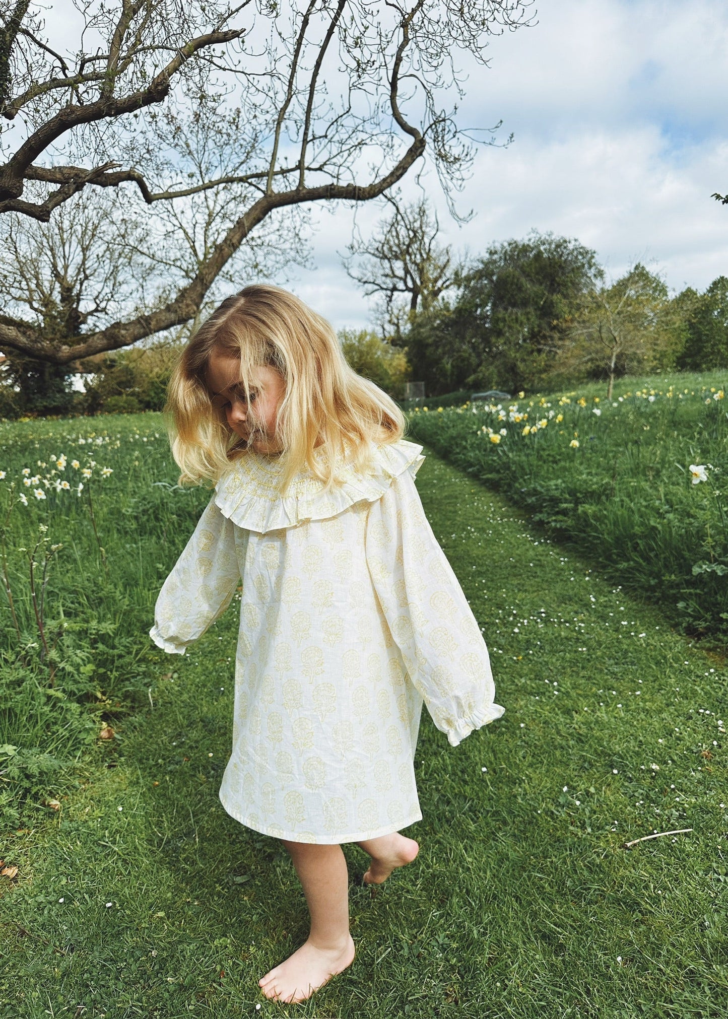 Our new smocked girls’ nighties are made to be worn from bedtime to playtime. Crafted from BCI cotton and hand block-printed in a delicate floral design, each one features a beautifully smocked frill collar and buttons down the back for a charming, easy fit.