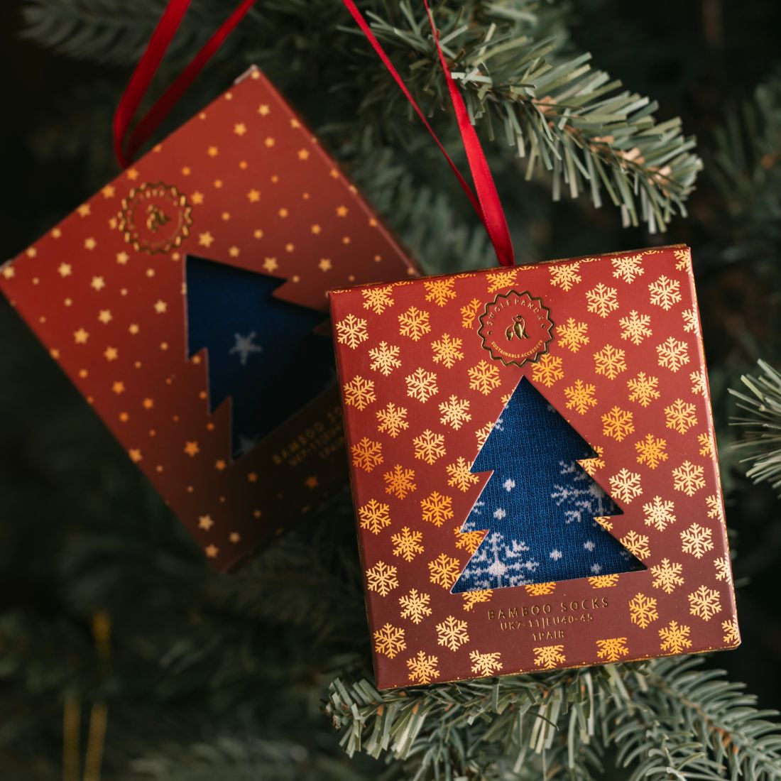 Are you looking for a unique present? Treat yourself or somebody special to this luxury gift box containing a pair of our Snowflake Bamboo Socks. Complete with a ribbon, this box can be hung on a Christmas tree or as a decoration. They are knitted from our unique bamboo blend offering the subtle touch of stand out style.