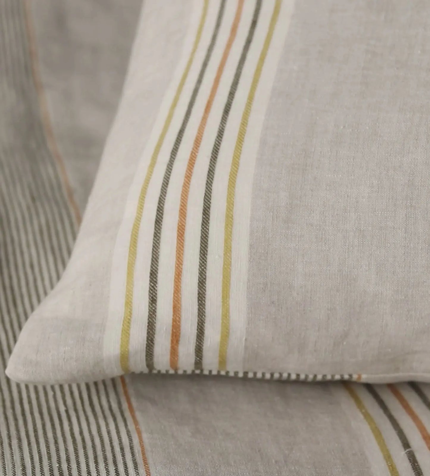 Our Sophie Stripe 100% Linen Pillowcase is a natural beauty, featuring vertical stripes in Dark Olive, Warm Amber, and Olive Oil set against a soft natural linen backdrop. Made in Portugal by our brilliant partners using carefully sourced yarns, Sophie combines craftsmanship, comfort, and timeless design. Finished with a deep 30cm envelope closure, this pillowcase offers a relaxed yet refined look — and the effortless breathability only pure linen can provide.