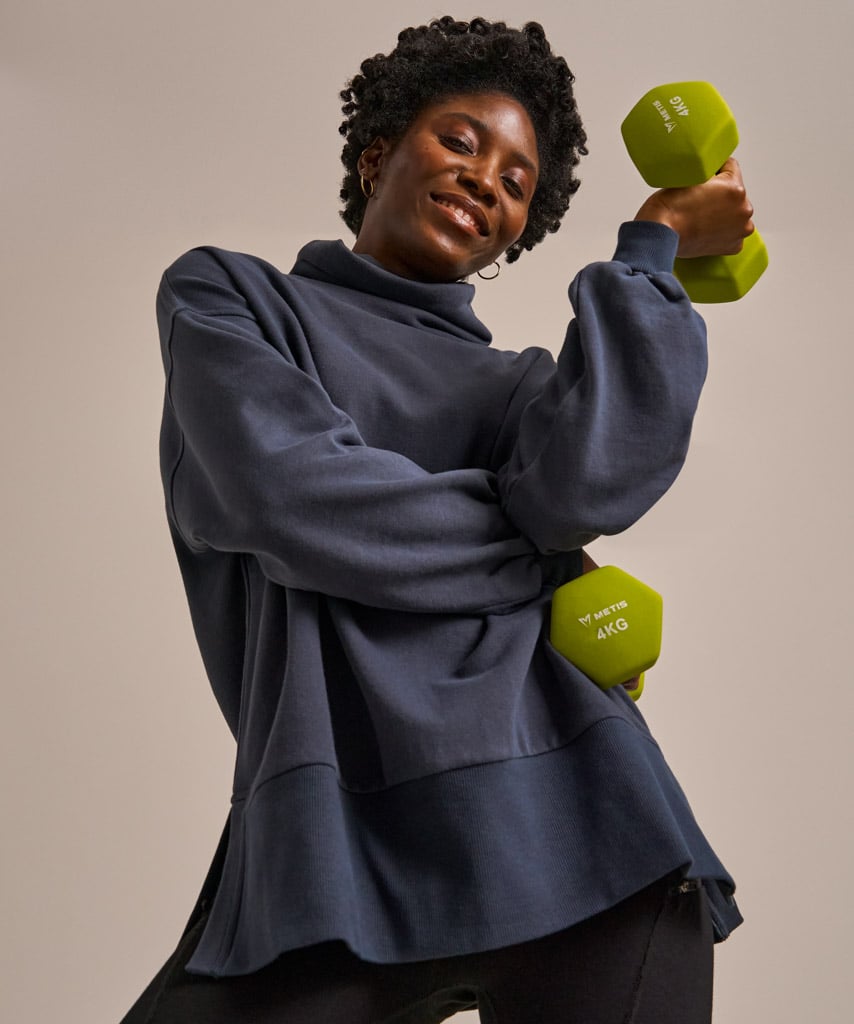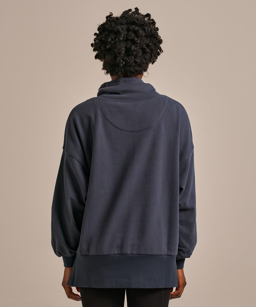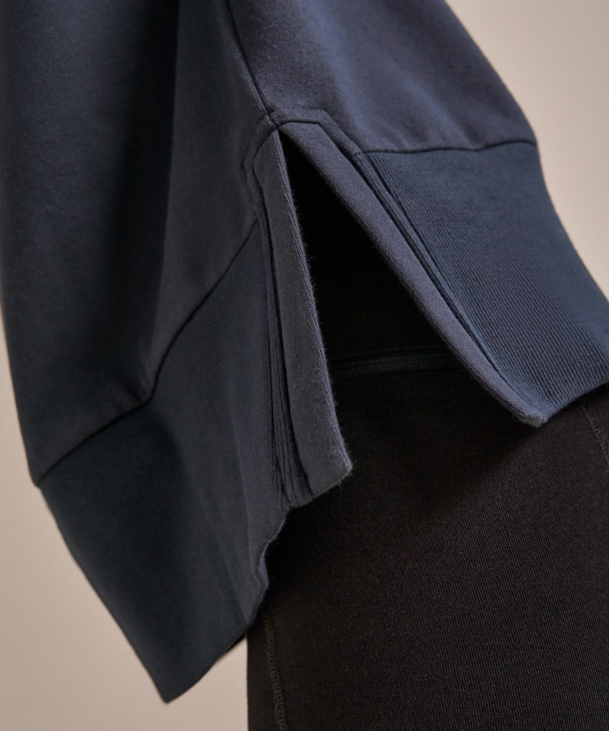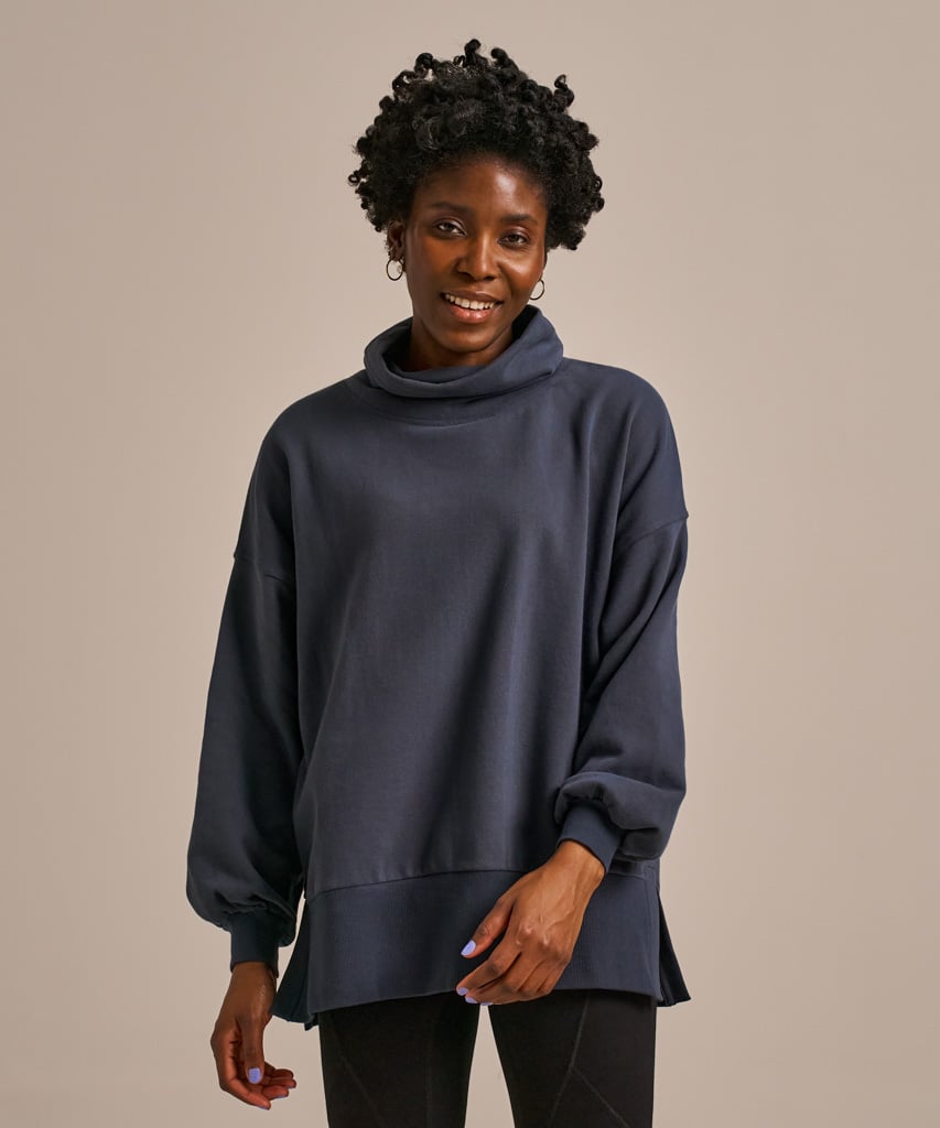 The Funnel Sweat is cut with a relaxed, oversized shape featuring a funnel neck, side splits for ease, and generously billowed sleeves that taper to the cuff. This thoughtful design means it won’t cling at the hips, and offers plenty of room for movement while still feeling structured and flattering.