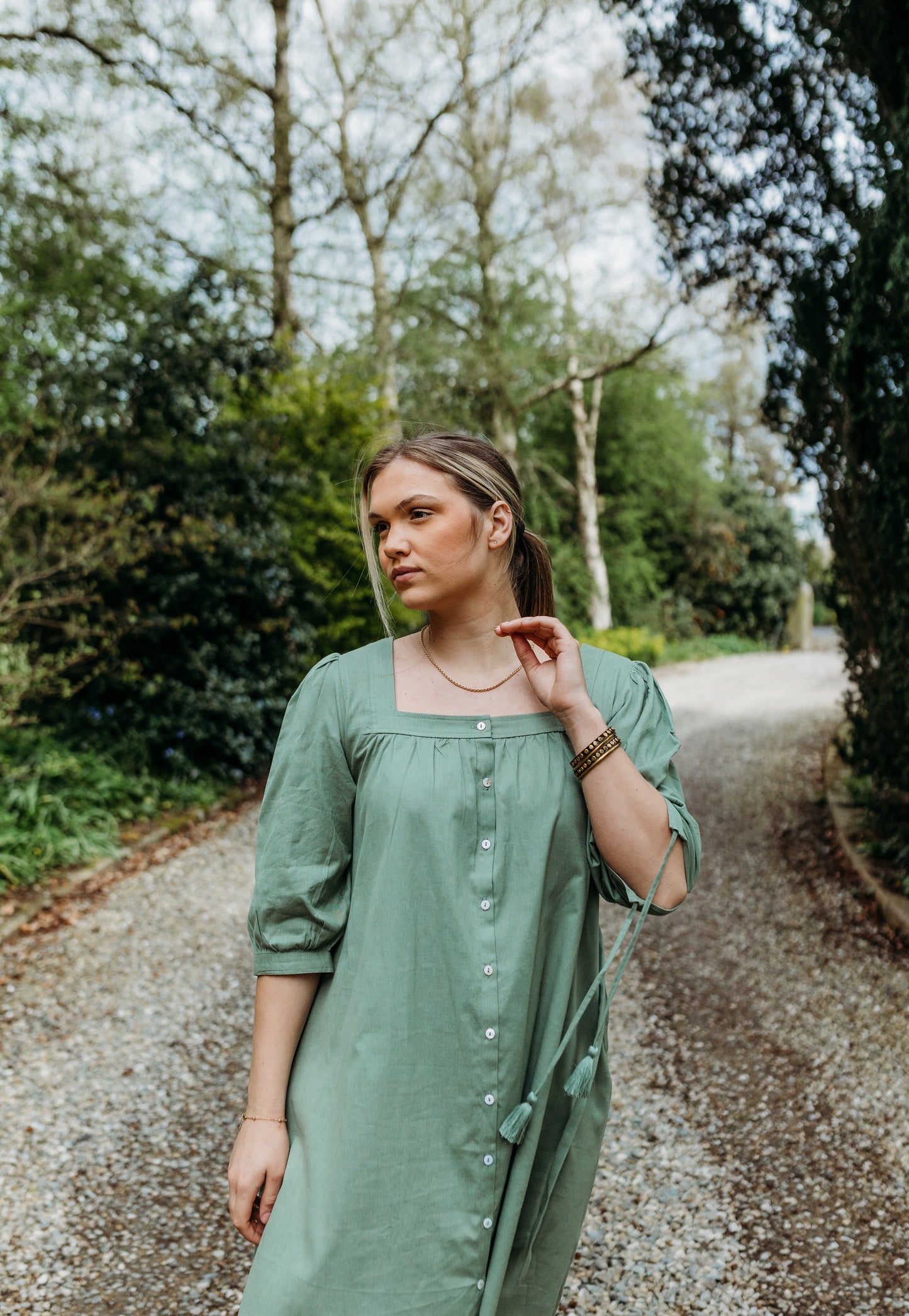If you find it a little too long, you can safety pin the shoulders up a notch allowing you to get the perfect knee length for the winter months and still lets you notch it down come the summer months. Square neck is the main feature with blouson sleeves finished with removable tassels. It also has a little pop button to clip to your bra so keep it in place and feeling snug for ease throughout the day!