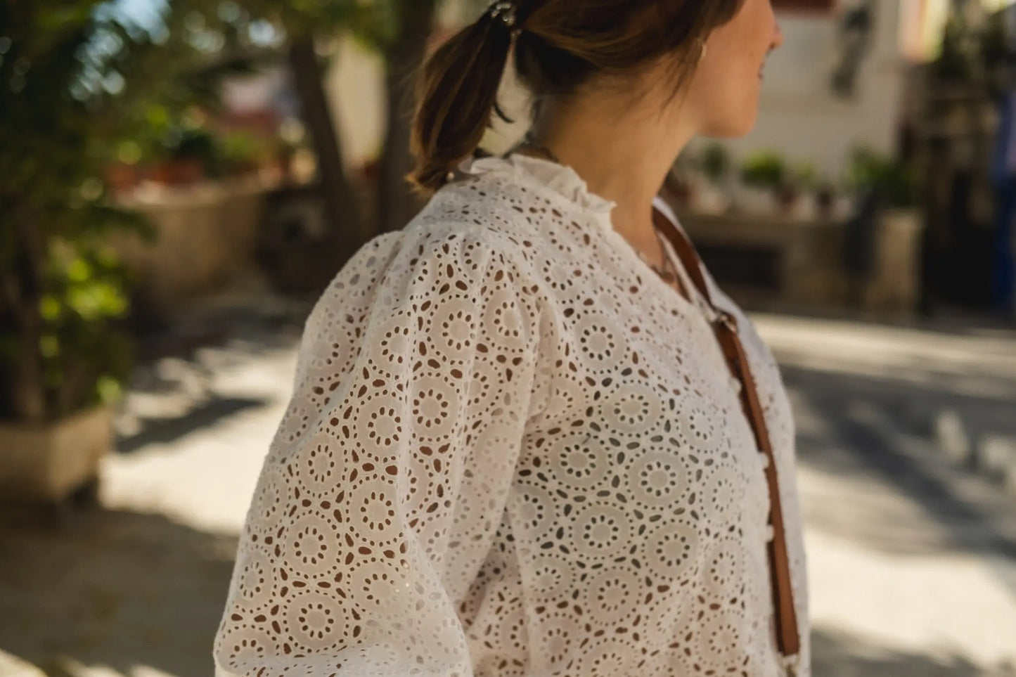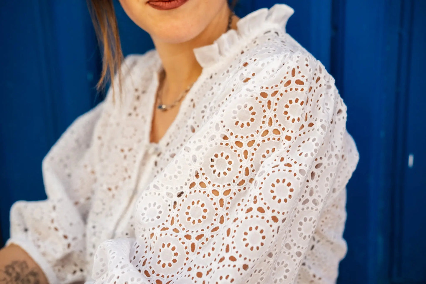 Imagine this exquisite cotton top, crafted in pure broderie anglaise, as your quintessential French-inspired piece. With its refined ruffle trim neckline, graceful balloon sleeves, and a flattering straight-cut hem, it embodies effortless elegance and timeless style.