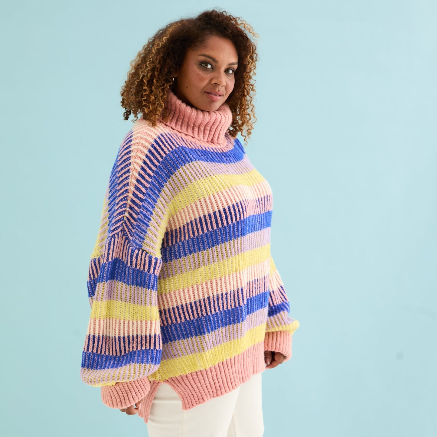 Tasha in pink is bright knitwear at its sweetest. The roll neck keeps you snug, the stripes bring playful charm and the oversized fit makes her an instant go-to. Perfect for easy winter outfits, cosy autumn layering or as a holiday knit gift for someone who loves colour.