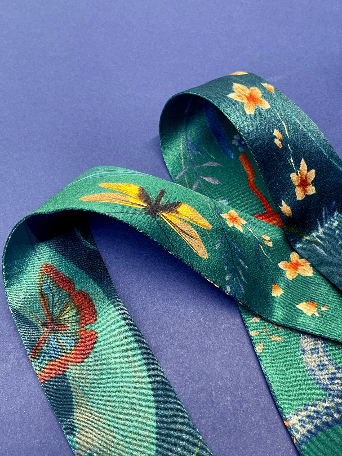 Teal Silk satin 'Morpho' Ultra Skinny silk scarf with butterflies and flowers