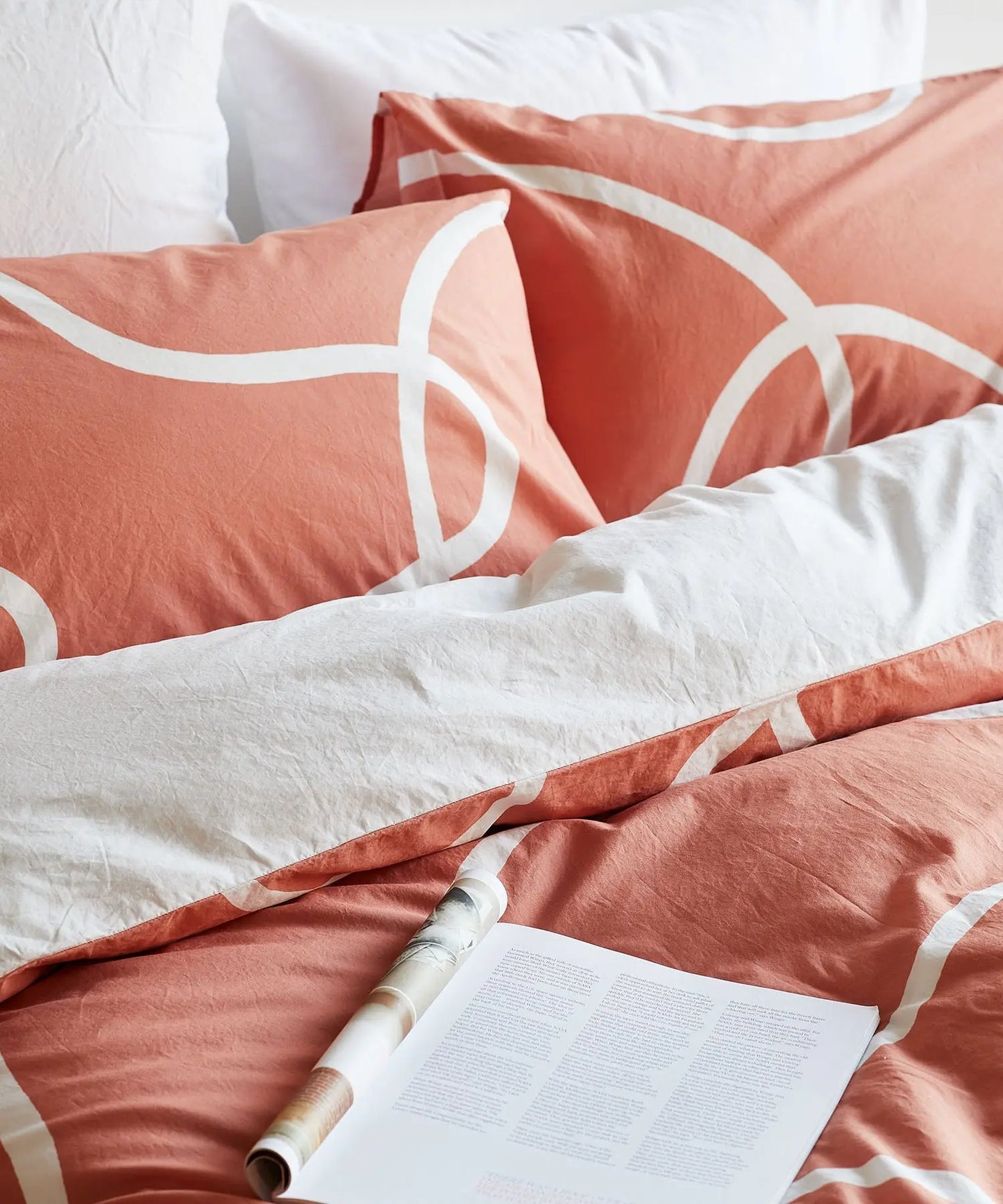 Terracotta and white printed pillowcase made from 100% organic cotton.