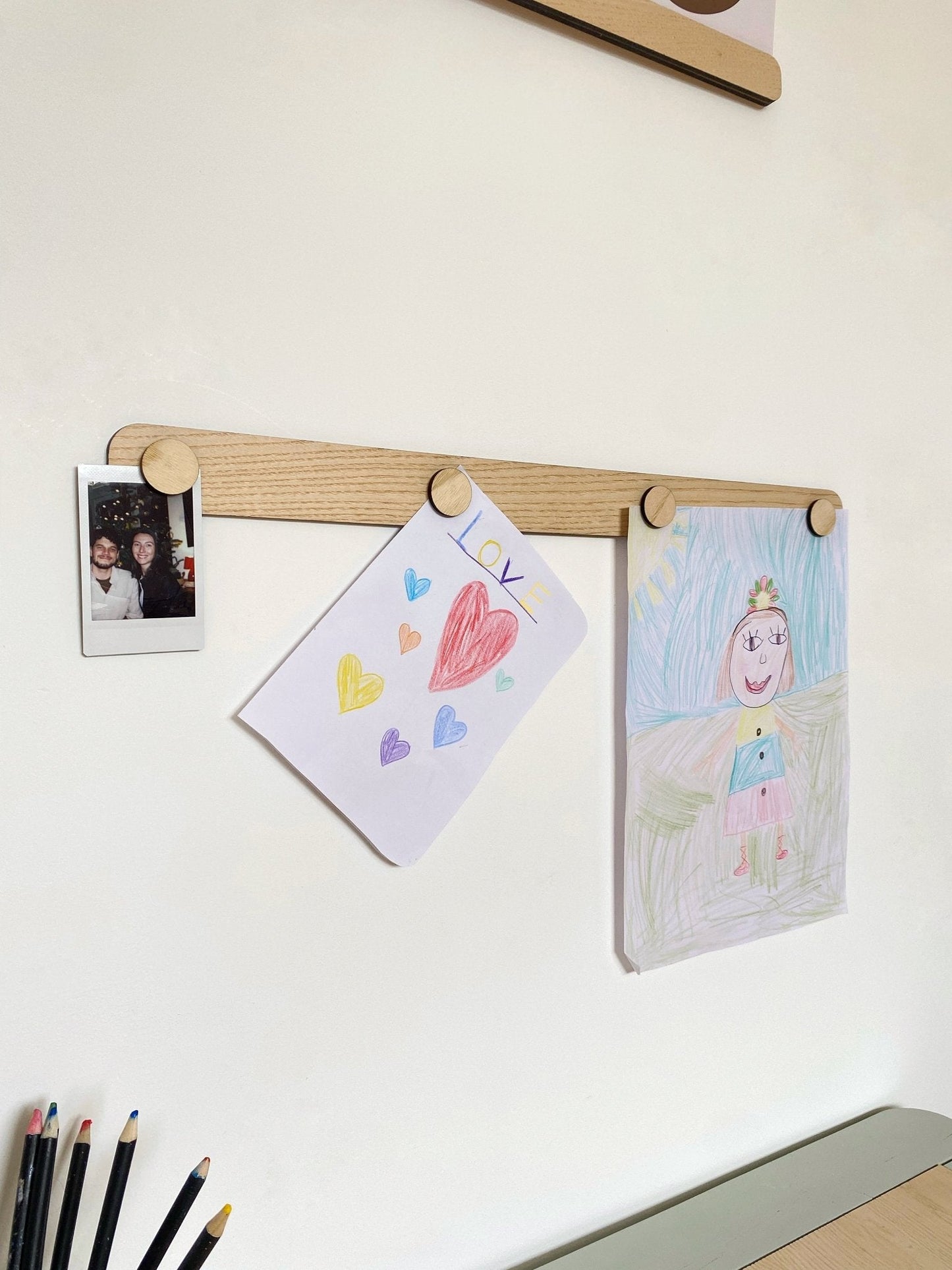 Because the bar is front-facing and magnetic, children can easily attach and swap their artwork. Its slim, lightweight form means it fits beautifully in bedrooms, play corners, and reading nooks without dominating the wall. The 10 embedded magnets ensure each piece sits flat and secure — or really fill up the bar with their artwork, with optional extra dots to keep the gallery growing.