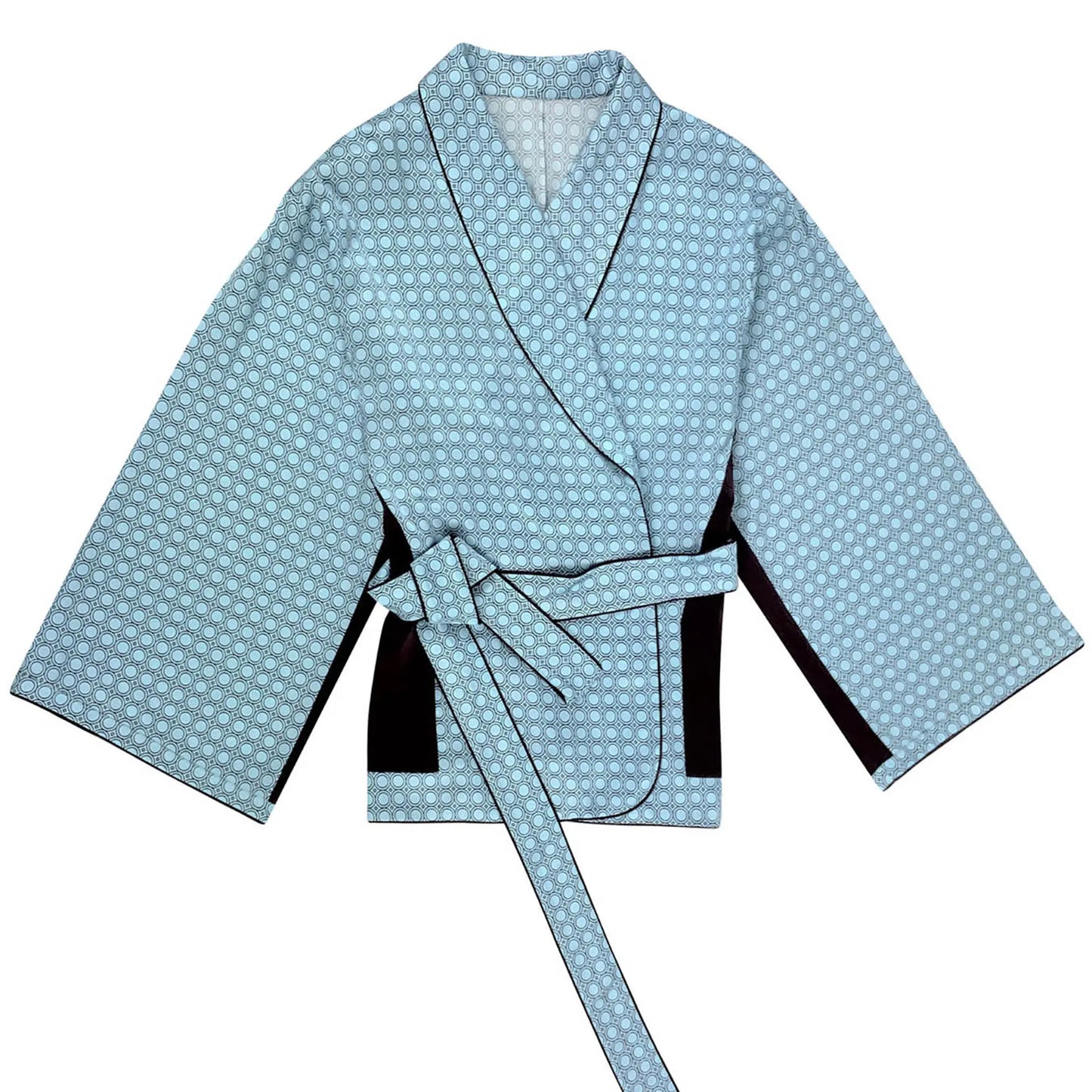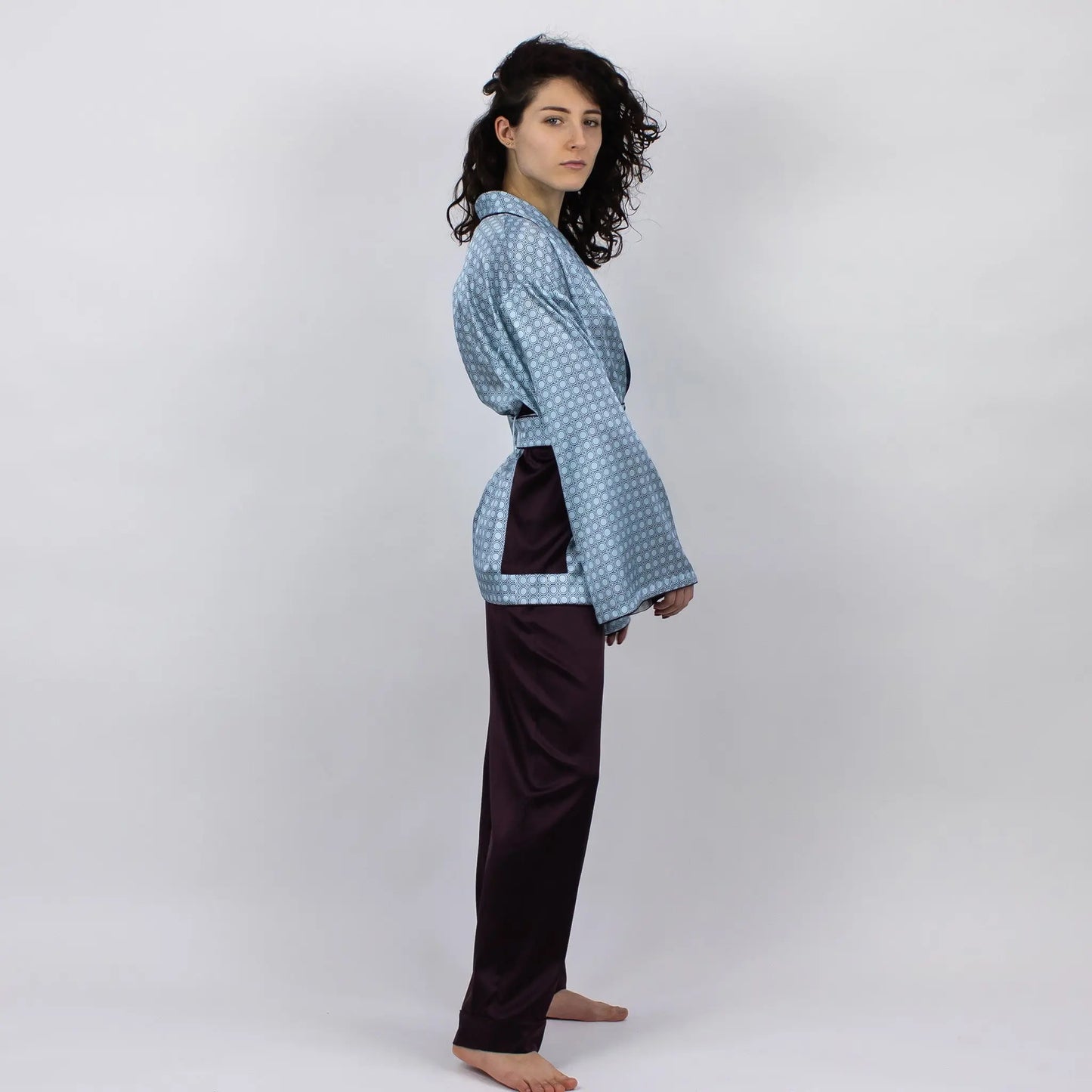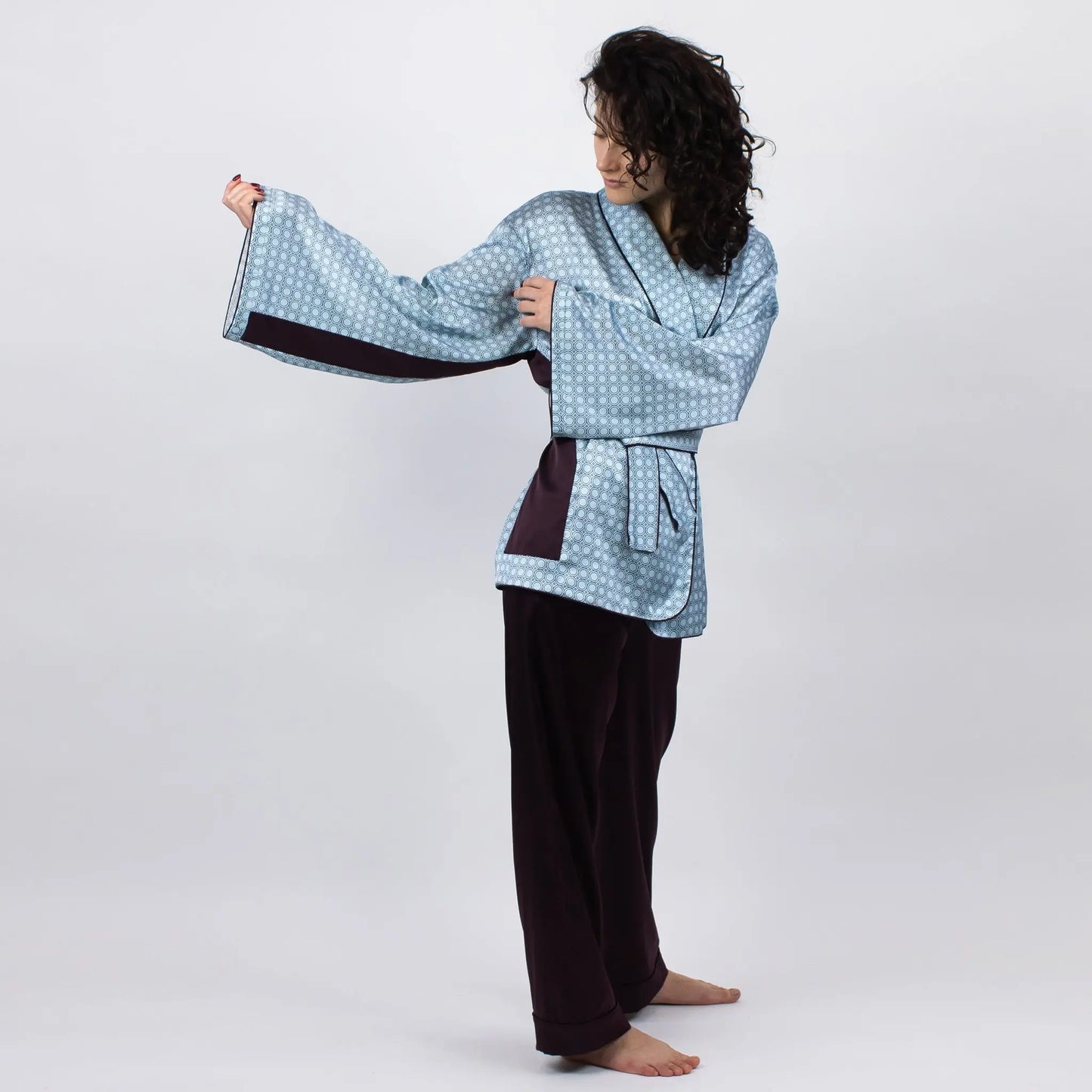 The Lady kimono from NOKAYA is crafted from 19 momme Mulberry silk in a sky-blue hue and features a stylish graphic print.
